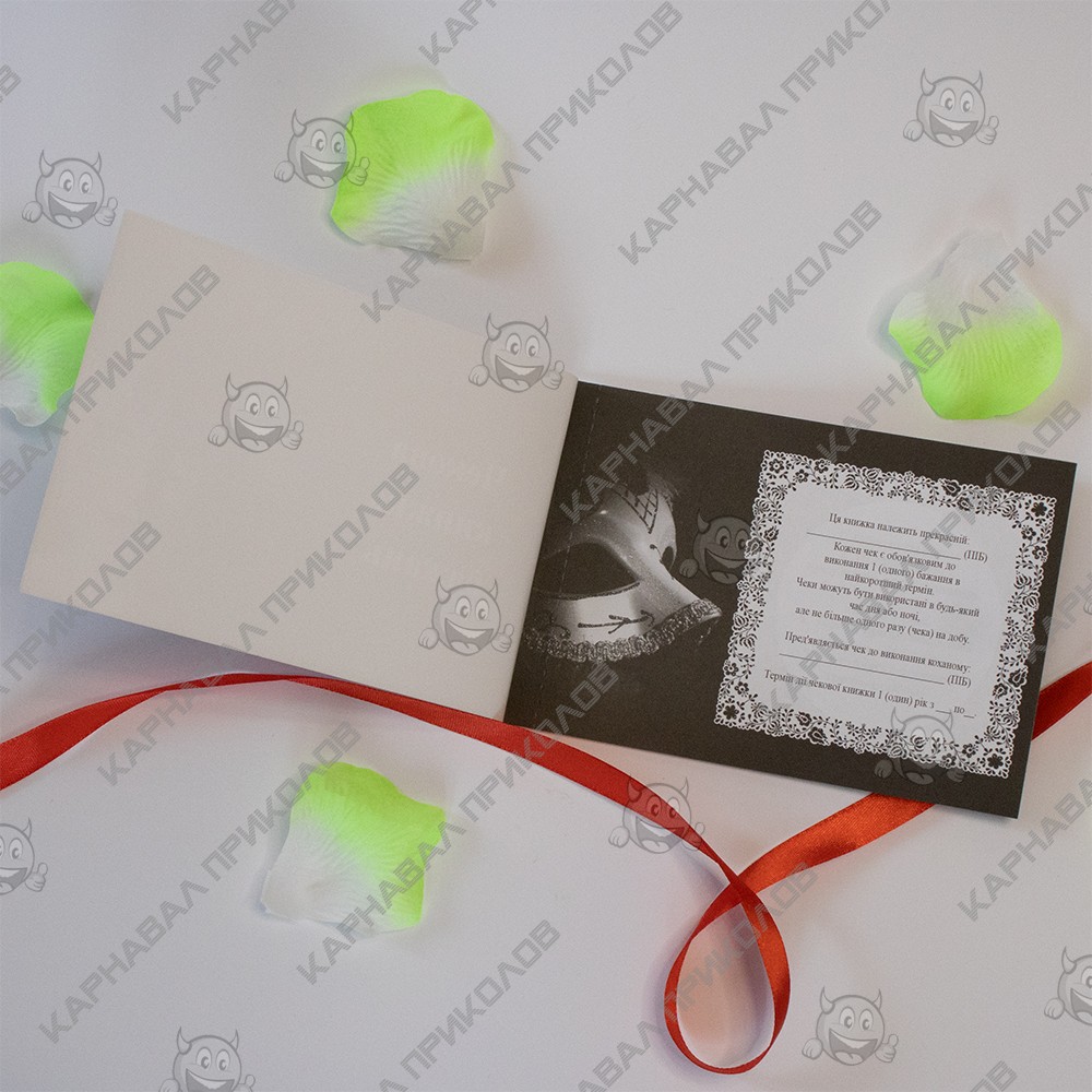 Чековая Книжка Желаний оттенки серого – самый дорогой подарок, так как Вы дарите самые бесценные вещи Любовь и Внимание. Это прекрасный и незабываемый подарок на любой праздник для Вашей половинки. С подарком Чековая книжка желаний Вы обязуетесь выполнить 15 простых, но в тоже время очень приятных квестов или желаний вашей девушки в установленный период. Книжка состоит из 16 страниц, странички с подробной инструкцией по использованию и 15 дизайнерских купонов с желаниями все на русском языке. Например – день любви и ласки, Хочу.., ролеве игры и многие другие. Ваша любимая выбирает купон с желанием, а Вы должны его выполнить. В дополнение чековой книжке Вы можете приобрести сладкий сюприз и оригинальный подарок 100 и Одна Причина в нашем интернет магазине Карнавал Приколов. Купив Чековая книжка желаний вы получаете не только качественный товар, а и 100% позитивных впечатлений от приобретения.