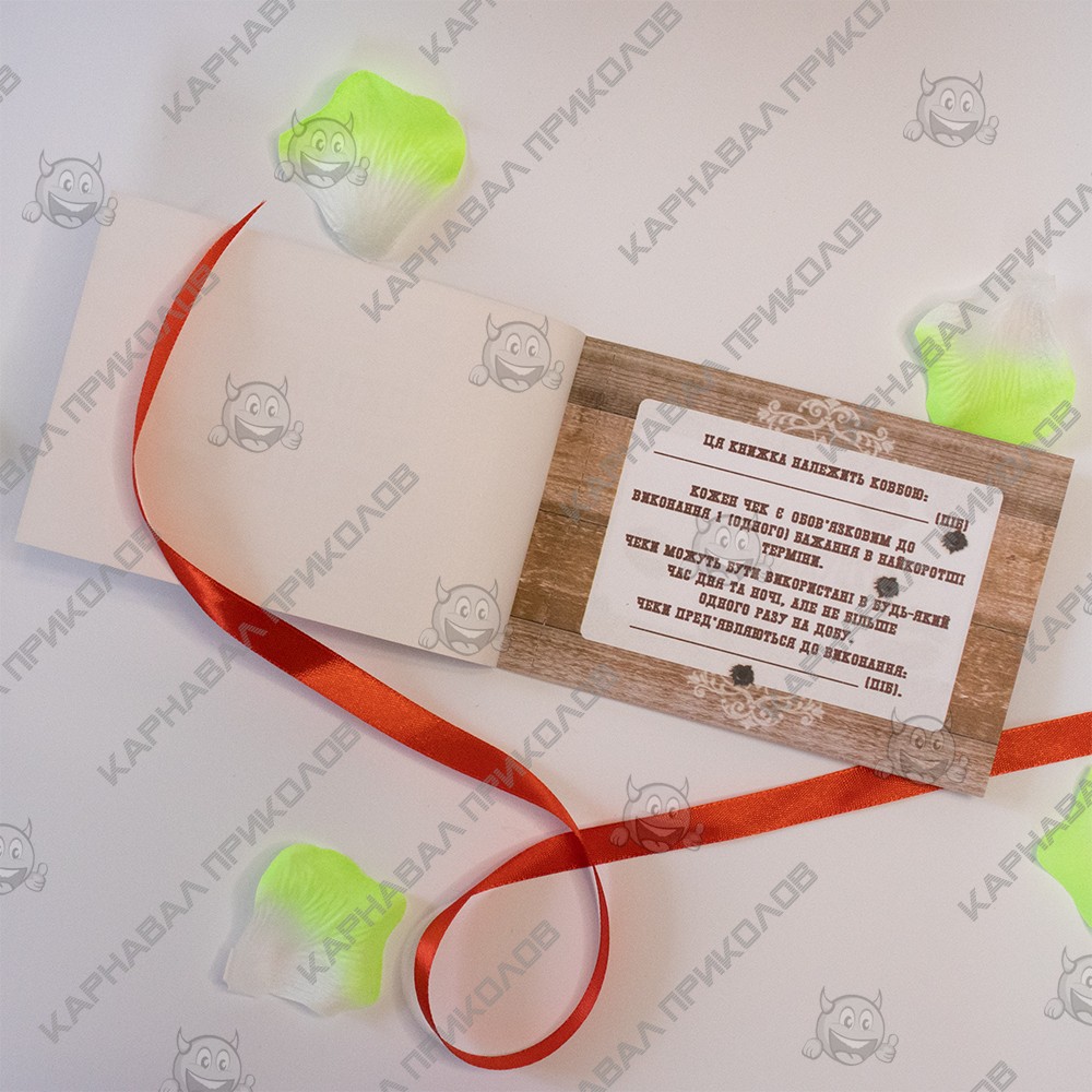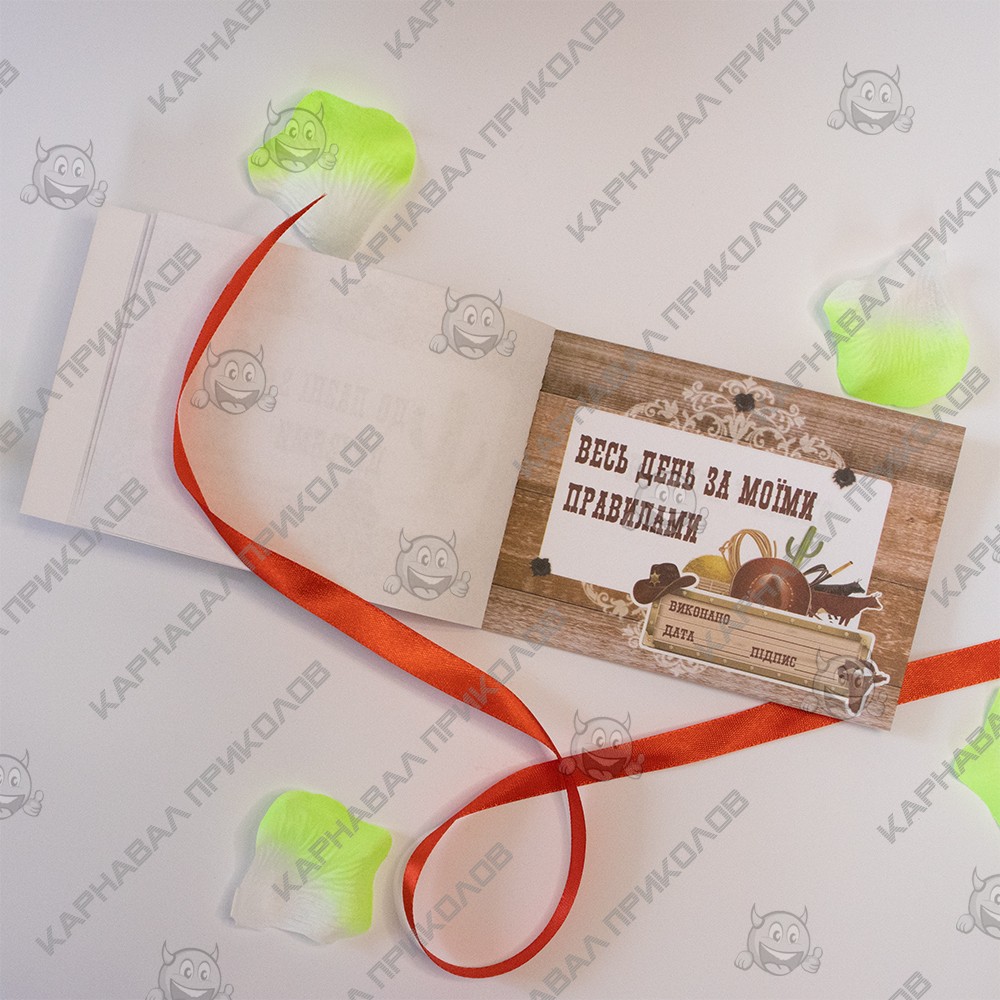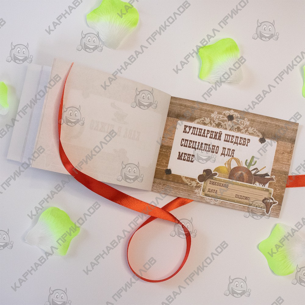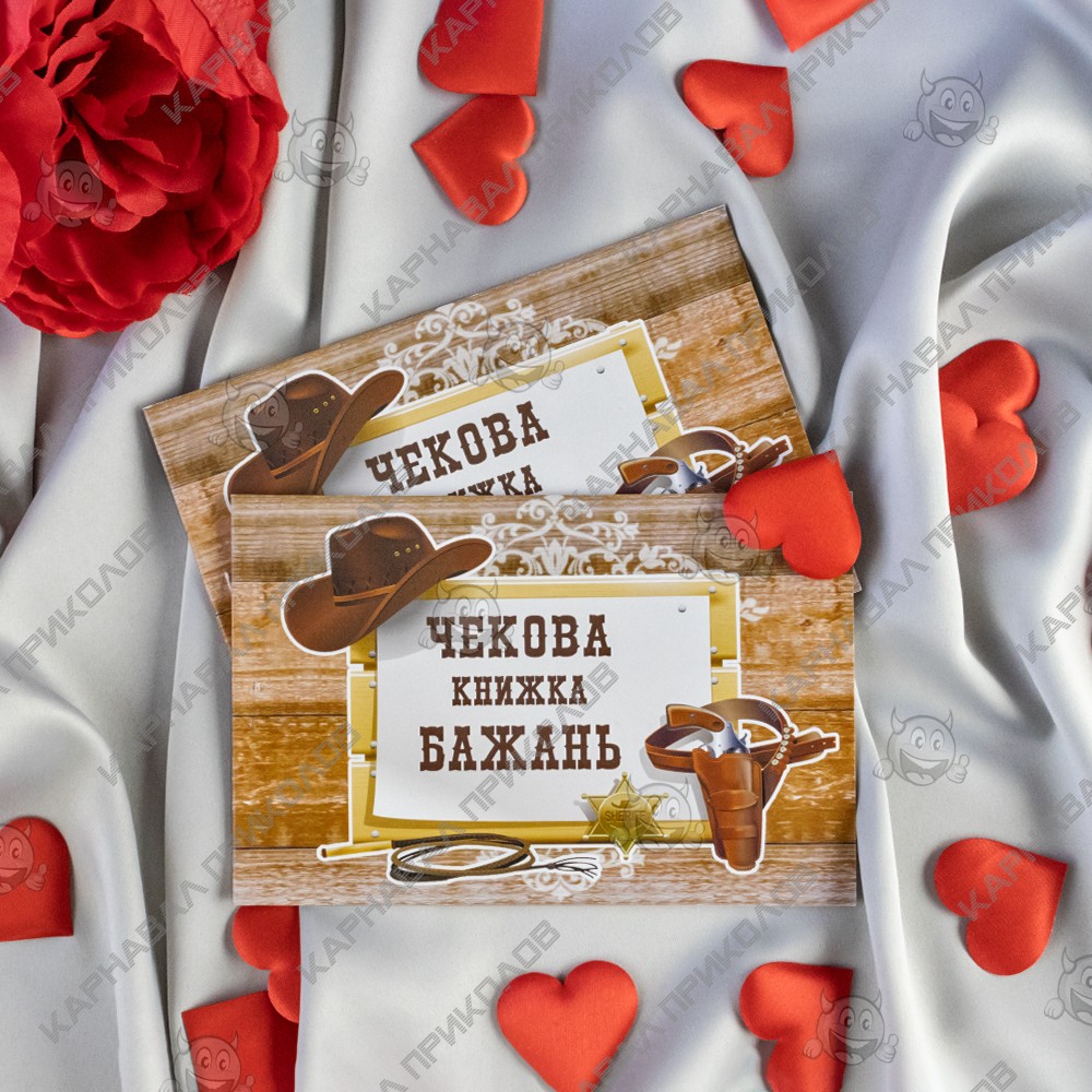 Чековая Книжка Желаний WESTERN – самый дорогой подарок, так как Вы дарите самые бесценные вещи Любовь и Внимание. Это прекрасный и незабываемый подарок на любой праздник для Вашей половинки. С подарком Чековая книжка желаний WESTERN (укр.) Вы обязуетесь выполнить 15 простых, но в тоже время очень приятных квестов или желаний вашего парня в установленный период. Книжка состоит из 16 страниц, странички с подробной инструкцией по использованию и 15 дизайнерских купонов с желаниями все на русском языке. Например – завтрак в постель, весь день по моим правилам, эротический массаж и многие другие. Ваш любимый выбирает купон с желанием, а Вы должны его выполнить. В дополнение чековой книжке Вы можете приобрести сладкий сюприз и оригинальный подарок 100 и Одна Причина в нашем интернет магазине Карнавал Приколов. Купив Чековая книжка желаний WESTERN (укр.) вы получаете не только качественный товар, а и 100% позитивных впечатлений от приобретения.