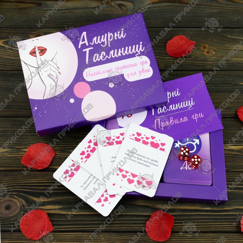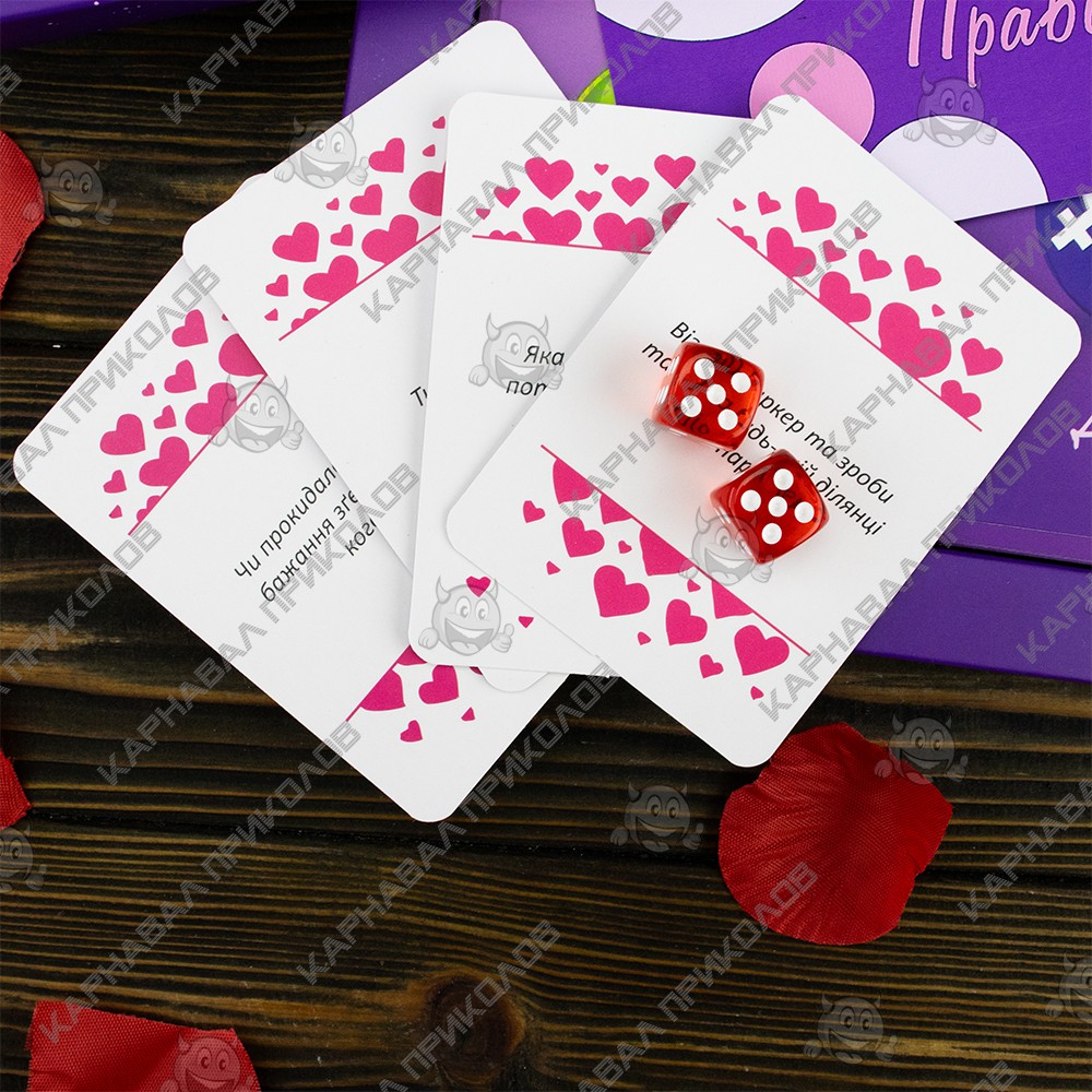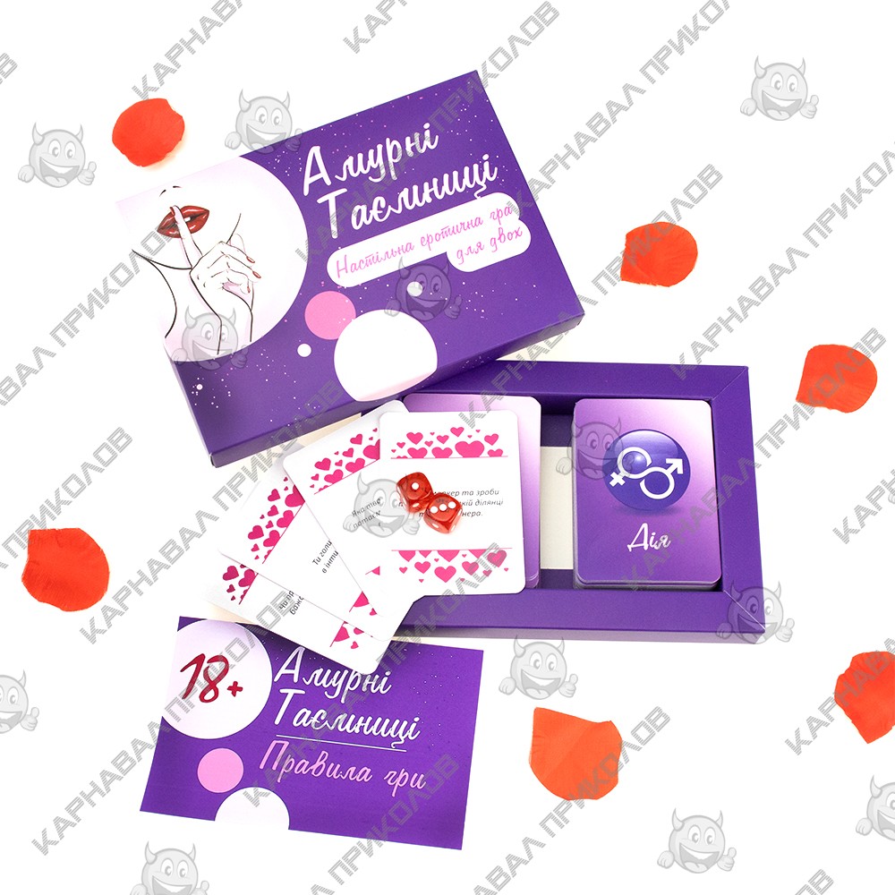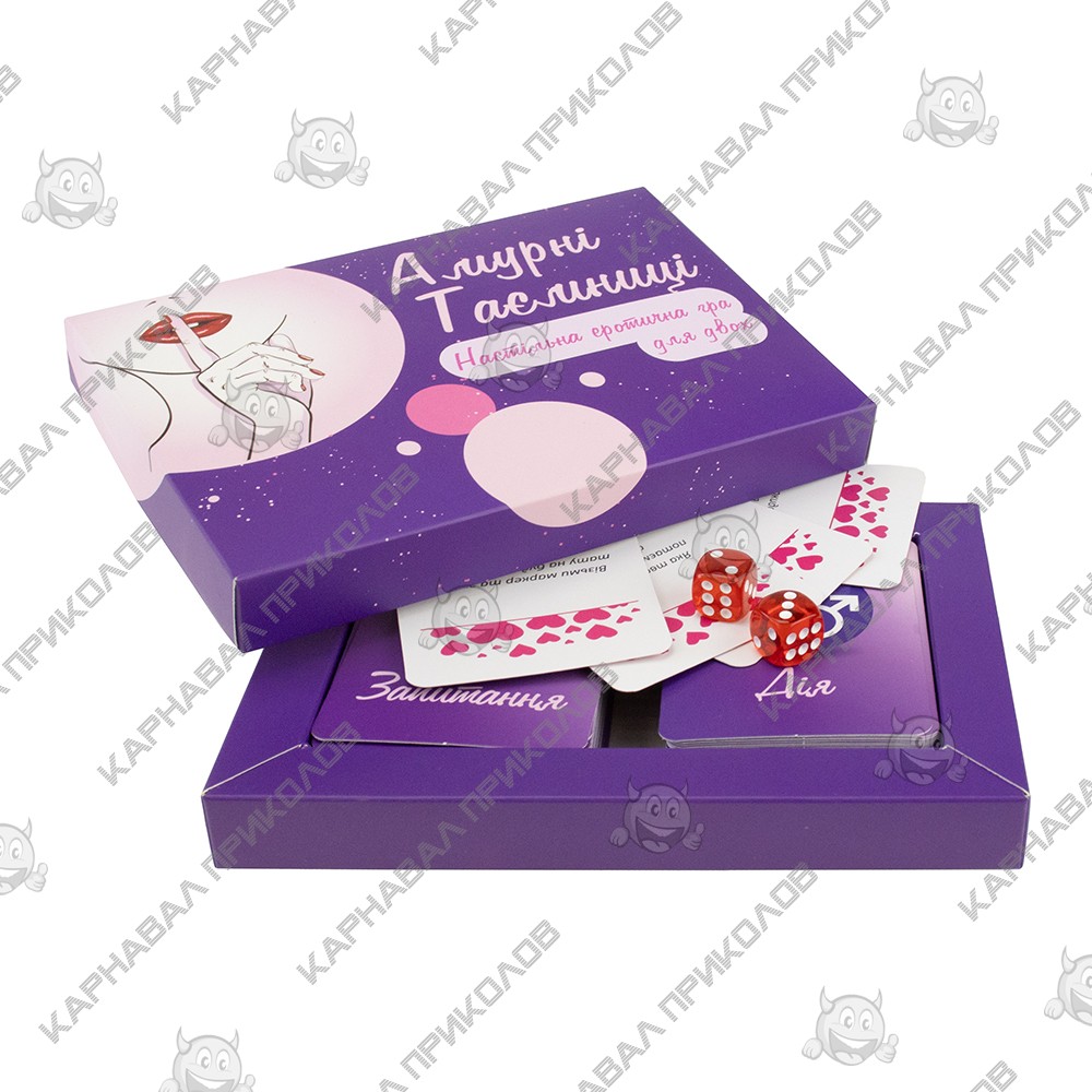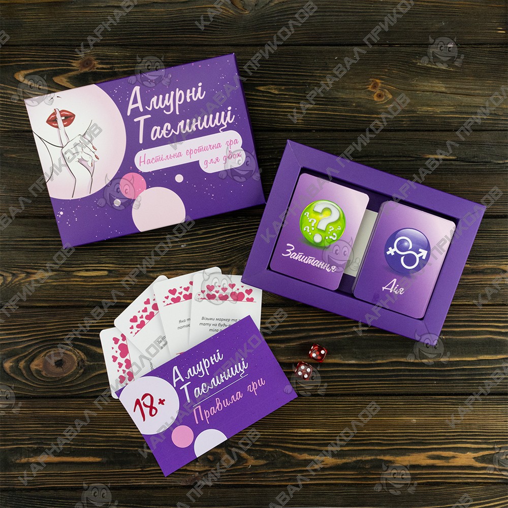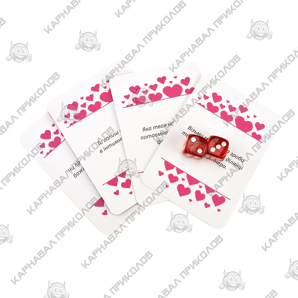 Часто ли Вы вносите в свои интимные отношение со своей второй половинкой что-нибудь новое? Стали замечать, что в Ваших отношениях начала пропадать искра? Не стоит сразу впадать в панику, Вам просто надо чем-нибудь разбавить Ваши отношения. Именно для этого и предназначен этот эротический набор. Такая настольная эротическая игра для двоих поможет Вам испытать новые эмоции и снова почувствовать те прекрасные чувства к своей второй половинки. Вы уже пробовали во всех местах квартиры и не знаете где и как заняться этим занятием? Просто поиграйте вечером в эту игру. Принцип игры прост. Эта игра состоит из ДЕЙСТВИЙ и ВОПРОСОВ. Вам надо разложить карточки в хаотичном порядке квадратом 6х6, далее по очереди кидайте кубики. Вам выпадет два числа это номер строки и столбца соответственно являются координатами карточки на поле, задание которой Вам необходимо исполнить. В игре имеется по 50 карточек двух видов. Текст карточек написан на русском языке. Поверьте, после первых нескольких карточек Вы уже не сможете остановиться, это настолько захватывающая игра, что Вам захочется играть снова и снова. Самое главное, Вам нужно будет довериться своему партнеру, и говорить чистую правду, какой бы она не была. И не стоит стесняться, ведь чем вопрос интимнее, тем лучше Вы узнаете своего партнера. Вы должны говорить правду, потому что от этого будет зависеть Ваши отношения. Ответы должны быть развернутыми, Да и Нет не подходит, Вы должны объяснить Ваш ответ. Конечно же, если какие-то вопросы Вам не приемлемы, или в Ваших отношениях это еще рано делать, то Вы можете заменить их, или просто отложить на будущее. Главное помнить, что эта игра направлена на то, чтобы разнообразить и улучшить интимную жизнь. В неё стоит играть с человеком, которому Вы доверяете целиком и полностью, тогда эта игра будет иметь смысл. Не стесняйтесь своих желаний и прихотей, мы для того и создали эту игру, чтобы Вы могли воплотить все свои заветные и коварные желания в жизнь со своей второй половинкой. Самое главное, играйте в эту игру с удовольствием и хорошим настроением.