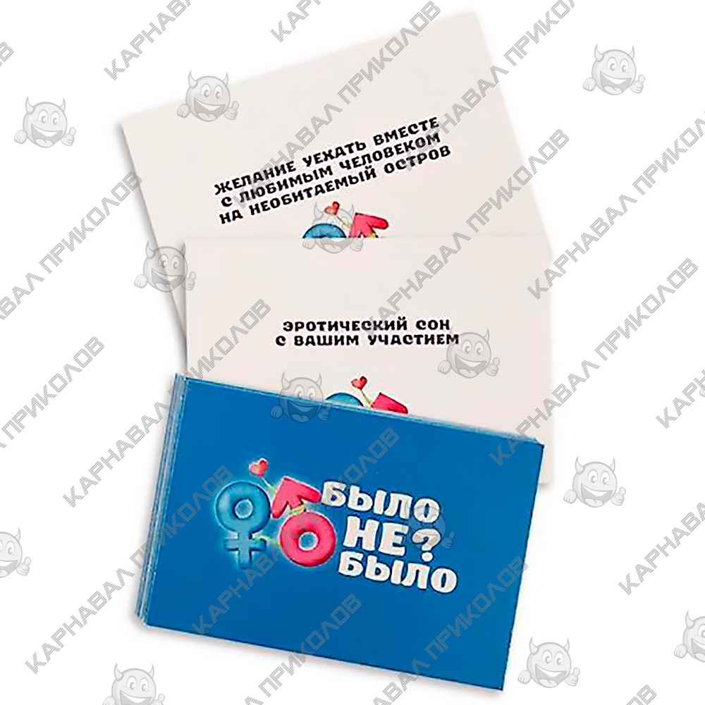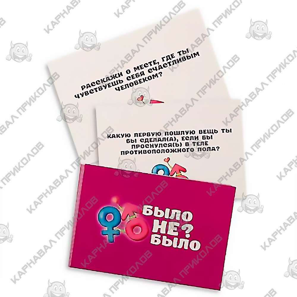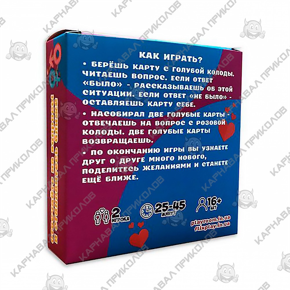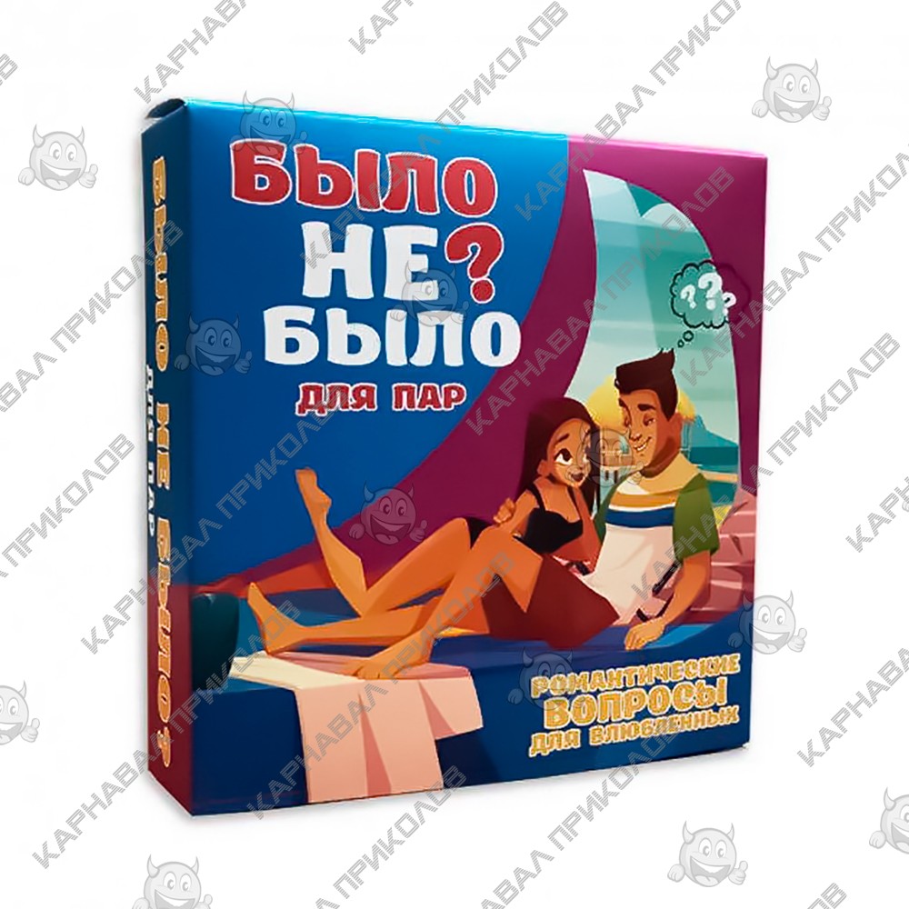 Ищете незабываемый вечер с любимым человеком? Устали от банальных свиданий? Погрузитесь в мир романтики и веселья с настольной игрой "Было не было. Для пар"! Забудьте о штампах: 65 карточек с интригующими вопросами – от милых до пикантных. Ответы "было" или "не было" – начало для откровенных разговоров. Розовые карты – шанс поделиться сокровенными желаниями и фантазиями. 20-60 минут незабываемого досуга, полного смеха, откровений и близости. Сблизьтесь, узнайте друг друга лучше, дарите друг другу любовь и яркие эмоции! Первый, кто начинает игру, получает карту голубого цвета и читает вопросы. Если ответ был, нужно рассказать об этой ситуации. Если ответ "не был", игрок оставляет карту себе. В случае, если на руках у одного из участников есть 2 голубые карты, он должен отвечать на вопросы, размещенные на розовых картах, после чего 2 голубые карты возвращаются. 20-60 минут игры – и вы узнаете о своей половинке много нового! Было не было. Для пар – это оригинальный способ провести время вместе, шанс узнать друг друга с другой стороны, способ укрепить чувства и добавить страсти в отношения. Закажите игру в интернет-магазине Карнавал Приколов по выгодной цене! Отличный способ провести незабываемый вечер!