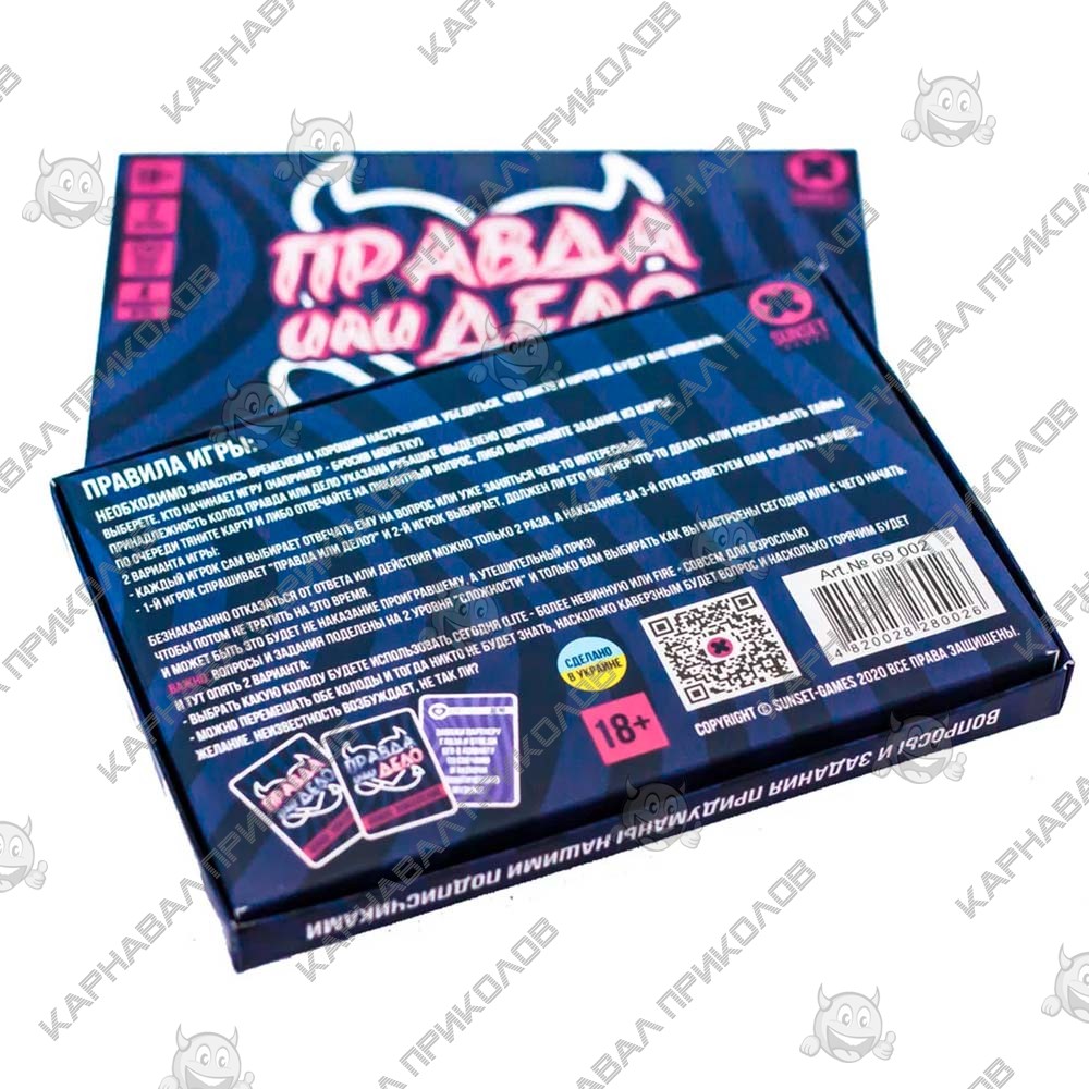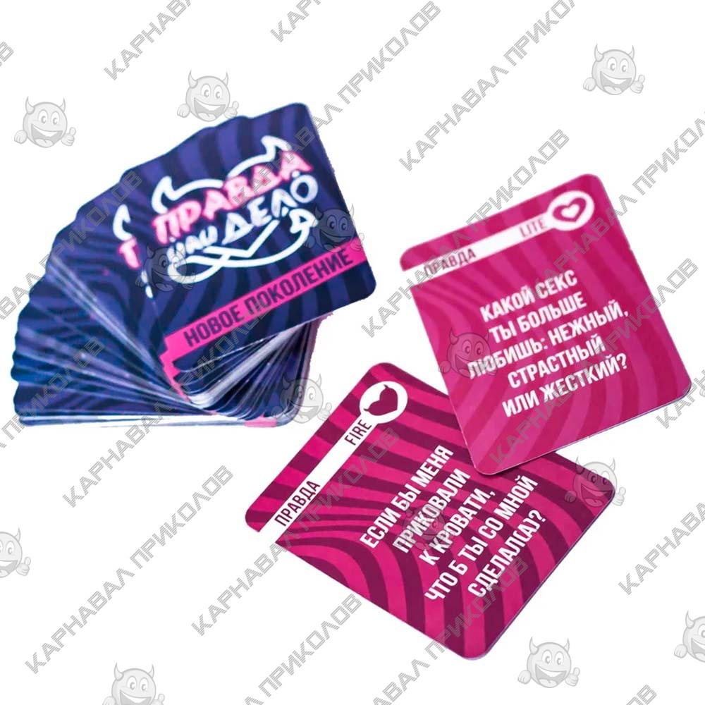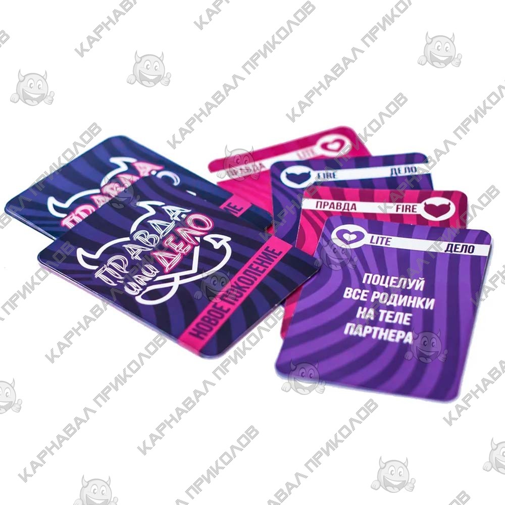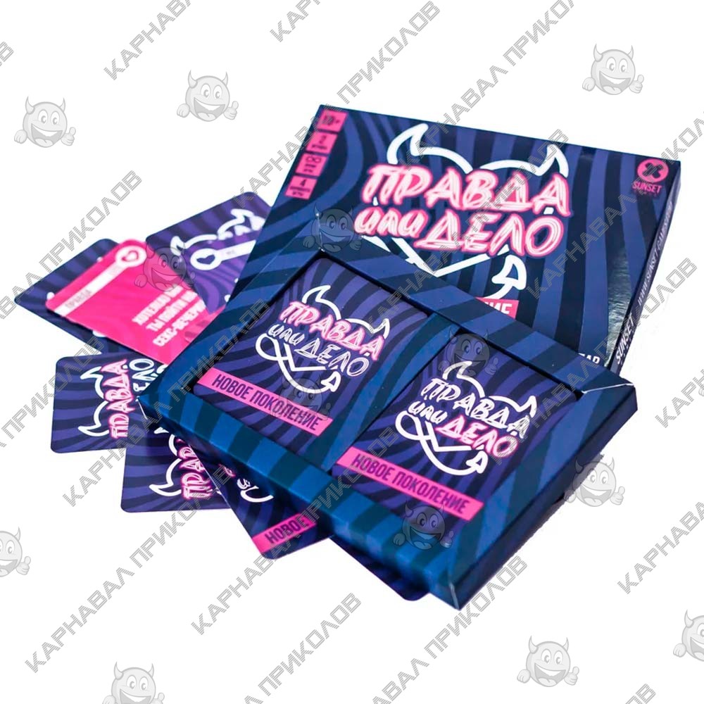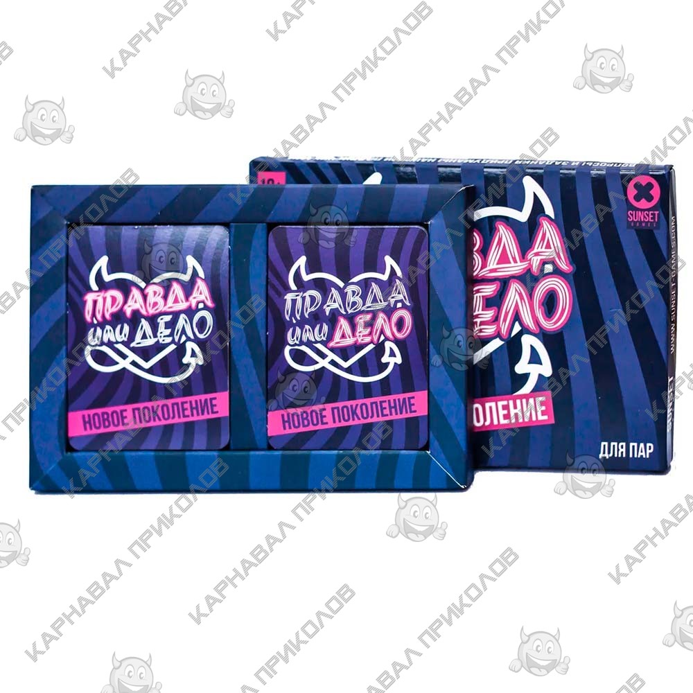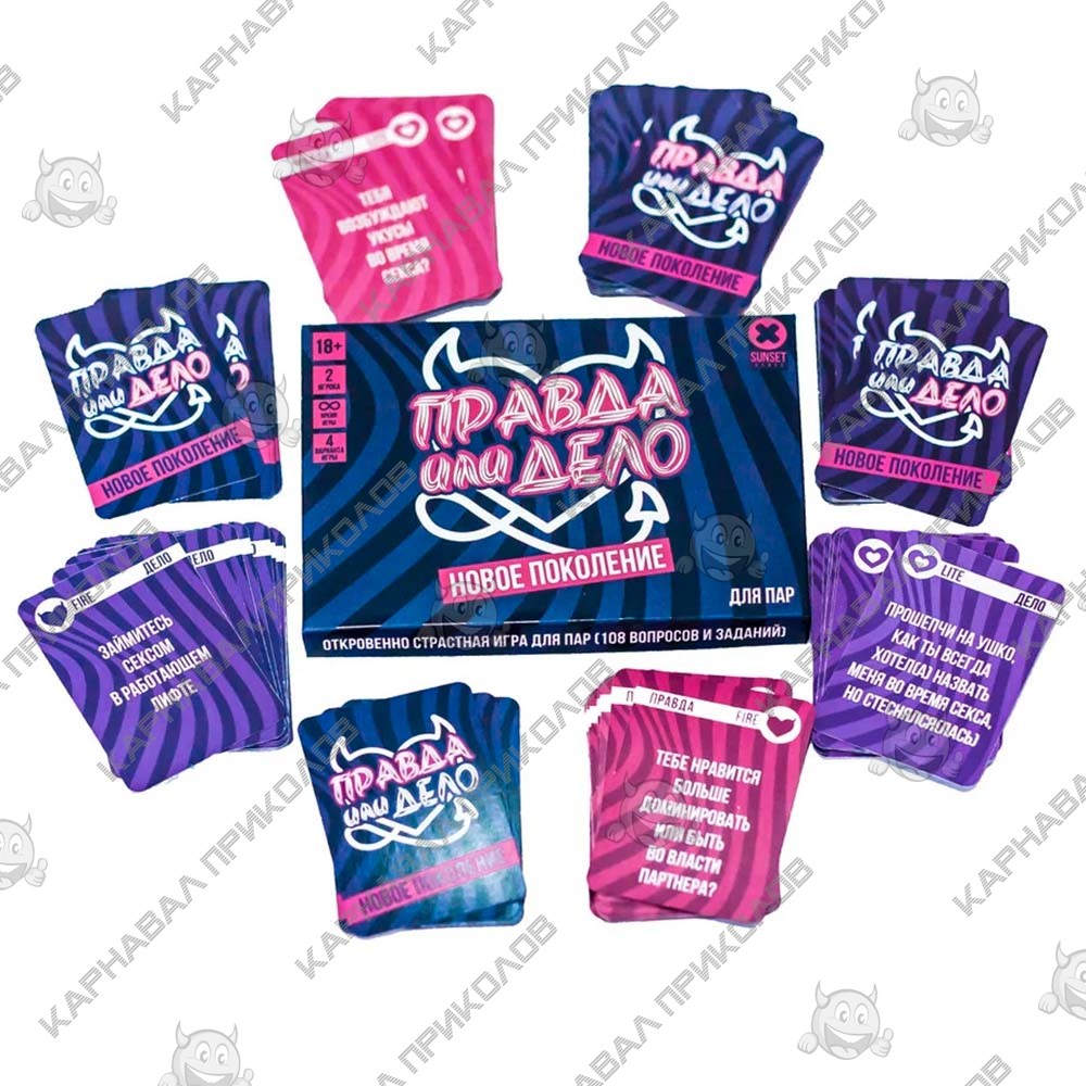 Романтическая игра для двоих 18+ Правда или дело: Новое поколение поможет вам узнать своего партнера как можно лучше, так и позволит вам провести незабываемый веселый вечер. Комплектация: 108 карточек двух уровней сложности, где уникальные 54 задания и 54 действия. Текст карточек на русском языке. Мешайте колоды кард и вытягивайте наугад все уровни сложностей, чтобы проверить, насколько вы готовы быть откровенны. Игра Правда или дело: Новое поколение не имеет ограничений по времени игры. Каждый раз Вы можете выбирать разные колоды и получать разные ответы и точно узнаете о своем партнере новые неожиданные вещи! Настольная эротическая игра 18+ позволит внести искру в отношения, повеселиться с друзьями и потрясающе провести время в любом кругу людей!