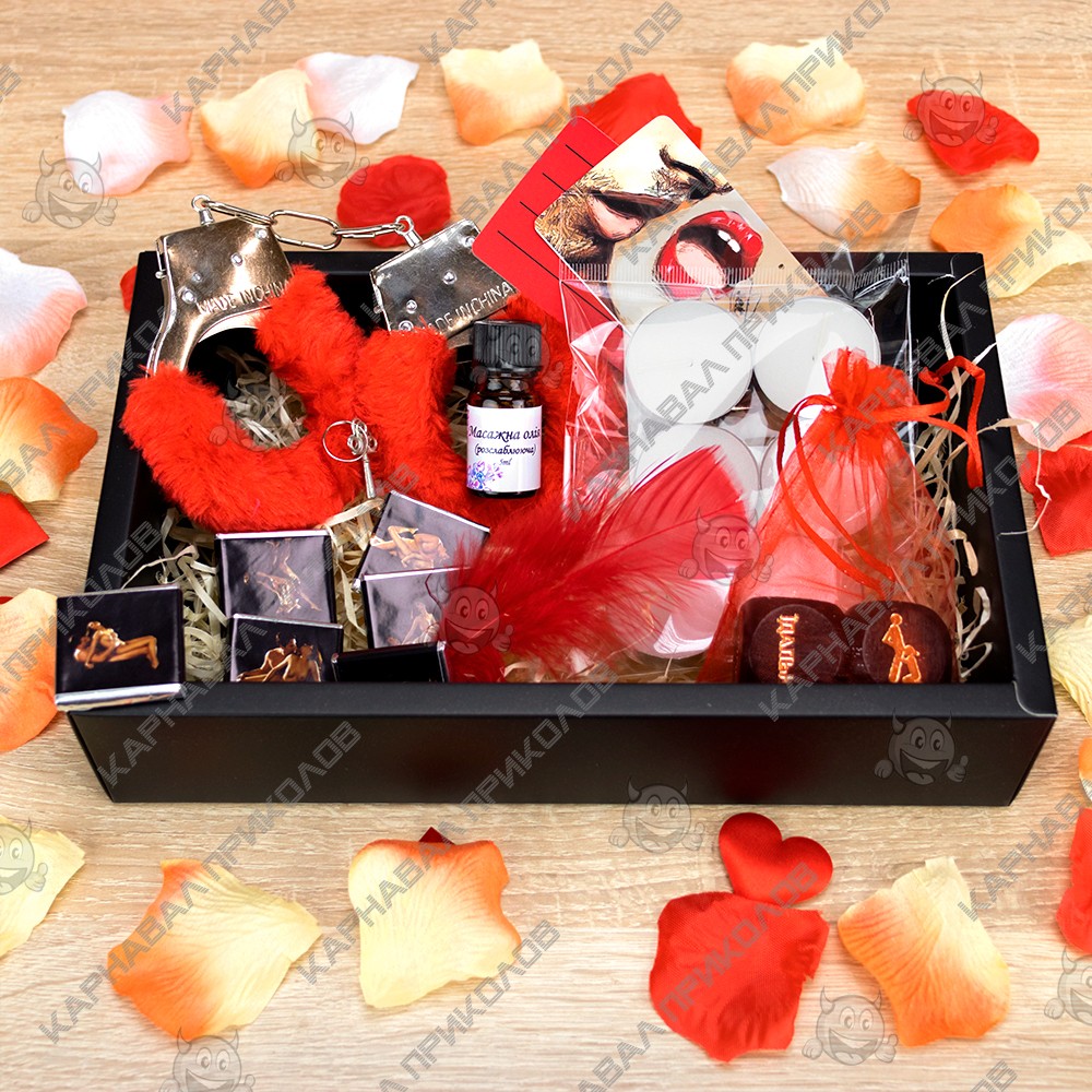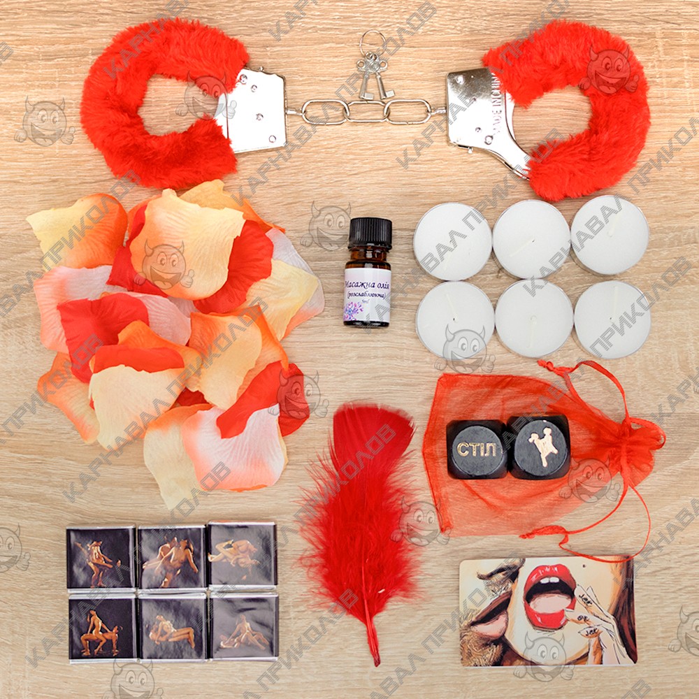 Комплектация: Декоративные лепестки роз, Кубики семейные Камасутра ЗОЛОТАЯ КОЛЛЕКЦИЯ 18+ (укр.), Масло массажное, Наручники меховые, Перышко, Свечи плавающие 6шт, мини-шоколадки Камасутра 6 шт |
