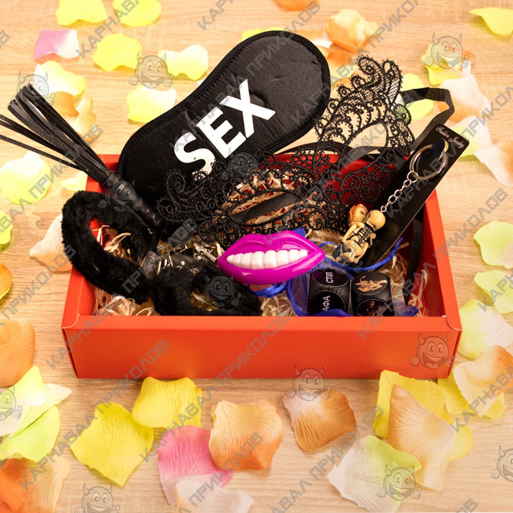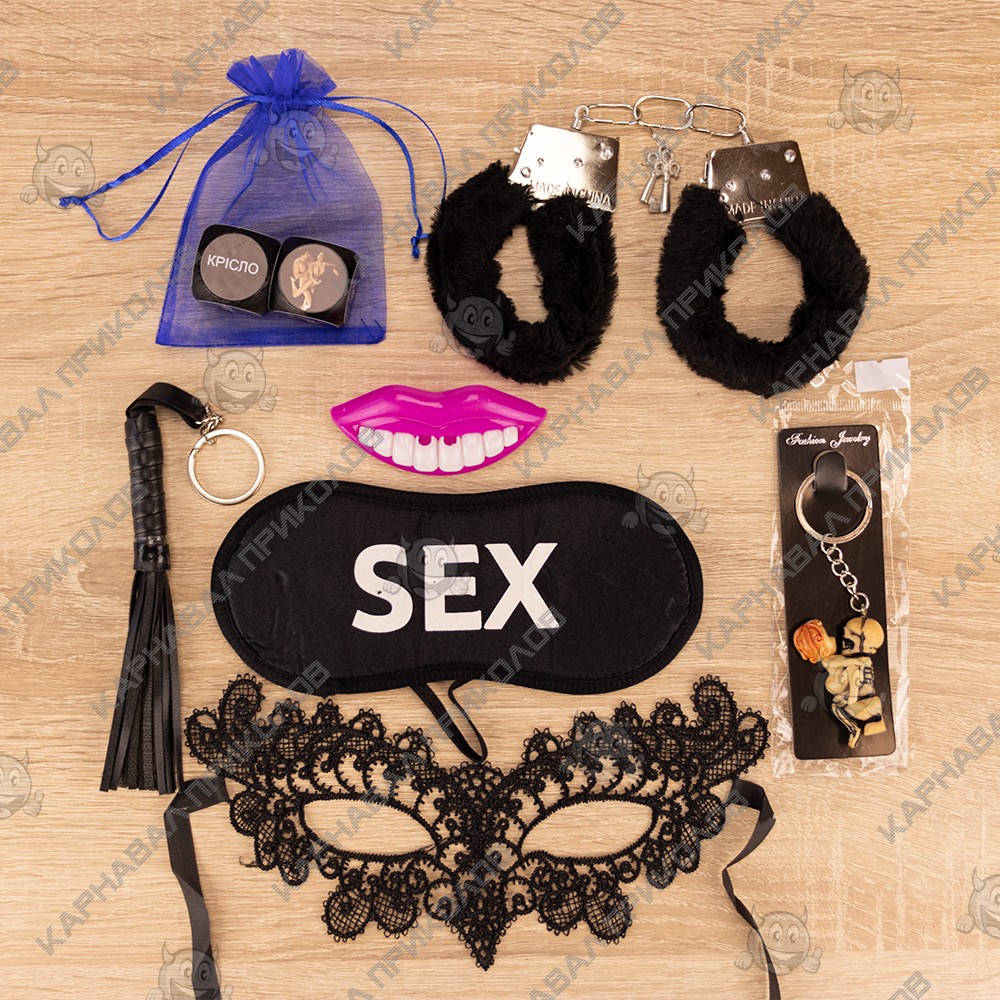 Комплектация: Декоративные лепестки роз, Маска для сна SEX, Кружевная маска, Кубики семейные Камасутра 18+ (черные) (укр.), Брелок Тыры-пыры 8004 18+, Наручники меховые, Плеточка, Свисток Губы |