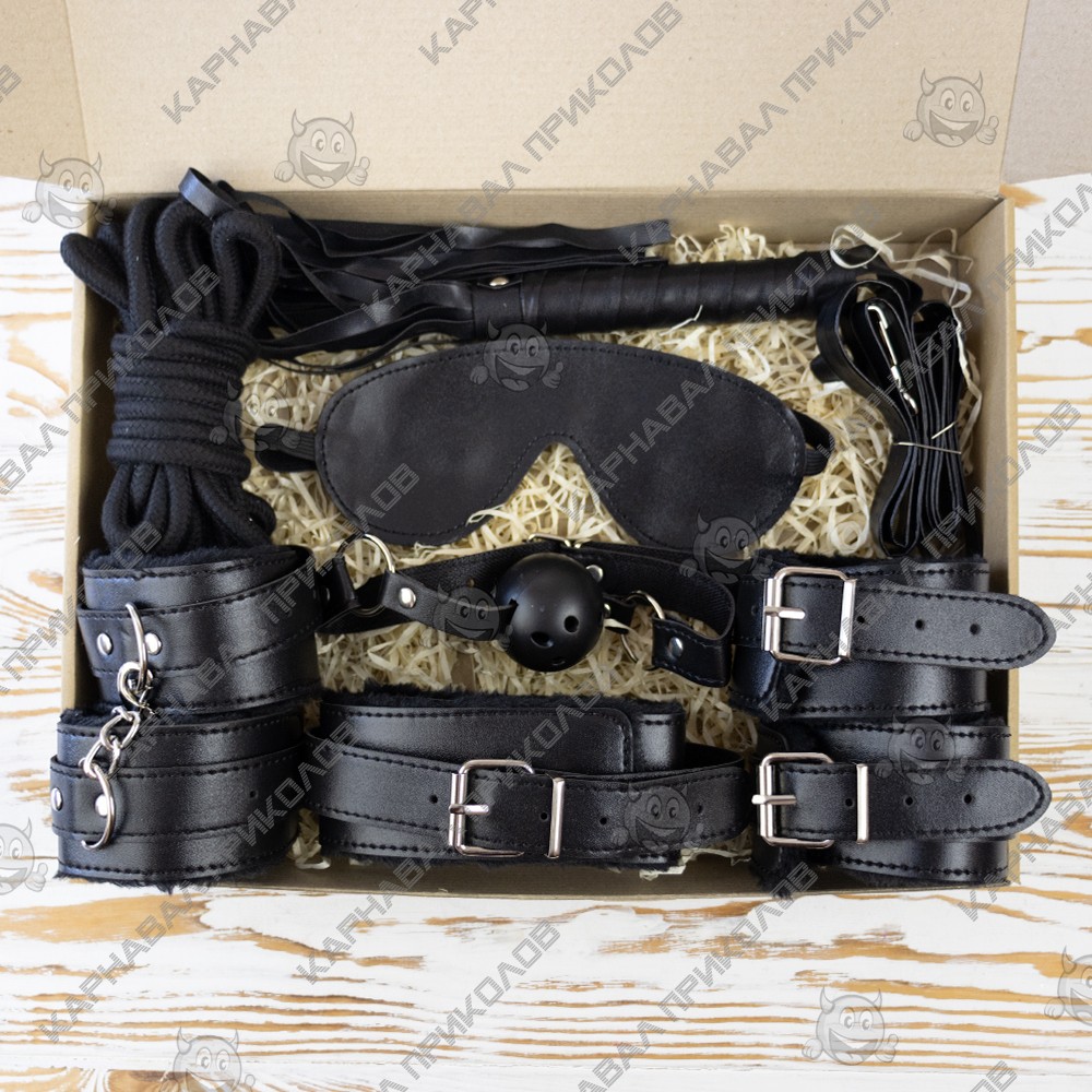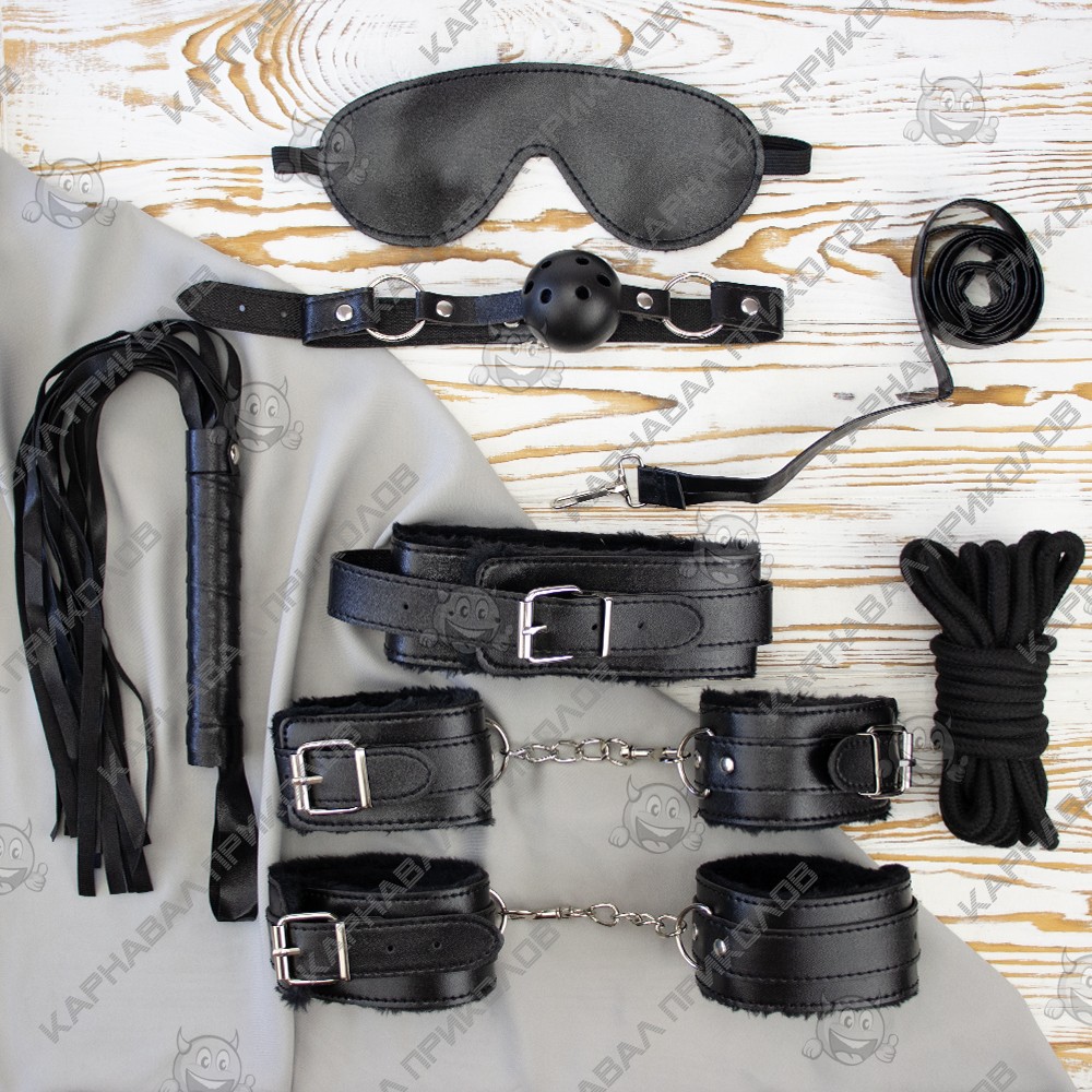 Комплектация набора: Кляп-шарик на регулируемом ремешке, наручники для рук - 2шт, наручники для ног - 2шт, ошейник, поводок, маска плетка, веревка для связывания. |