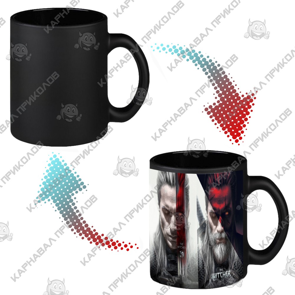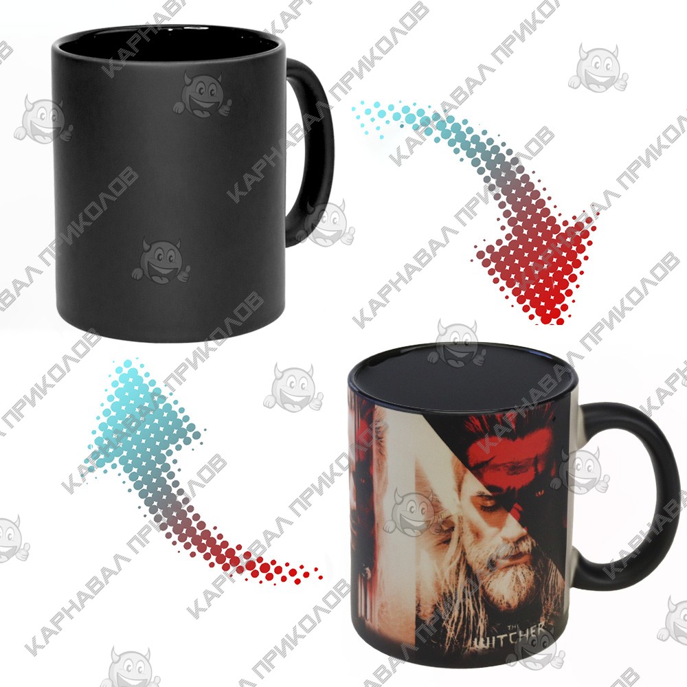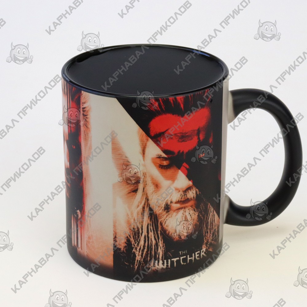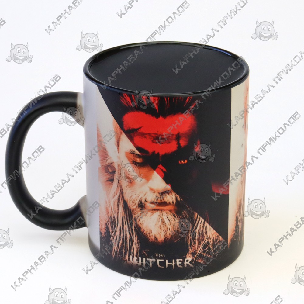Чашка хамелеон 66004 Ведьмак Геральт (черная) с виду обычная однотонная чашка, но если залить горячий напиток, как на ней появляется замысловатая картинка – персонаж цикла Ведьмак. Объем керамической чашки 350 мл, благодаря чему, Вы можете, целиком и полностью насладится любимым напитком. Ее можно купить как оригинальный и символический подарок любителю жанра фэнтези в знак внимания. А с этой чашкой, точно будет обеспечено основное внимание. Чашки собственного производства возможно под заказ любое количество. Широкий выбор чашек и кружек с оригинальным дизайном для любого повода Вы можете купить в интернет магазине Карнавал Приколов.