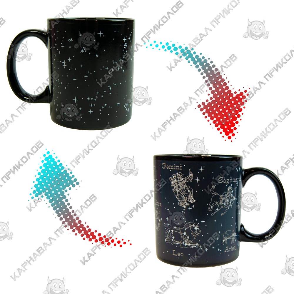 Как чарует красота звездного неба! И хочется смотреть, не отрывая взгляда, и стараться рассмотреть каждую звездочку по отдельности, а потом постараться охватить взглядом все звездное небо. Но, увы, на небе звезды видно не всегда, а на новой чашке Звездное небо из интернет-магазина Карнавал Приколов они будут на виду. Эту чашку можно считать одной из самых необыкновенных чашек, реагирующих на тепло. Когда она пустая, то выглядит как небо, усыпанное звездами, но стоит заполнить ее горячим какао или кофе, как тут же проявятся знаки зодиака. Такой чашкой нужно любоваться. Купите своему юному астроному такой оригинальный подарок. И каждому взрослому такой необычный подарок прийдется по душе.