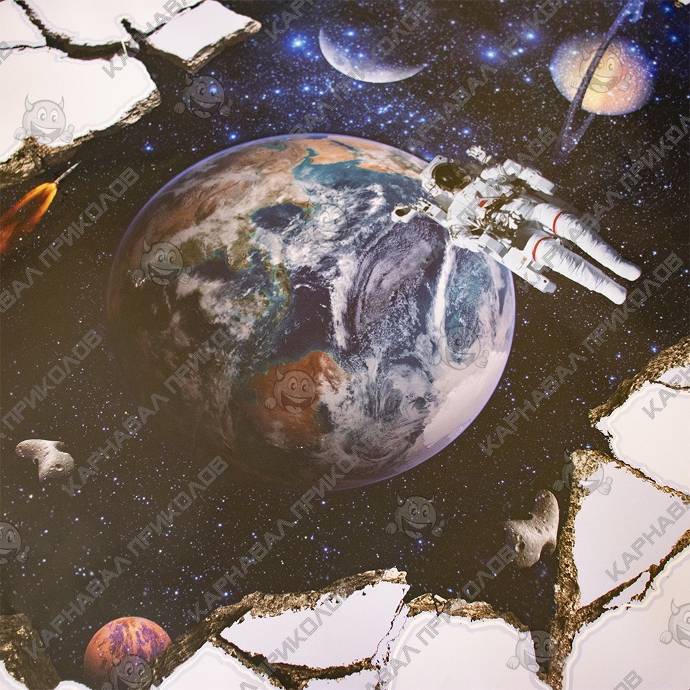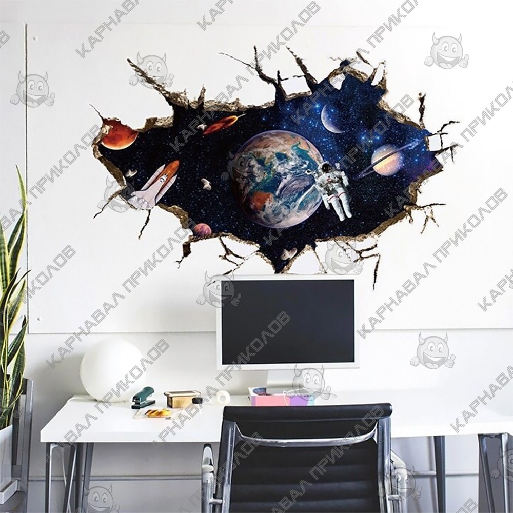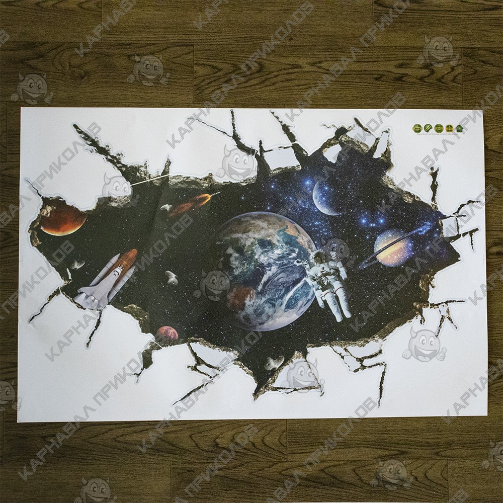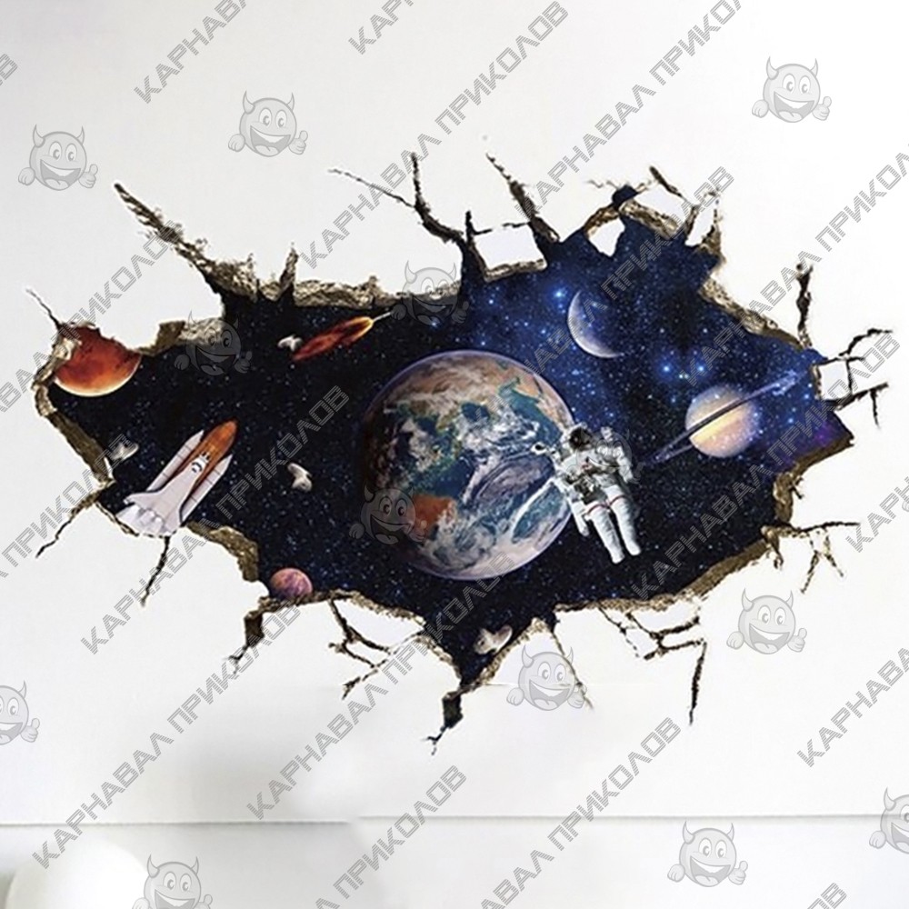 Интерьерная наклейка SS Космос Универсум SK9066A 90х60см - это быстрый способ классно украсить свой дом. Интернет-магазин Карнавал Приколов предлагает Вам купить интерьерные наклейки космической тематики, которые идеально подойдут на кухню, спальню, гостиную, детскую или игровую комнату. Украшение на стену оценят дети в своих спальнях или игровых комнатах. Интерьерная наклейка SS Космос Универсум SK9066A 90х60см принтом трещины в сете через которую просматривается космос с астронавтами. Размер листа с наклейками: 60х90 см. Как 3D наклейка клеится на стену ? Способ поклейки очень прост. Для начала необходимо очистить поверхность, на которую необходимо наклеить. После снимаем пленку и переносим рисунок на стену или другую плоскость рукой или ветошью. На какие поверхности можно клеить интерьерную наклейку ? Поклейка возможна на любую ИДЕАЛЬНО ГЛАДКУЮ ГЛЯНЦЕВУЮ поверхность, например : стена окрашенная глянцевой краской без каких-либо рельефов ( в краске не должно быть мелового компонента), стекло, зеркало, лакированные поверхности, гладкий пластик. На обои клеить НЕЛЬЗЯ. Ухаживать за стикерами на стену также достаточно легко, для этого необходимо лишь иногда протирать их влажной губкой или тряпкой. Яркость и насыщенность наклеек не меняется с течением времени, кроме того они абсолютно устойчивы к влажности.