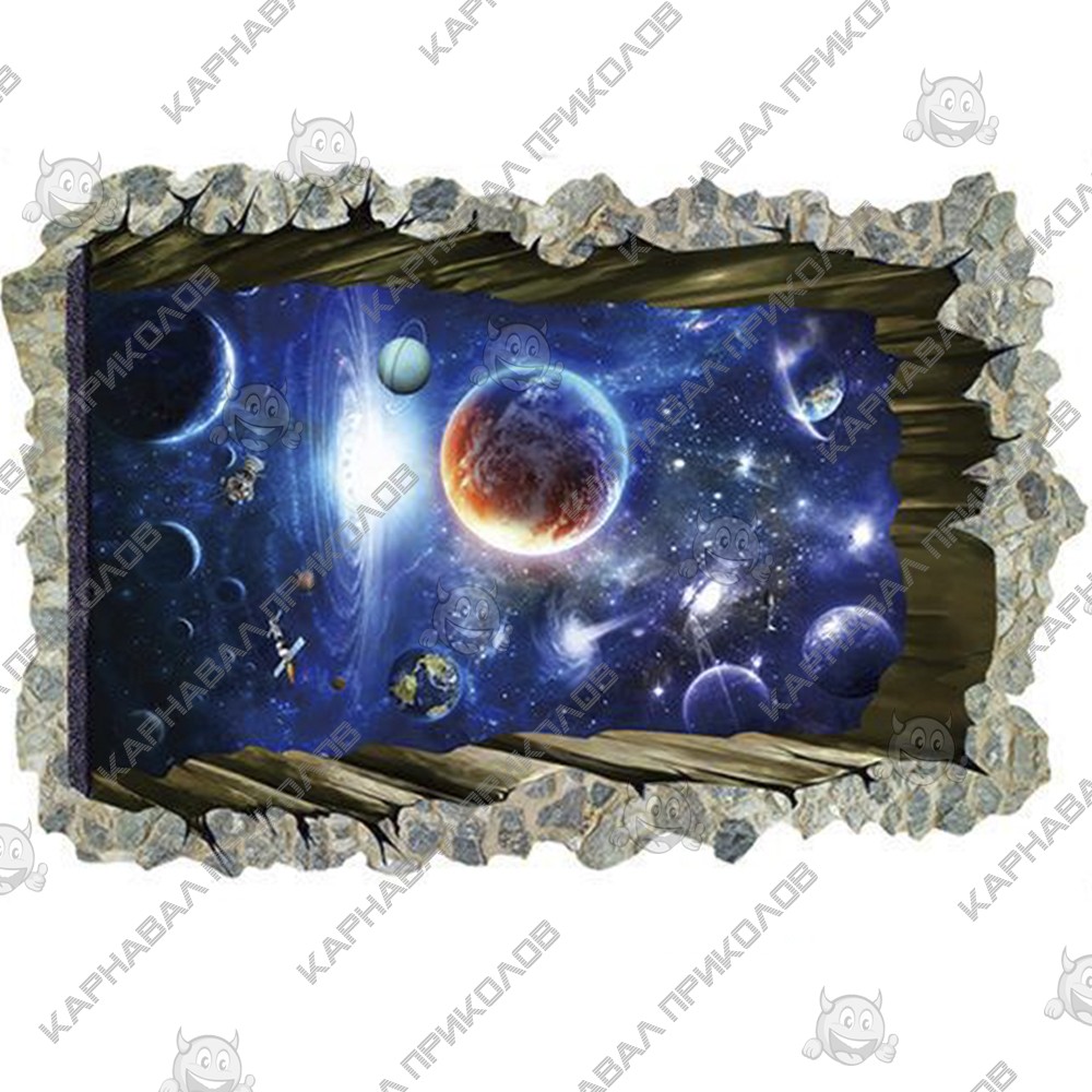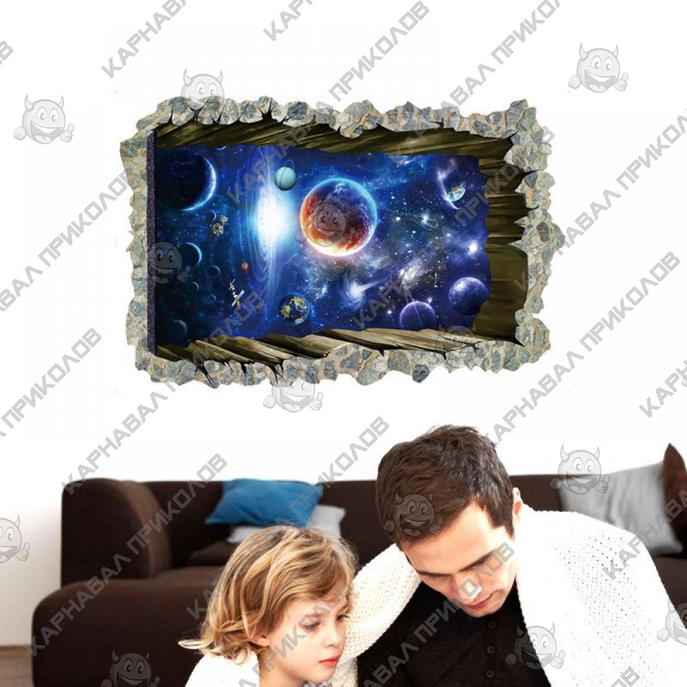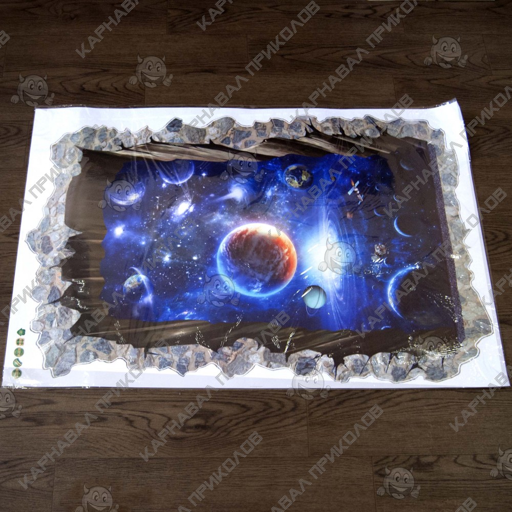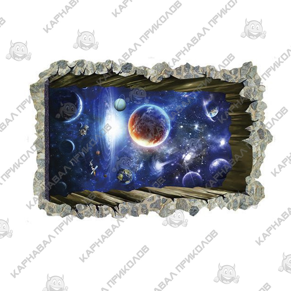 Интерьерная наклейка SS Космос Окно в галактику SK9304N 90х60см - это быстрый способ классно украсить свой дом. Интернет-магазин Карнавал Приколов предлагает Вам купить интерьерные наклейки космической тематики, которые идеально подойдут на кухню, спальню, гостиную, детскую или игровую комнату. Украшение на стену оценят дети в своих спальнях или игровых комнатах. Интерьерная наклейка SS Космос Окно в галактику SK9304N 90х60см принтом дыры сквозь стену в космос. Размер листа с наклейками: 90х60см. Как 3D наклейка клеится на стену ? Способ поклейки очень прост. Для начала необходимо очистить поверхность, на которую необходимо наклеить. После снимаем пленку и переносим рисунок на стену или другую плоскость рукой или ветошью. На какие поверхности можно клеить интерьерную наклейку ? Поклейка возможна на любую ИДЕАЛЬНО ГЛАДКУЮ ГЛЯНЦЕВУЮ поверхность, например : стена окрашенная глянцевой краской без каких-либо рельефов ( в краске не должно быть мелового компонента), стекло, зеркало, лакированные поверхности, гладкий пластик. На обои клеить НЕЛЬЗЯ. Ухаживать за стикерами на стену также достаточно легко, для этого необходимо лишь иногда протирать их влажной губкой или тряпкой. Яркость и насыщенность наклеек не меняется с течением времени, кроме того они абсолютно устойчивы к влажности.