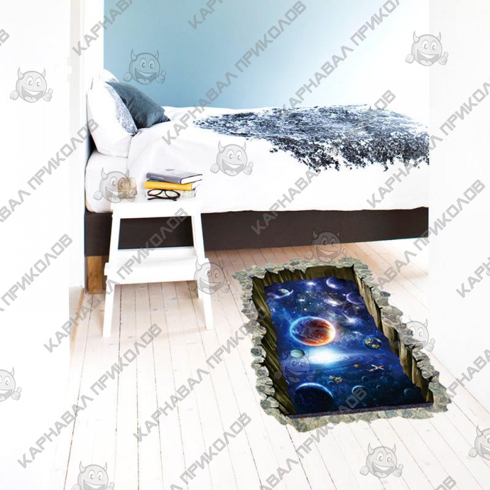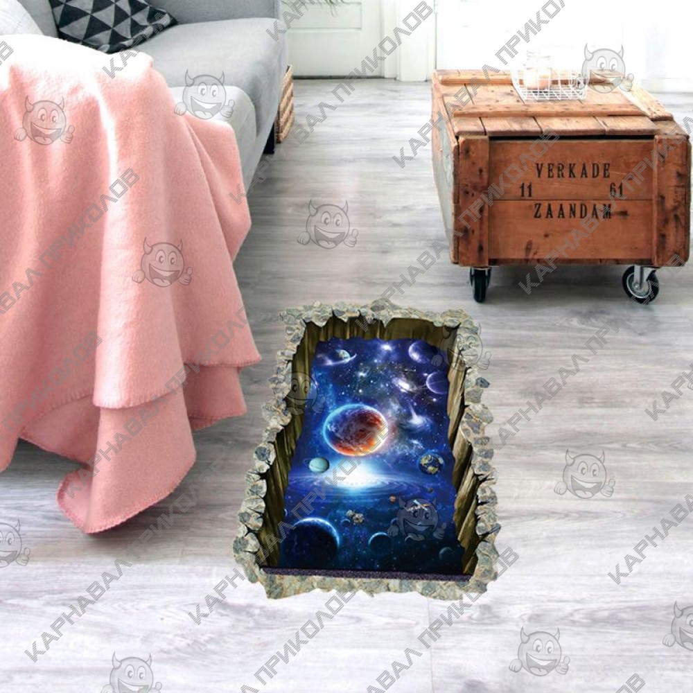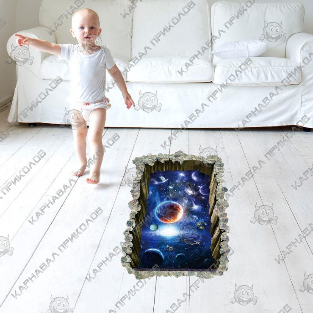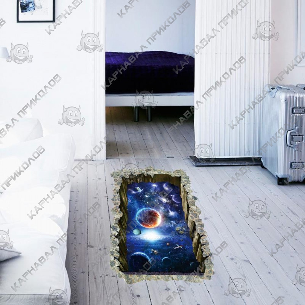 Интерьерная наклейка SS Космос Окно в галактику SK9304N 90х60см - это быстрый способ классно украсить свой дом. Интернет-магазин Карнавал Приколов предлагает Вам купить интерьерные наклейки космической тематики, которые идеально подойдут на кухню, спальню, гостиную, детскую или игровую комнату. Украшение на стену оценят дети в своих спальнях или игровых комнатах. Интерьерная наклейка SS Космос Окно в галактику SK9304N 90х60см принтом дыры сквозь стену в космос. Размер листа с наклейками: 90х60см. Как 3D наклейка клеится на стену ? Способ поклейки очень прост. Для начала необходимо очистить поверхность, на которую необходимо наклеить. После снимаем пленку и переносим рисунок на стену или другую плоскость рукой или ветошью. На какие поверхности можно клеить интерьерную наклейку ? Поклейка возможна на любую ИДЕАЛЬНО ГЛАДКУЮ ГЛЯНЦЕВУЮ поверхность, например : стена окрашенная глянцевой краской без каких-либо рельефов ( в краске не должно быть мелового компонента), стекло, зеркало, лакированные поверхности, гладкий пластик. На обои клеить НЕЛЬЗЯ. Ухаживать за стикерами на стену также достаточно легко, для этого необходимо лишь иногда протирать их влажной губкой или тряпкой. Яркость и насыщенность наклеек не меняется с течением времени, кроме того они абсолютно устойчивы к влажности.