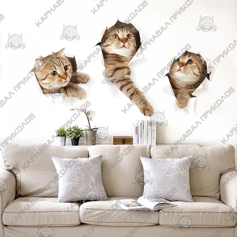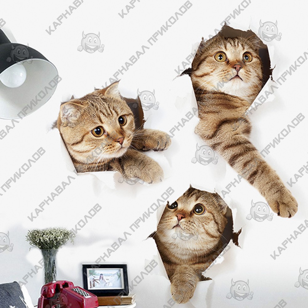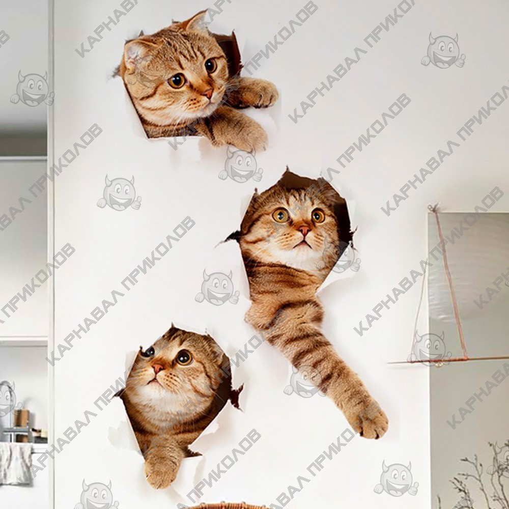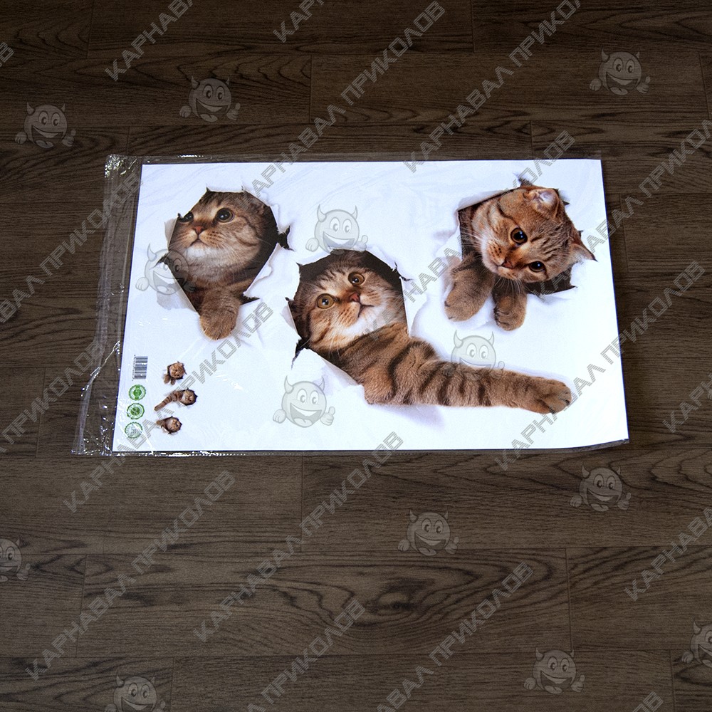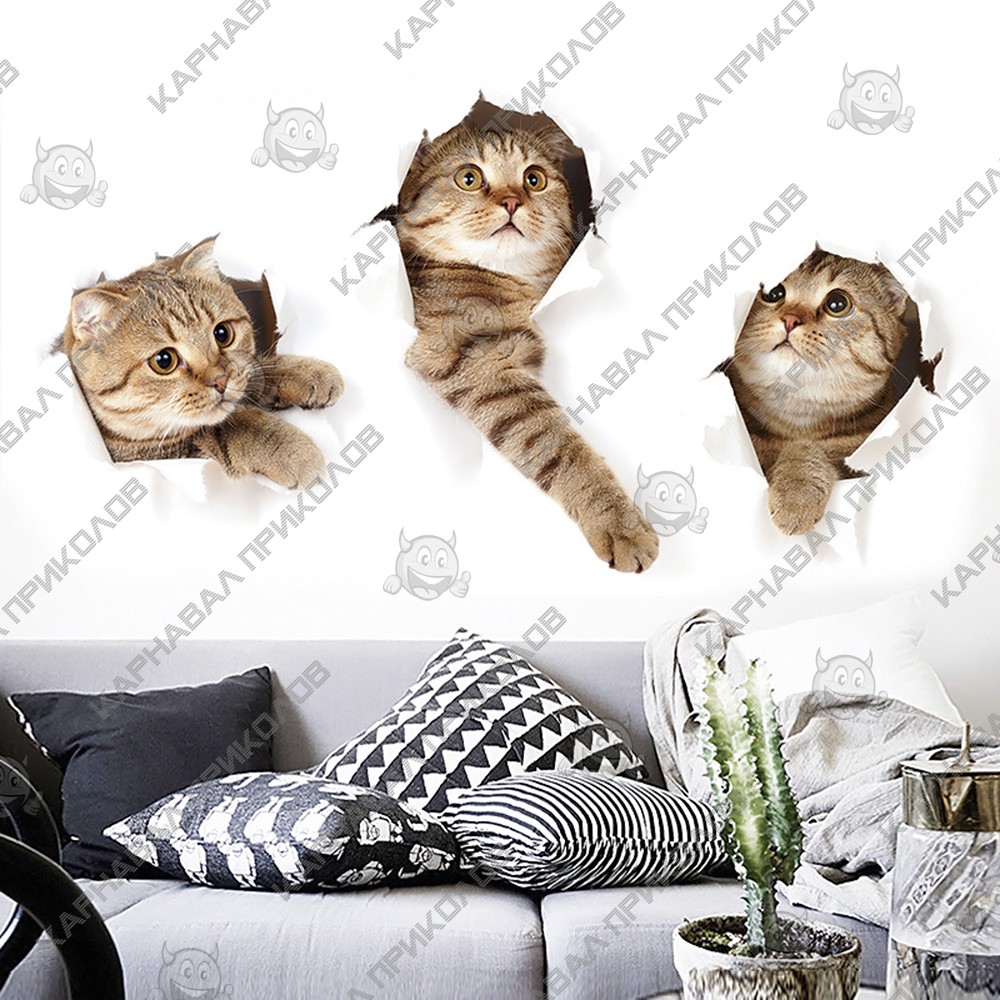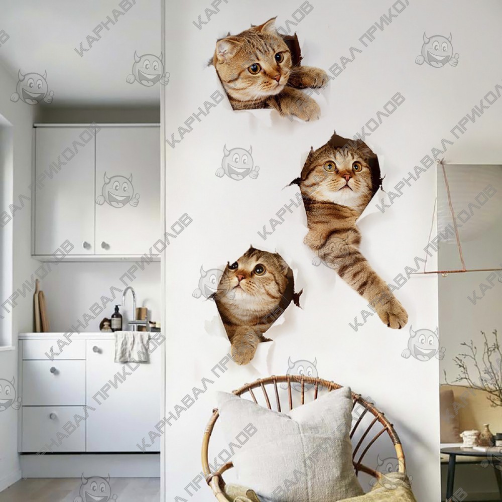 Интерьерная наклейка CD Котята XH6215 40х60см - это быстрый способ классно украсить свой дом. Интернет-магазин Карнавал Приколов предлагает Вам купить интерьерные наклейки тематики животные, которые идеально подойдут на кухню, спальню, гостиную, детскую или игровую комнату. Украшение на стену оценят дети в своих спальнях или игровых комнатах. Интерьерная наклейка CD Котята XH6215 40х40см принтом выглядывающих сквозь стену котят. Размер листа с наклейками: 40х40 см. Как 3D наклейка клеится на стену ? Способ поклейки очень прост. Для начала необходимо очистить поверхность, на которую необходимо наклеить. После снимаем пленку и переносим рисунок на стену или другую плоскость рукой или ветошью. На какие поверхности можно клеить интерьерную наклейку ? Поклейка возможна на любую ИДЕАЛЬНО ГЛАДКУЮ ГЛЯНЦЕВУЮ поверхность, например : стена окрашенная глянцевой краской без каких-либо рельефов ( в краске не должно быть мелового компонента), стекло, зеркало, лакированные поверхности, гладкий пластик. На обои клеить НЕЛЬЗЯ. Ухаживать за стикерами на стену также достаточно легко, для этого необходимо лишь иногда протирать их влажной губкой или тряпкой. Яркость и насыщенность наклеек не меняется с течением времени, кроме того они абсолютно устойчивы к влажности.