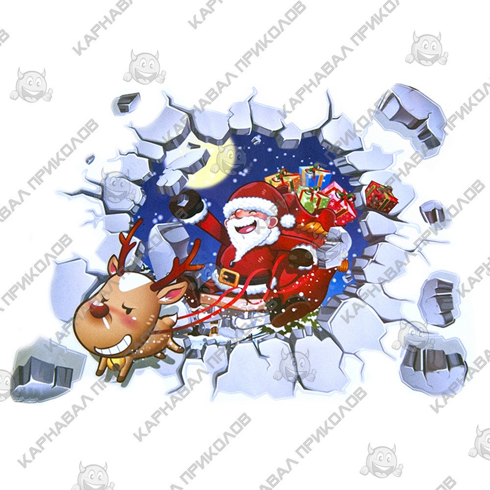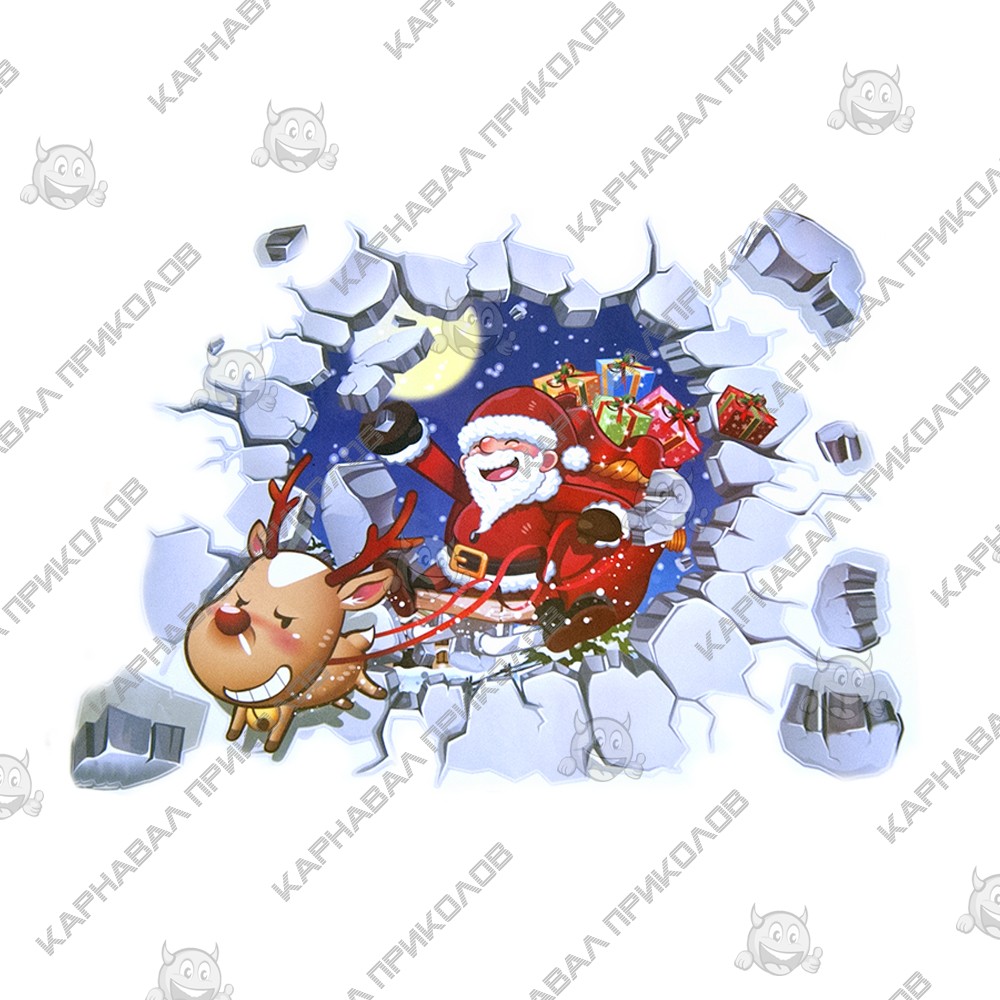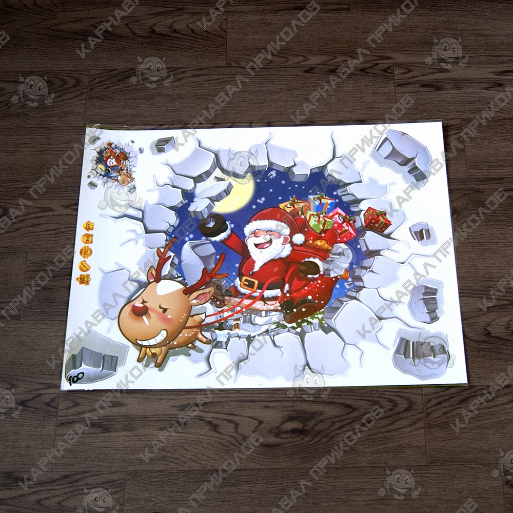 Интерьерная наклейка NG Санта Клаус разбитая стена ABQ6005 45х60см - это быстрый способ классно украсить свой дом к празднику. Интернет - магазин Карнавал Приколов предлагает Вам купить интерьерные наклейки новогодней тематики, которые идеально подойдут на кухню, спальню, гостиную, детскую или игровую комнату. Украшение на стену оценят дети в своих спальнях или игровых комнатах. Как 3D наклейка клеится на стену ? Способ поклейки очень прост. Для начала необходимо очистить поверхность, на которую необходимо наклеить. После снимаем пленку и переносим рисунок на стену или другую плоскость рукой или ветошью. На какие поверхности можно клеить интерьерную наклейку ? Поклейка возможна на любую гладкую поверхность, а именно : стена, стекло, дерево, металл, пластик, керамика. Ухаживать за стикерами на стену также достаточно легко, для этого необходимо лишь иногда протирать их влажной губкой или тряпкой. Яркость и насыщенность наклеек не меняется с течением времени, кроме того они абсолютно устойчивы к влажности.