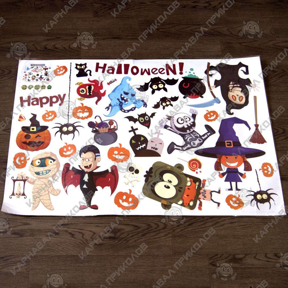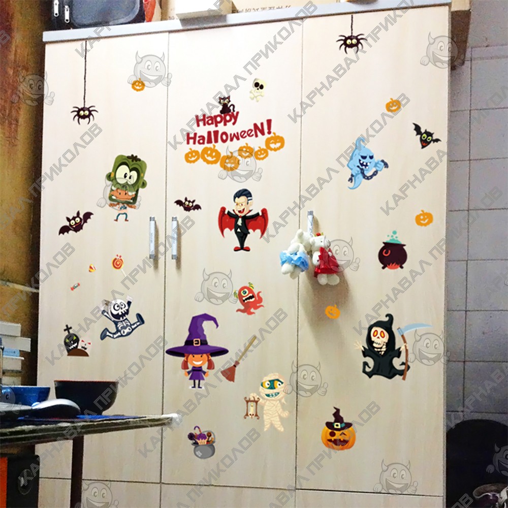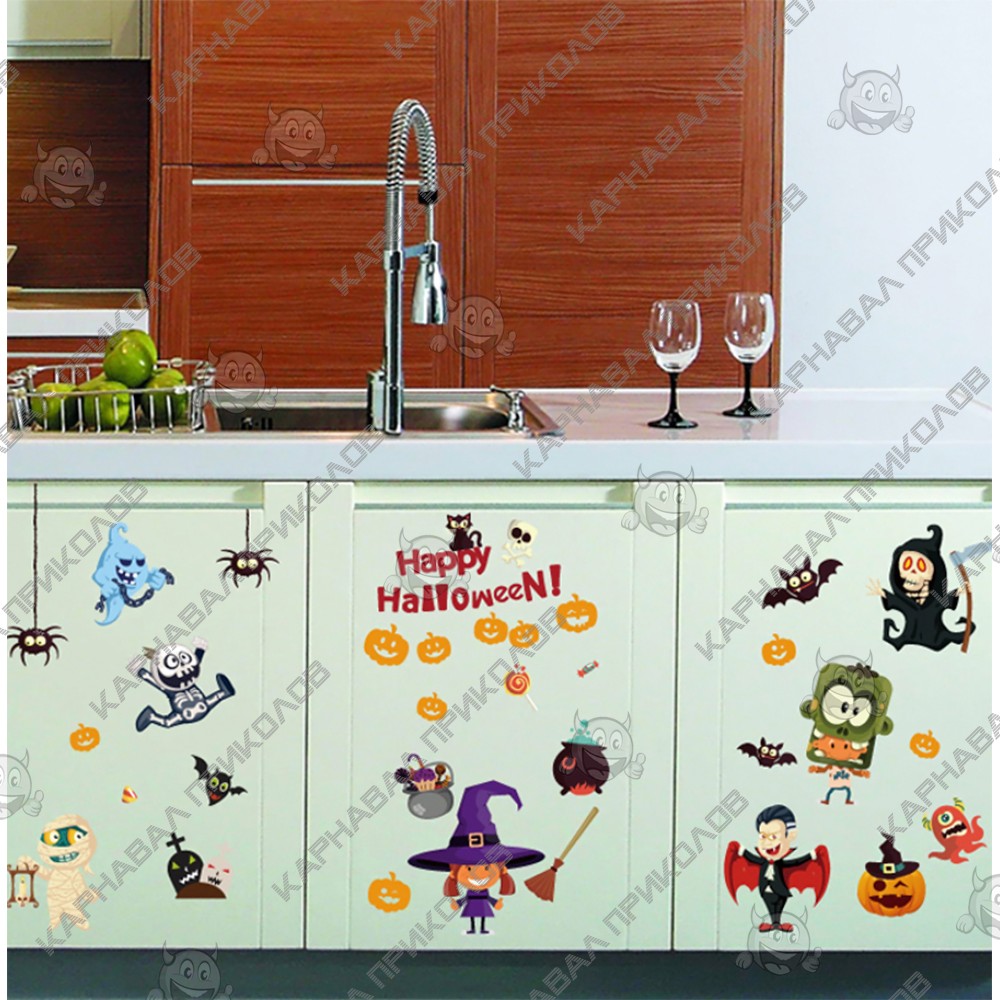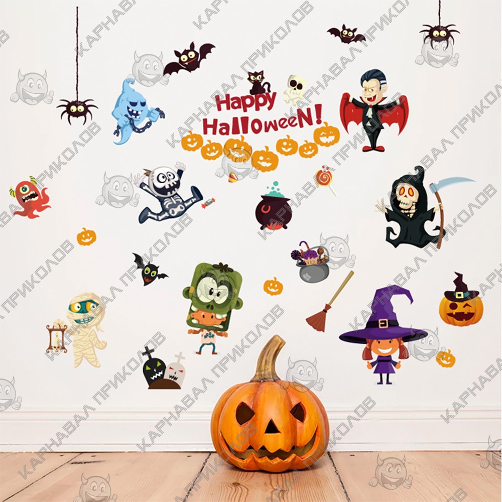 Интерьерная наклейка HL Вечеринка Хэллоуин SK9096 60х90см - это быстрый способ классно украсить свой дом. Интернет - магазин Карнавал Приколов предлагает Вам купить интерьерные наклейки хоррор тематики, которые идеально подойдут на кухню, спальню, гостиную, детскую или игровую комнату. Украшение на стену оценят в комнате страха или декора хэллоуин. Как 3D наклейка клеится на стену ? Способ поклейки очень прост. Для начала необходимо очистить поверхность, на которую необходимо наклеить. После снимаем пленку и переносим рисунок на стену или другую плоскость рукой или ветошью. На какие поверхности можно клеить интерьерную наклейку ? Поклейка возможна на любую ИДЕАЛЬНО ГЛАДКУЮ ГЛЯНЦЕВУЮ поверхность, например : стена окрашенная глянцевой краской без каких-либо рельефов ( в краске не должно быть мелового компонента), стекло, зеркало, лакированные поверхности, гладкий пластик. На обои клеить НЕЛЬЗЯ.. Ухаживать за стикерами на стену также достаточно легко, для этого необходимо лишь иногда протирать их влажной губкой или тряпкой. Яркость и насыщенность наклеек не меняется с течением времени, кроме того они абсолютно устойчивы к влажности.