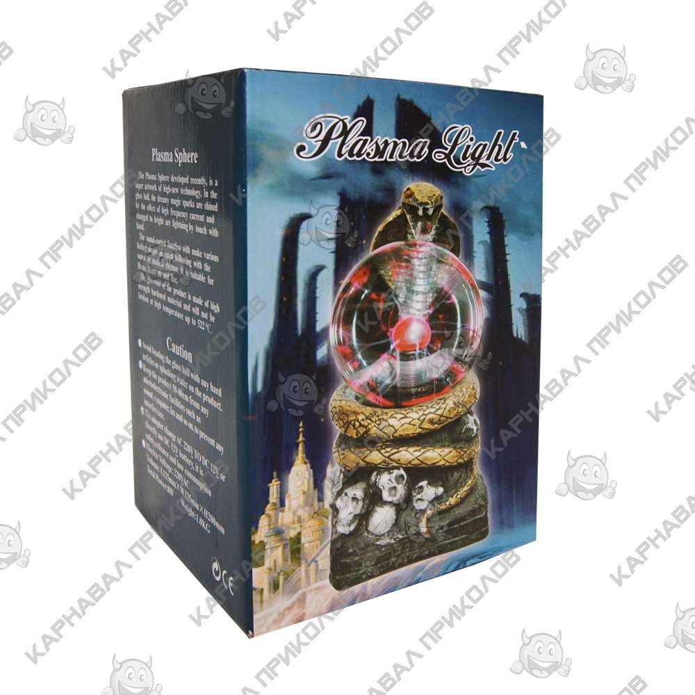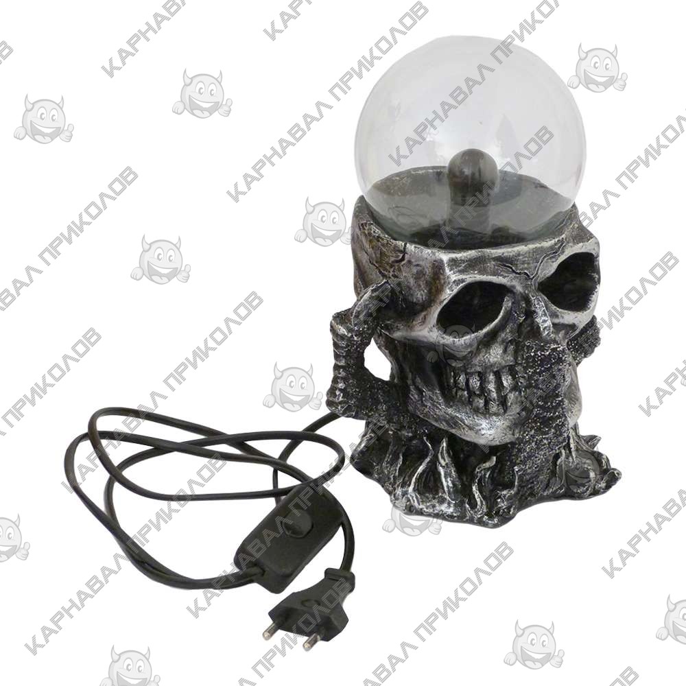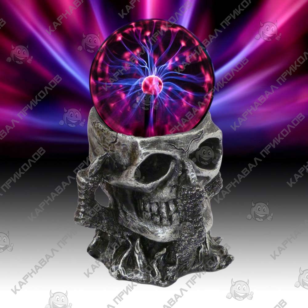 Плазменный Шар Череп – интересный подарок для друзей, родственников и любимых. Простой дизайн устройства дополняется необычайно красивой работой, а изюменкой светильника является форма подставки в форме черепа, на котором эффектно смотрится шар. При включении в сеть плазменного шара (plasma ball) вы увидите разноцветные молнии, которые исходят из центра и заканчиваются на стеклянных стенах шара. Работа плазменного шара заключается в том, что внутри герметично закрытой стеклянной сферы есть электрод, на который постоянно подается переменное напряжение. А молнии в сфере образовываются от свечения инертных газов, которые наполняют её, в зависимости от смеси газов молнии приобретают цвет от ярко-фиолетового до голубого. В комплектацию входит: плазменный шар и адаптер питания( шнур питания, подключающийся в розетку). Работает от сети 220V.