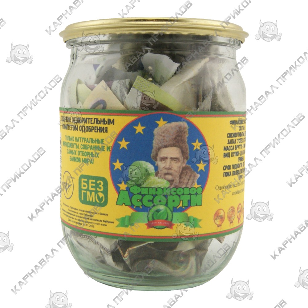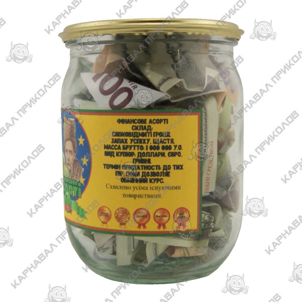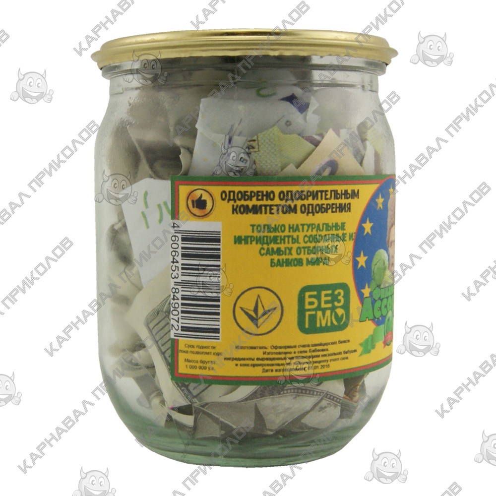 Целое собрание мировых богатств! Денежный подарок Финансовое ассорти от Карнавал Приколов - это шуточный, но очень актуальный презент, который демонстрирует разнообразие и перспективы в финансовом мире. Внутри стеклянной банки вы обнаружите сувенирные купюры различных валют или номиналов, сложенные в виде аппетитного ассорти. Этикетка с ироничным дизайном и характерным изображением подчеркивает идею коллекции мировых денежных средств. Отличный выбор для прагматичных мечтателей и тех, кто готов к любым финансовым приключениям! Ищете по-настоящему необычный и запоминающийся подарок, который вызовет улыбку и поднимет настроение? Законсервированное Богатство. Денежный подарок Финансовое ассорти - это остроумный и креативный способ вручить деньги или просто пожелать финансового благополучия. Подарок представляет собой стеклянную банку, герметично закатанную металлической крышкой, как настоящая консервация на чёрный день, и наполненную сувенирными купюрами, соответствующими тематике. Подарок имитирует домашнюю консервацию, но вместо овощей внутри - закатанные деньги, что создает забавный и неожиданный эффект. Отличный выбор для дней рождений, свадеб, корпоративных вечеринок или просто как шуточный презент с глубоким смыслом.
