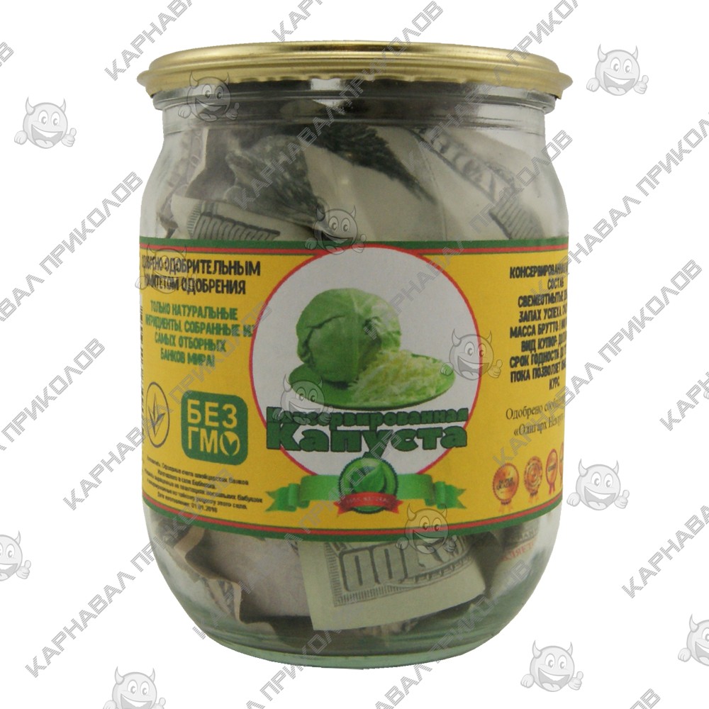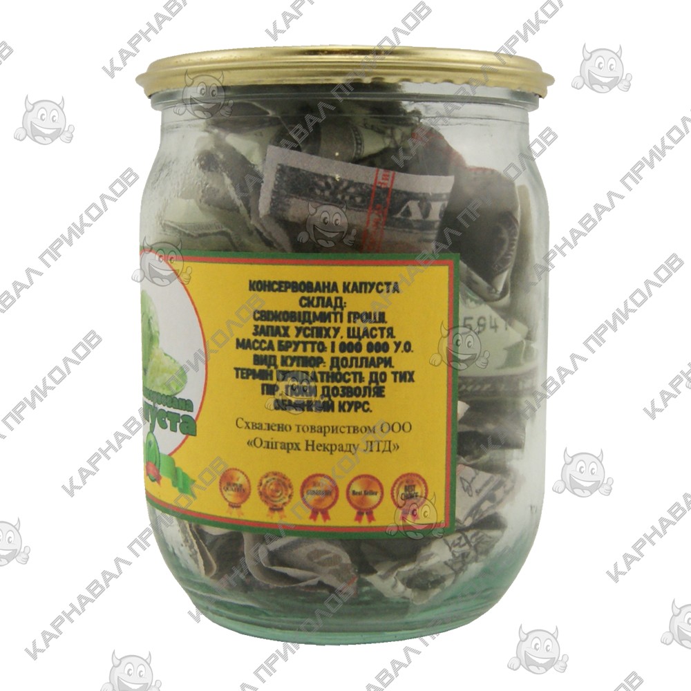 Классика жанра для тех, кто любит рубить капусту! Денежный подарок Консервированная капуста -это забавный намек на финансовый успех, представленный в виде домашней заготовки. Внутри банки вы найдете плотно уложенные сувенирные долларовые купюры, имитирующие нарезанную капусту. Этикетка, выполненная в стиле традиционной консервации с изображением кочана капусты, делает этот подарок остроумным символом денежного изобилия. Идеально для тех, кто понимает юмор и стремится к приумножению своего капитала. Ищете по-настоящему необычный и запоминающийся подарок, который вызовет улыбку и поднимет настроение? Законсервированное Богатство. Денежный подарок Консервированная капуста - это остроумный и креативный способ вручить деньги или просто пожелать финансового благополучия. Отличный выбор для дней рождений, свадеб, корпоративных вечеринок или просто как шуточный презент с глубоким смыслом.