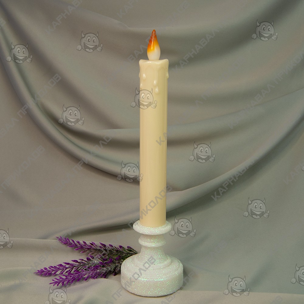 Свічка LED в свічнику L24см (біла) - декоративне світло, яке ніколи не змінить свою форму і не згорить. А найголовніше не залишить крапель воску на скатертині чи столі. Свічка-лампа LED виготовлена із пластику. За формою імітує свічку в свічнику з потіками воску на основі свічки. В основі свічника розташований відсік для батарейок. Джерело живлення для свічки – 2 батарейки типу ААА (пальчикові батарейки). Для увімкнення/вимкнення на звороті основи необхідно поставити перемикач у положення ON/OFF. Світіння м'яке, ненав'язливе. за рахунок забарвлення пластику у верхній частині та легкого хаотичного миготіння імітується рух вогню. Така свічка стане чудовим елементом декору для створення романтичної атмосфери. Послужить нічником для дитини.
