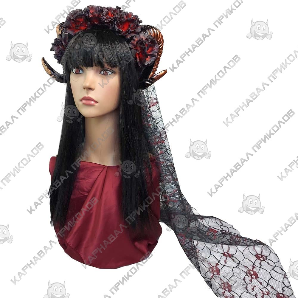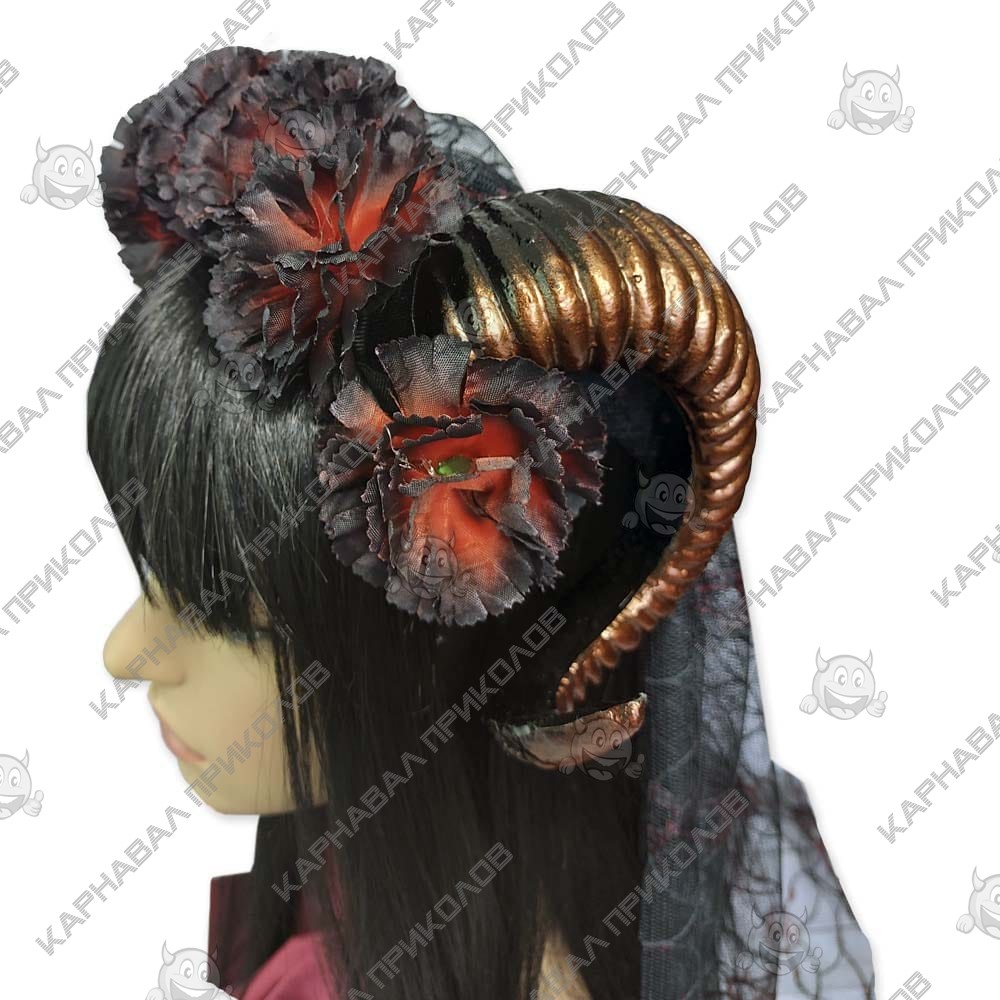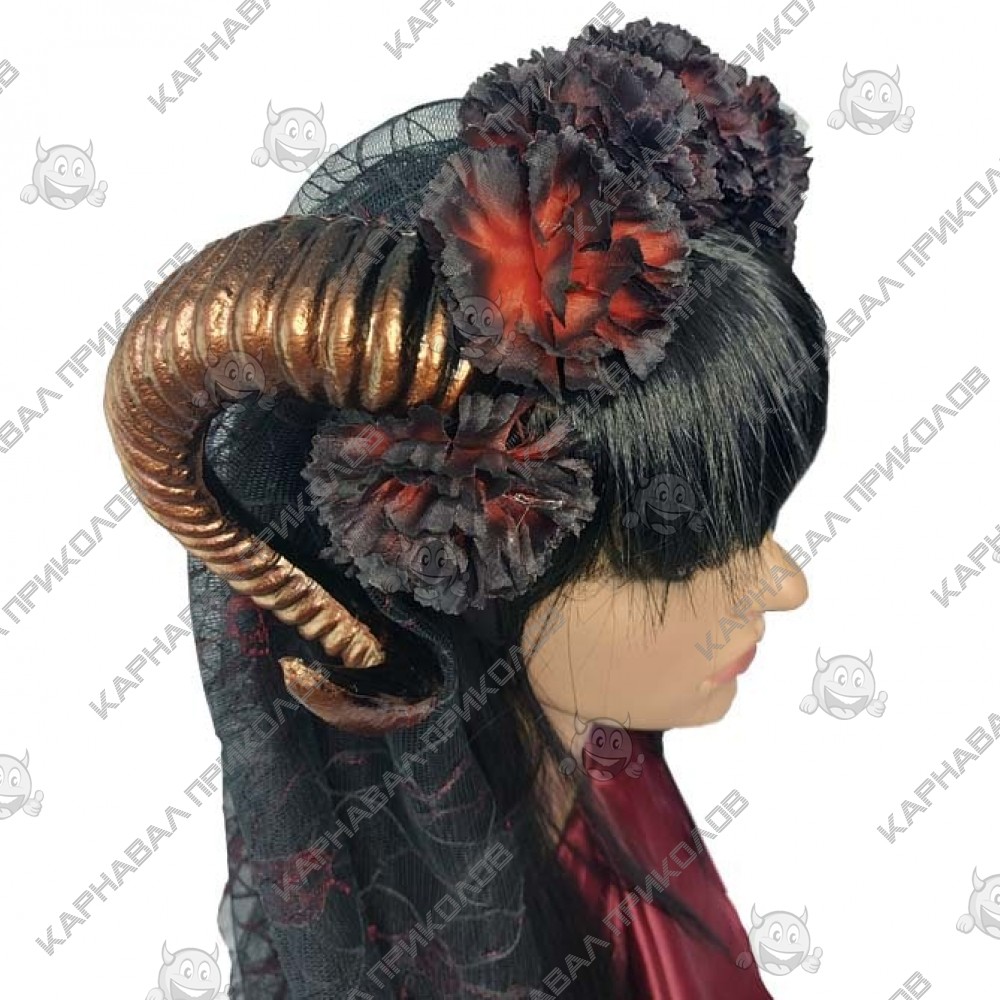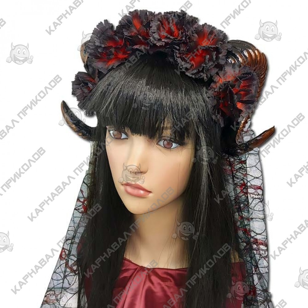 Прикраса на голову з рогами Кальма 10234 можна легко створити оригінальний образ. Обідок з квітами у стилі Santa Muerte на Halloween, ефектно доповнить будь-який костюм безбожності. Ефектне поєднання темно-червоних хризантем з великими бронзовими рогами демона, доповнене чорною фатою з червоними черепами з гіпюру, створює загадковий образ Смерті. Пропонуємо Вам великий вибір прикрас на голову для складання неповторного образу на День Мертвих в інтернет-магазині Карнавал Приколів. Купивши Прикрасу на голову Хелловін Ви отримуєте не тільки якісний товар, а й 100% позитивних вражень від придбання. Крім аксесуару для волосся, звичайно, бажаний оригінальний костюм, а також специфічний грим, який Ви можете підібрати на нашому сайті.