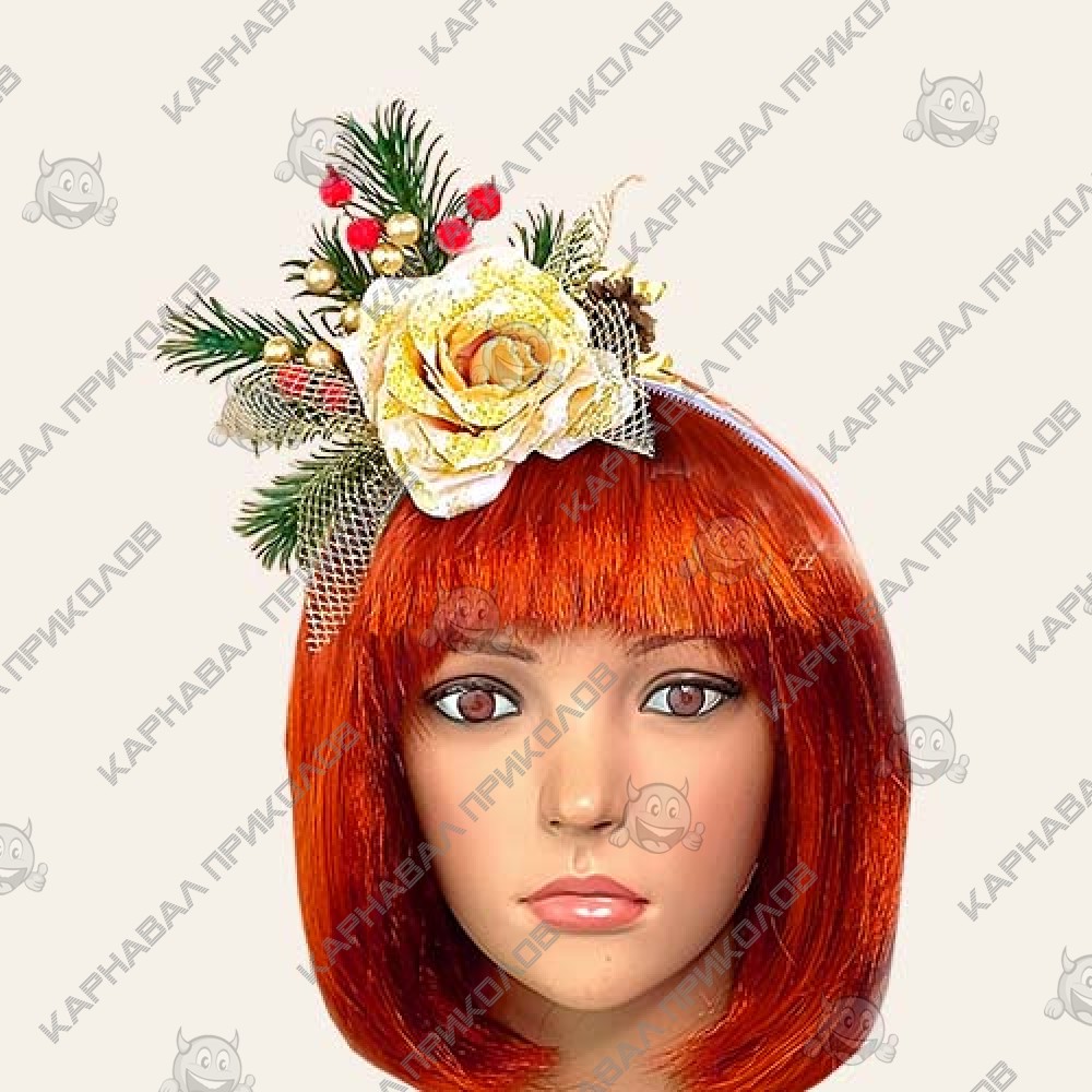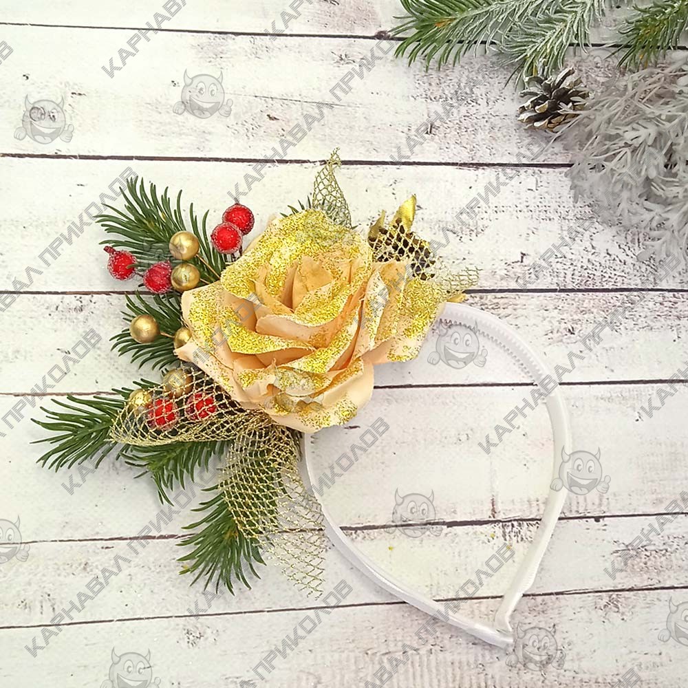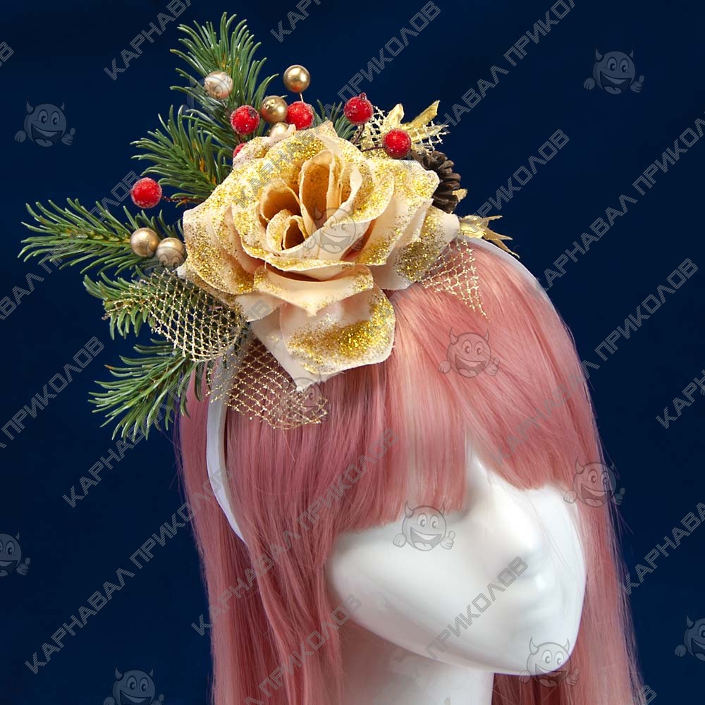 Інтернет магазин Карнавал Приколів пропонує Вам купити оптом по-справжньому зимовий та стильний обідок з гілочками ялинки та декоративними квітами, повністю ручної роботи. Чарівний різдвяний обідок – ошатний аксесуар для фотосесії, корпоративу, створення унікального образу чи будь-якої іншої урочистості. Ніжна чайна троянда присипана золотим гліттером з литими гілочками ялинки та ягодами калини виглядають просто чудово та дуже святково, а також створюють святковий настрій та ідеально впишуться у новорічні урочистості. Композиція надійно закріплена на пластиковому білому обідку універсального розміру, прикрашеному білою стрічкою репсової. Ця новорічна прикраса на голову зробить Ваше вбрання на будь-якій святковій вечірці і буде родзинкою образу, як вишенька на торті.