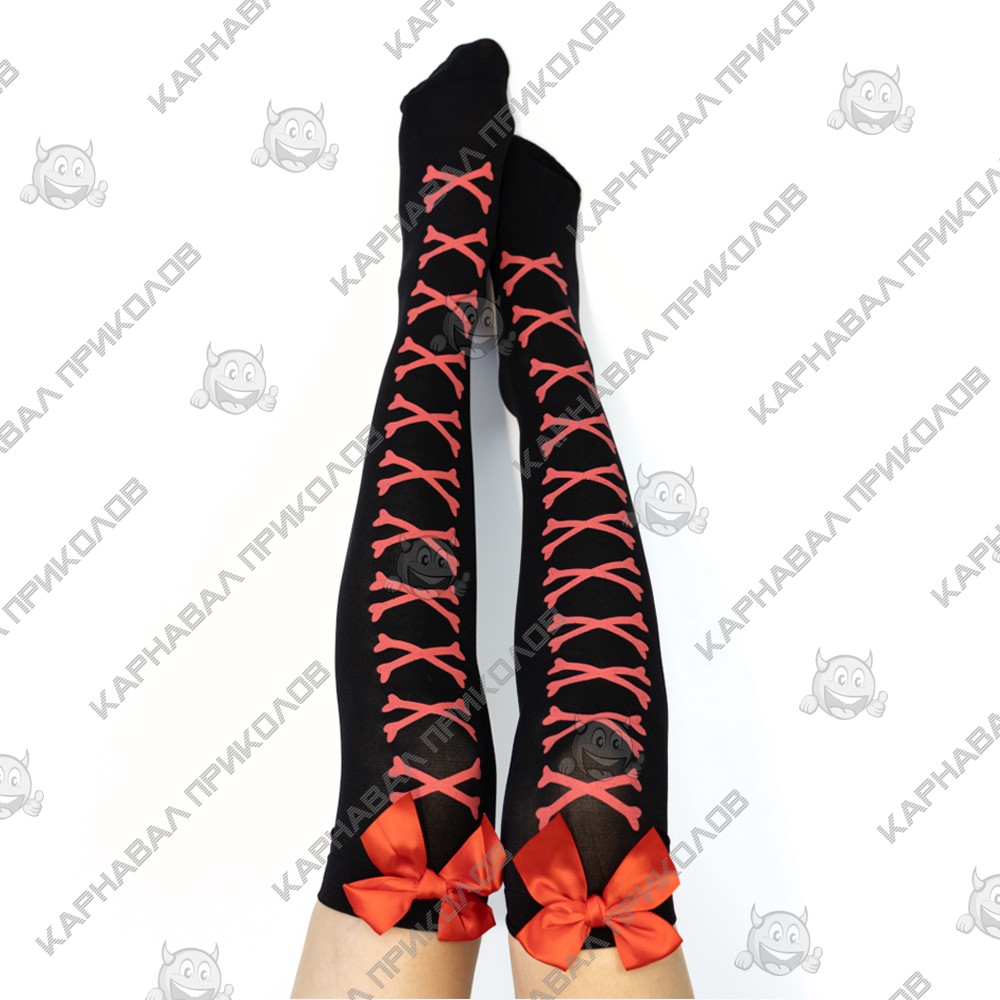 Панчохи Хелловін Кістки з бантом (чорні з червоним) - значить завершити свій похмурий образ на Хелловін. Нейлонові панчохи з зображенням шнурівки з бантом ідеально підходять для створення образу на тематичне свято День мертвих або Марді Гра. Панчохи на гумці оптом та по дропшипінгу Ви можете купити в інтернет магазині Карнавал Приколів.