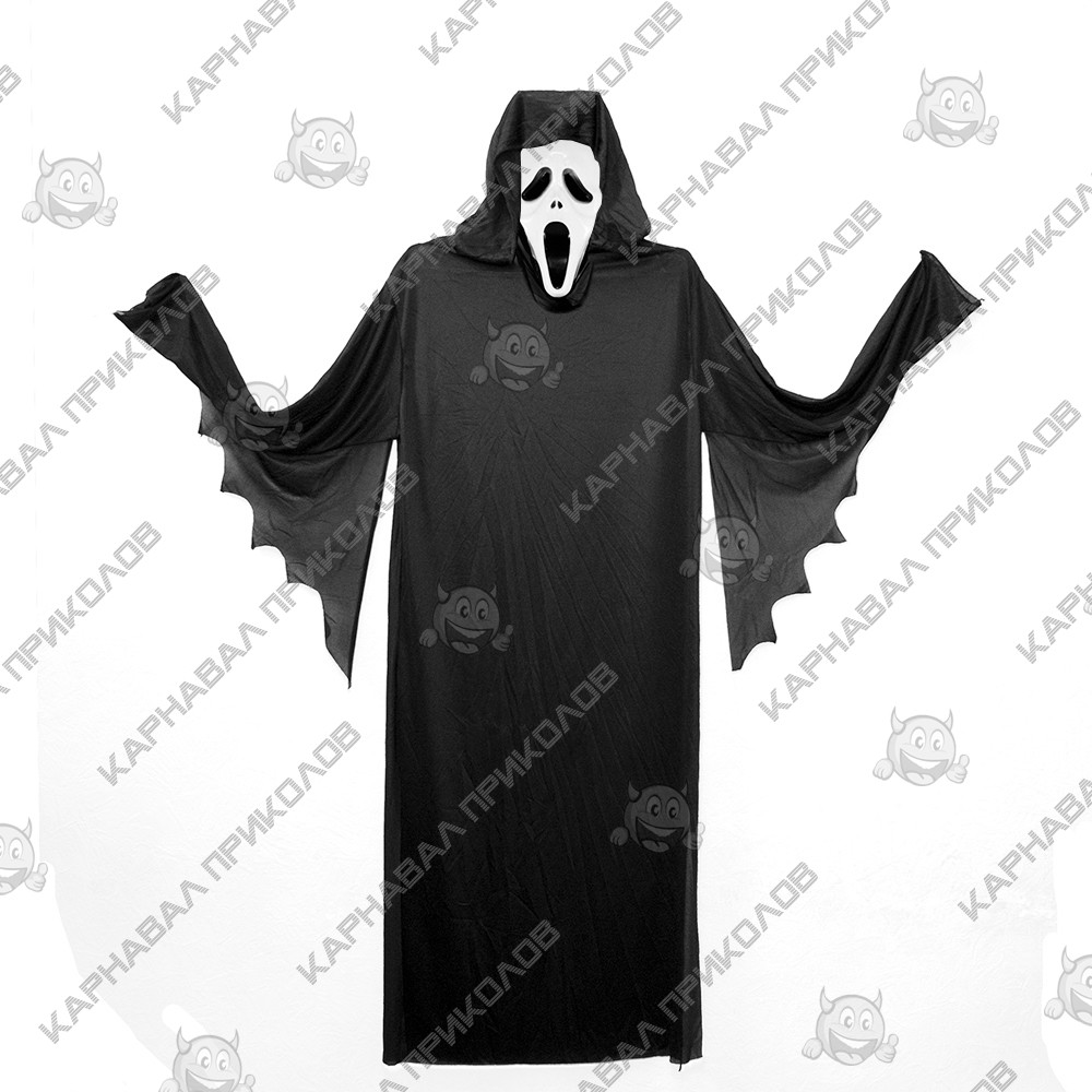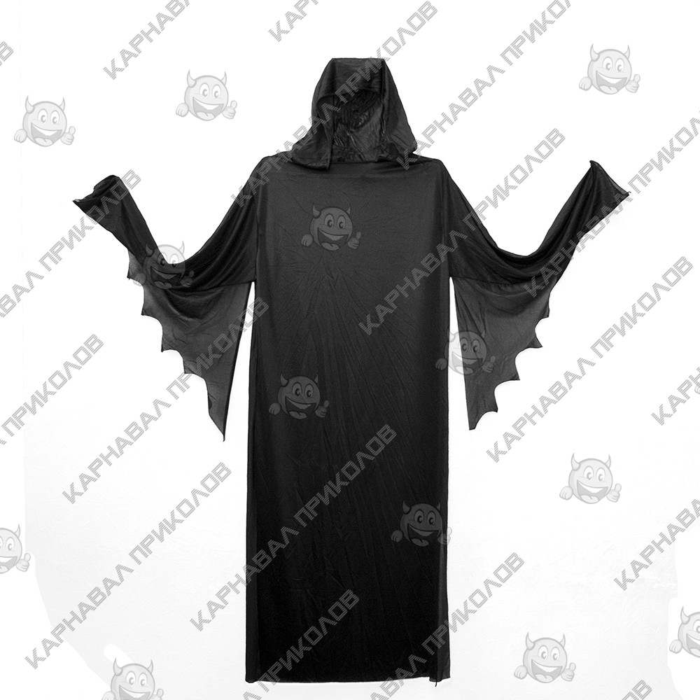 Карнавальний костюм Смерть - підійде для створення утворена Смерті або Примарного обличчя з серії фільмів жаху Крик на Хелловін, Корпоратив. Карнавальний костюм виготовлений з штучного трикотажу чорного кольору. На руковах, довжиною 60см є крила формою нагадують крила кажана. Костюм завдовжки 130см без капюшона. У комплект маска не входить. Карнавальну маску Крик можна купити окремо на нашому сайті. Купити карнавальний костюм для дорослих оптом та по дропшипінгу недорого в інтернет магазині Карнавал Приколів. Тільки у нас найбільший вибір дорослих карнавальних костюмів за доступною ціною.
