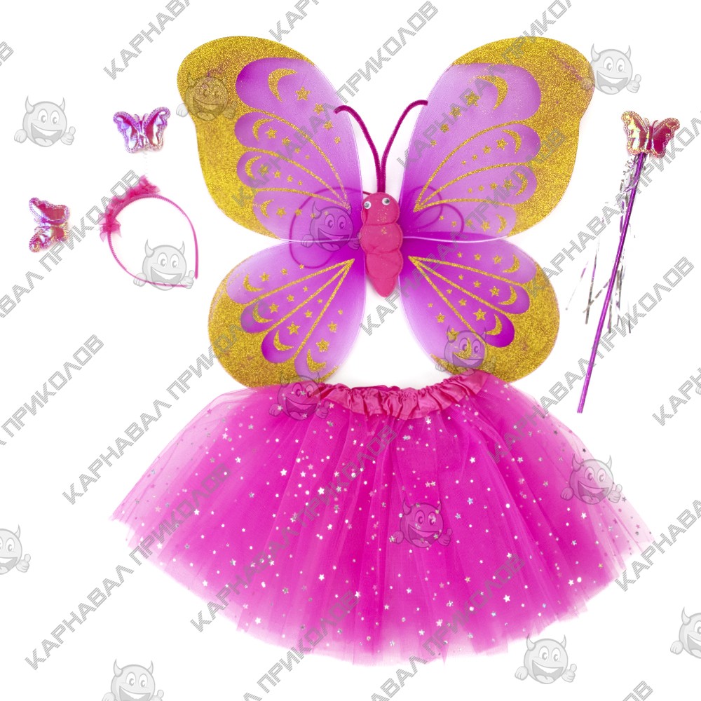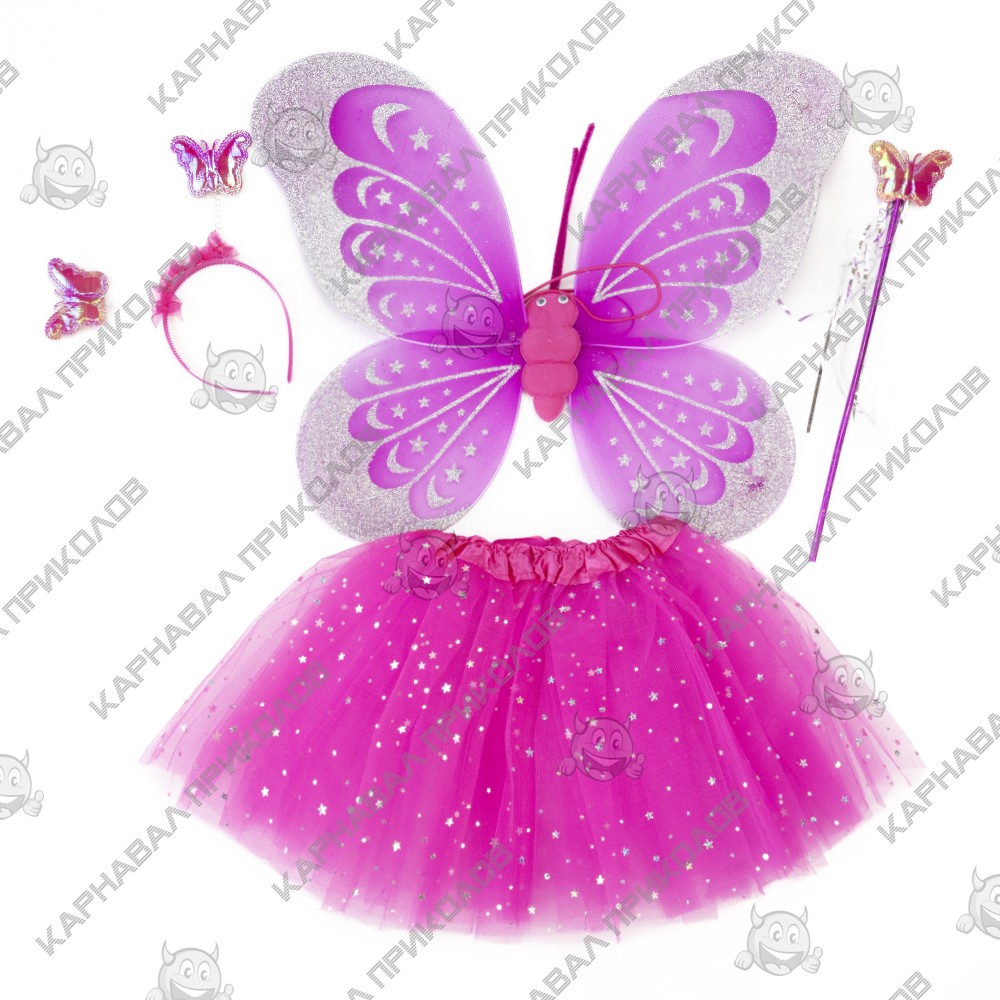 | Додаткові характеристики: | Крила - 50х38см, спідниця з фатину: ширина в талії - 45 см, довжина спідниці - 30см, паличка: 35х7х1см, обідок: 22х21х1,5см |