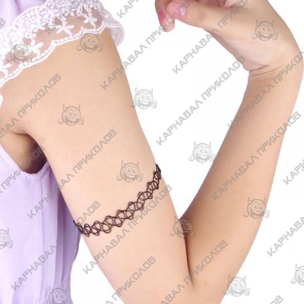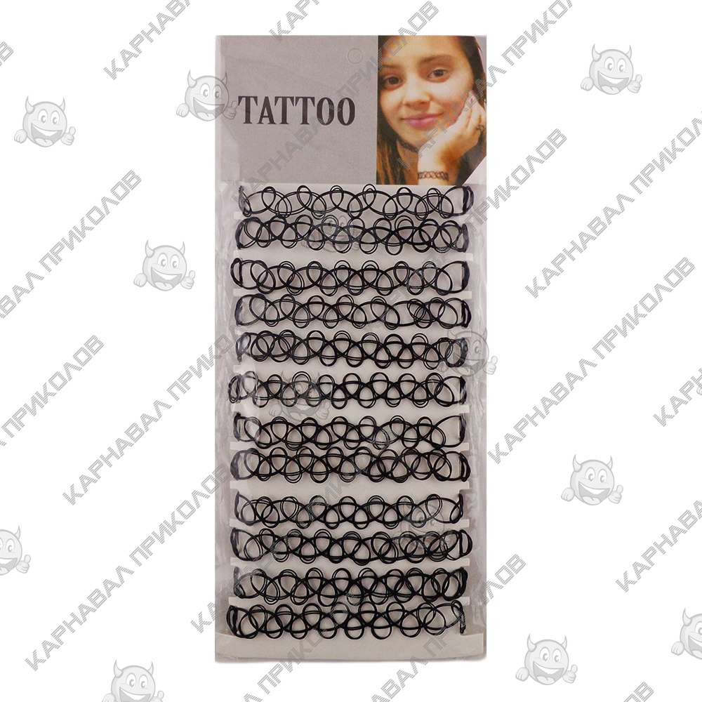 Легендарна прикраса 90-х тату чокер (Tattoo Choker) знову у моді. Класичний тату чокер, одягається на шию через голову, тому що легко тягнеться завдяки гумовому складу, щільно перетискається до шиї. Вони універсальні і не вимагають певного стилю, однаково підходять як шанувальницям glam rock, так і любителькам стриманого casual. Виготовлений з якісного пластику. В комплект входить: 12шт тату чокерів браслетів.