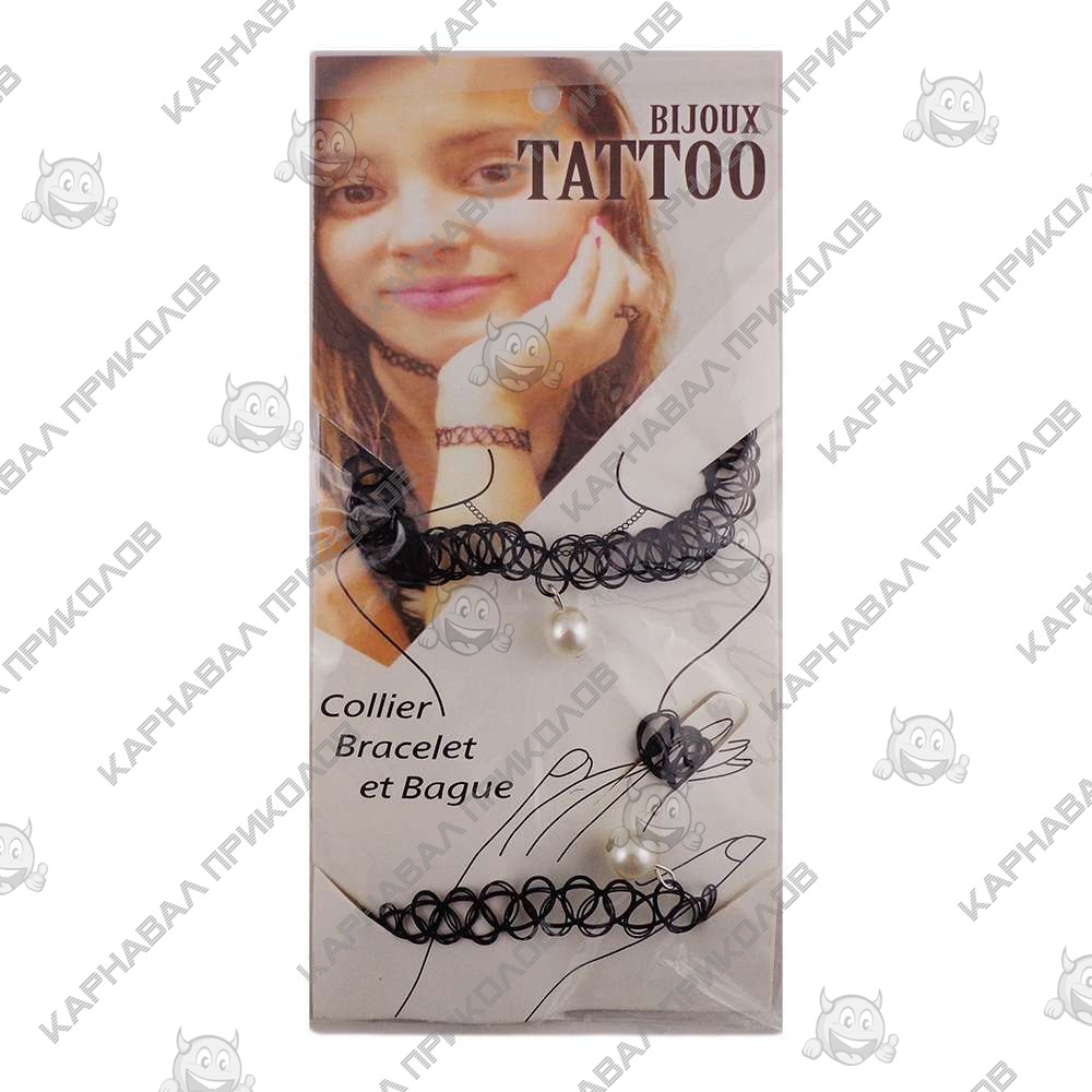 Легендарна прикраса 90-х тату чокер (Tattoo Choker) знову у моді. Класичний тату чокер, одягається на шию через голову, тому що легко тягнеться завдяки гумовому складу, щільно перетискається до шиї. Вони універсальні і не вимагають певного стилю, однаково підходять як шанувальницям glam rock, так і любителькам стриманого casual. Виготовлений з якісного пластику. В комплект входить: тату чокер з перлами на шию, браслет з перлами та кільце.