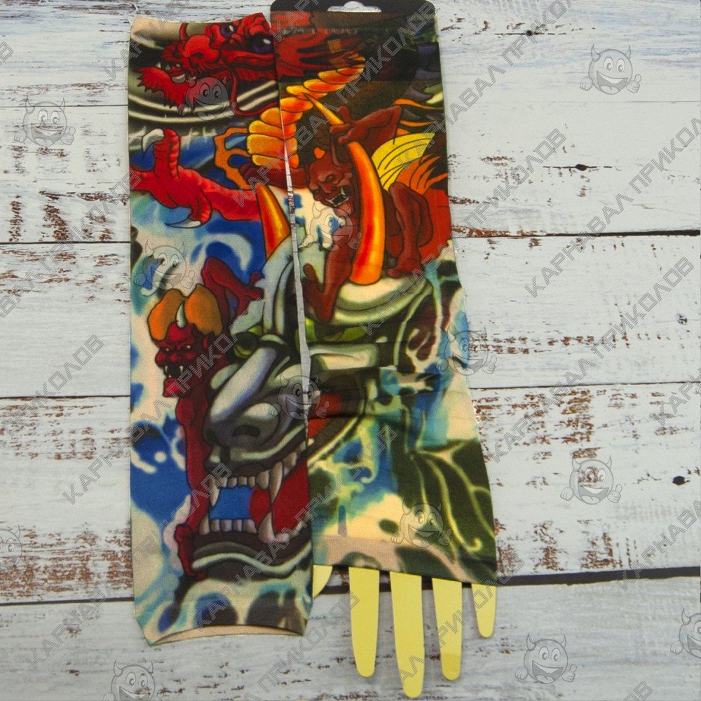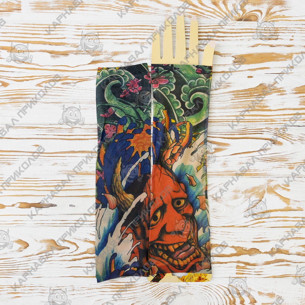 Ви мріяли про татуювання, але не могли наважитися? Бажаєте розширити асортимент Вашого магазину карнавальних аксесуарів? Тоді оптовий інтернет магазин Карнавал Приколів пропонує купити нейлонові безшовні тату рукави з кольоровим малюнком. Тату рукава виготовлені з дихаючого матеріалу, за складом нагадує капрон з пористою структурою, завдяки чому шкіра під ними не потіє і не викликає подразнень. Мають універсальний розмір. Одягаються тату рукава від зап'ястя до плеча, поверх Ви можете одягати футболку або сорочку з лагідним рукавом. Знімні тату рукави реалістично виглядають на руці, створюючи враження ефектного татуювання. Рукави можна прати.