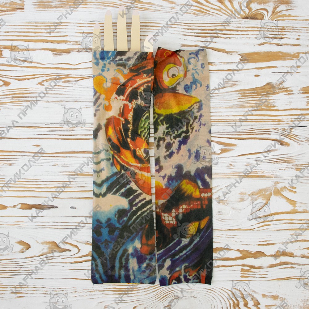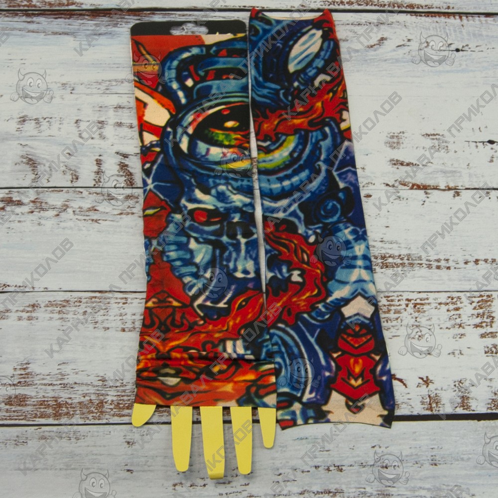 Ви мріяли про татуювання, але не могли наважитися? Бажаєте розширити асортимент Вашого магазину карнавальних аксесуарів? Тоді оптовий інтернет магазин Карнавал Приколів пропонує купити нейлонові безшовні тату рукави з кольоровим малюнком. Тату рукава виготовлені з дихаючого матеріалу, за складом нагадує капрон з пористою структурою, завдяки чому шкіра під ними не потіє і не викликає подразнень. Мають універсальний розмір. Одягаються тату рукава від зап'ястя до плеча, поверх Ви можете одягати футболку або сорочку з лагідним рукавом. Знімні тату рукави реалістично виглядають на руці, створюючи враження ефектного татуювання. Рукави можна прати.