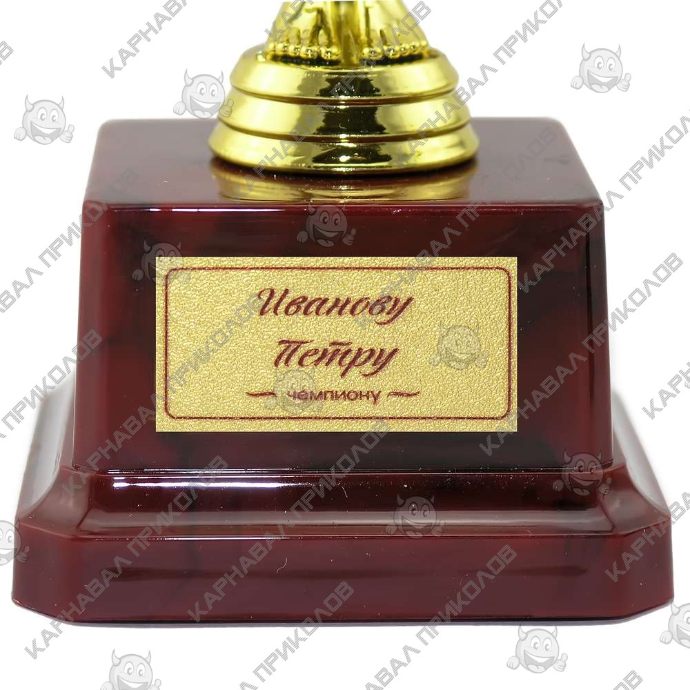 Статуетка 57042 Оскар подарунковий 19 см із написом чудовий та оригінальний подарунок. Це повноцінний набір, що складається зі Статуетки Оскар подарунковий 19 см та Індивідуального друку №5, напису на табличці п'єдесталу 4,2х2,2см. Звертаємо вашу увагу, що цей індивідуальний друк вміщує на табличці максимально 40 символів у 3 рядки. Вам залишається тільки придумати відповідні слова та подарунок готовий! Подарункова статуетка виконана у вигляді силуету людини з лавровим вінком в руках, з пластику з покриттям під золото на стійкій підставці, такий сувенір стане чудовою прикрасою інтер'єру і подарунком, що запам'ятовується. Статуетка упаковується в індивідуальний тубус з прозорого пластику. Унікальне пакування розроблене компанією Карнавал Приколов. На бордовому п'єдесталі статуетки може бути присутня імітація мармурових розлучень. Наш магазин пропонує товари оптом та для дропшиперів, ви можете оформити замовлення на сайті Карнавал Приколов та задати будь-які питання, що цікавлять менеджеру, замовивши дзвінок на нашому сайті.