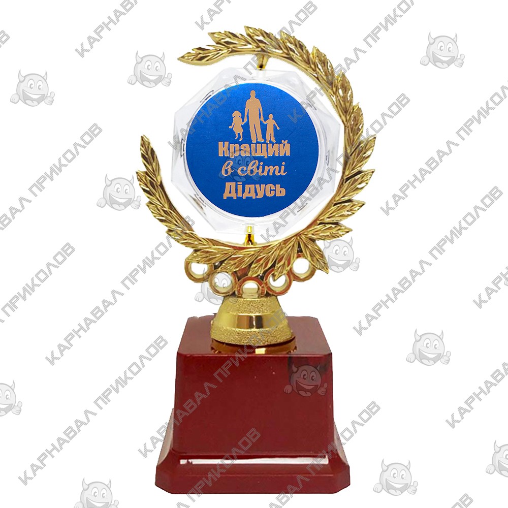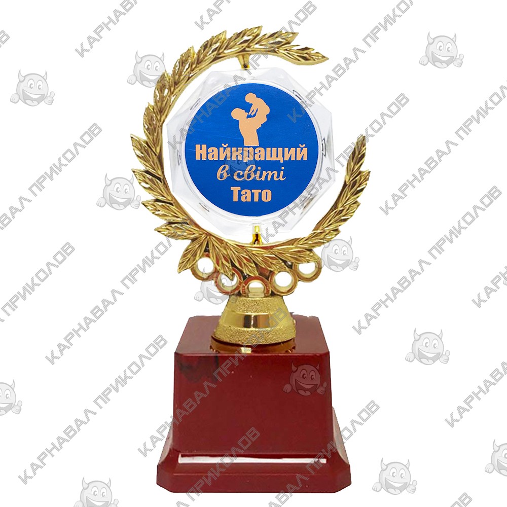 Подарункова статуетка Найкращий у світі тато-кращий у світі дідусь виконана у вигляді вінка з лаврового листя з пластику з покриттям під золото, всередині якого розташований прозорий кристал на стійкій підставці. Кристал крутиться навколо своєї осі на 365 градусів. Жетон з написом Найкращий у світі тато з одного боку кристала і Кращий у світі дід - з іншого. Статуетка упаковується в індивідуальний тубус з прозорого пластику. Унікальне пакування розроблене компанією Карнавал Приколів. На бордовому п'єдесталі статуетки може бути присутня імітація мармурових розлучень. Коли ми маємо відсвяткувати якусь торжество чи особливу подію, ми починаємо заздалегідь обмірковувати і розмірковувати - як же її зробити веселим, задерикуваним і незвичайним? Та й взагалі, одним словом, всі наші зусилля та ідеї націлені на те, щоб цей день, і це свято, став незабутнім днем, насичений оригінальністю і сповнений несподіванок. Абсолютно будь-яке свято та будь-яке свято придатне до різноманітних розіграшів, конкурсів, веселих номінацій та церемоній, таке можна організувати як на корпоративні заходи з колегами, так і на день народження, новий рік, 14 жовтня, іменини та інші свята. Ну а як же обійдеться ваша церемонія та номінація, без різних кубків, медалей, дипломів та іншої нагороди? З ними призами, це буде не тільки унікально та оригінально, це буде дуже цікаво, адже не лише спортсмени та уславлені особи можуть приймати нагороди. Поряд з нами щодня перебувають люди, які не менше заслуговують на вашу повагу і гідних винагород, тому ви без проблем зможете приділити увагу вашим близьким і піднести їм заслуженою довгим часом і справжніми зусиллями - нагороду.