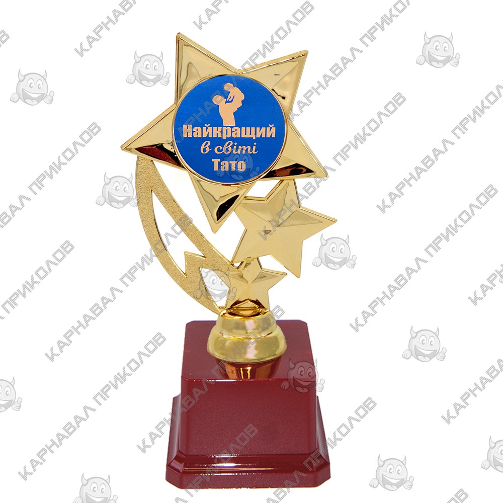 Статуетка 57227Т Найкращий у світі тато Зірковий політ – відмінний та оригінальний сюрприз, її можна подарувати Батькові на ювілей, а можна на день народження або просто як презент разом з якимсь подарунком. Подарунок символічний і незвичайний, який говорить як дорогий для Вас вітається! Статуетку виконано у вигляді 3D композиції зіркового польоту, всередині якої напис українською мовою. Фігурка виконана золотим кольором на класичному бордовому п'єдесталі. Статуетка упаковується в індивідуальний тубус з прозорого пластику. Унікальне пакування розроблене компанією Карнавал Приколів. На бордовому п'єдесталі статуетки може бути присутня імітація мармурових розлучень. Оригінальні нагороди та призи в наявності та на замовлення – відмінна ціна. Великий вибір кубків, медалей та нагородних статуеток для будь-якого приводу в інтернет магазині Карнавал Приколів.