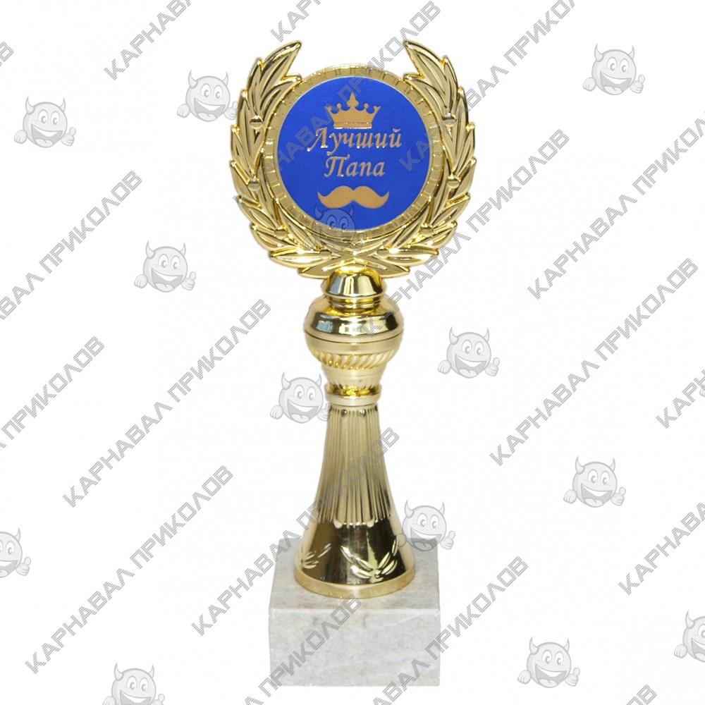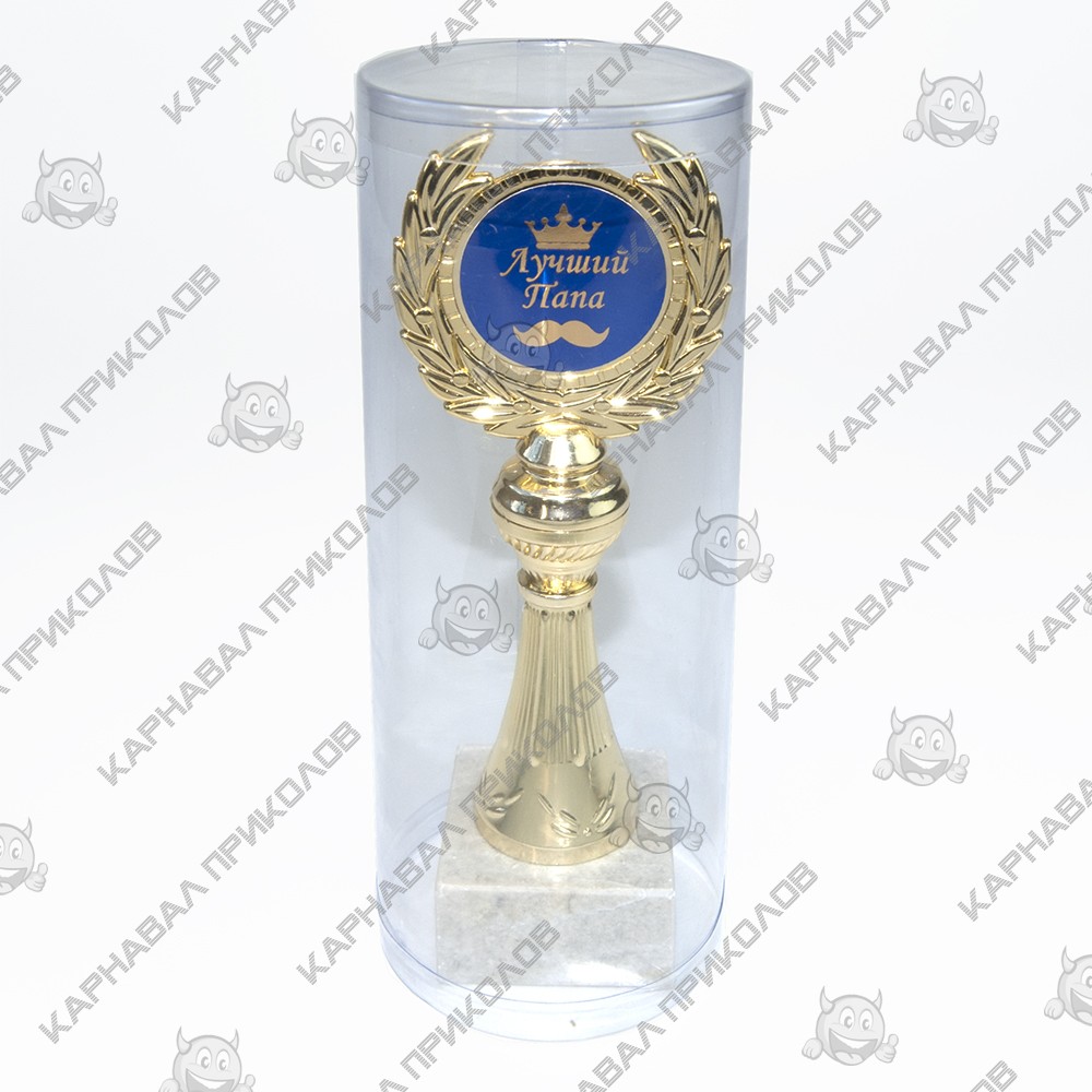 Статуетка 57229Т Кращий тато Лавровий Вінок - фігурка виготовлена з пластику благородного золотого кольору розміром 19х8х4см на підставці з натурального каменю 6х6х3см. На статуетці розташовується жетон з щільного картону синього насиченого кольору діаметром 5 см з золотим тисненим написом Кращий тато. Відмінна та оригінальна нагорода, яку можна подарувати Батькові на ювілей, на день народження або просто як презент разом з будь-яким подарунком. Подарунок символічний і незвичайний, який говорить як дорогий для Вас вітається! Статуетка упаковується в індивідуальний тубус з прозорого пластику. Унікальне пакування розроблене компанією Карнавал Приколів. Подарункову статуетку Найкращий тато можна доповнити табличкою золотого кольору для п'єдесталу Кубків та Статуеток, з нанесенням індивідуального тексту привітання чи побажань (текст наноситься чорним кольором). А також в інтернет-магазині Карнавал Приколів Ви можете купити оригінальні нагороди та призи в наявності та на замовлення. Великий вибір кубків, медалей та нагородних статуеток для будь-якого приводу.