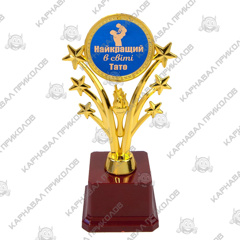 Статуетка 57227Т Найкращий у світі тато Зірковий салют – відмінний та оригінальний сюрприз, її можна подарувати Батькові на ювілей, а можна на день народження або просто як презент разом з якимсь подарунком. Подарунок символічний і незвичайний, який говорить як дорогий для Вас вітається! Нагородна статуетка виготовлена з пластику, фігурка, у вигляді зоряного салюту, висотою 14см, шириною 10см і довжиною 1см покрита благородним золотим кольором, на бордовому п'єдесталі 6х6х5см. Статуетка упаковується в індивідуальний тубус з прозорого пластику. Унікальне впакування розроблене компанією Карнавал Приколів. На бордовому п'єдесталі статуетки може бути присутня імітація мармурових розлучень. Подарункову статуетку із золотим тисненим написом Найкращий у світі тато на синьому тлі, можна доповнити табличкою золотого кольору для п'єдесталу Кубків та Статуеток, з нанесенням індивідуального тексту привітання чи побажань. Статуетка виконана у вигляді 3D композиції зіркового польоту, всередині якої напис на Оригінальні нагороди та призи в наявності та на замовлення – відмінна ціна. Великий вибір кубків, медалей та нагородних статуеток для будь-якого приводу в інтернет магазині Карнавал Приколів.