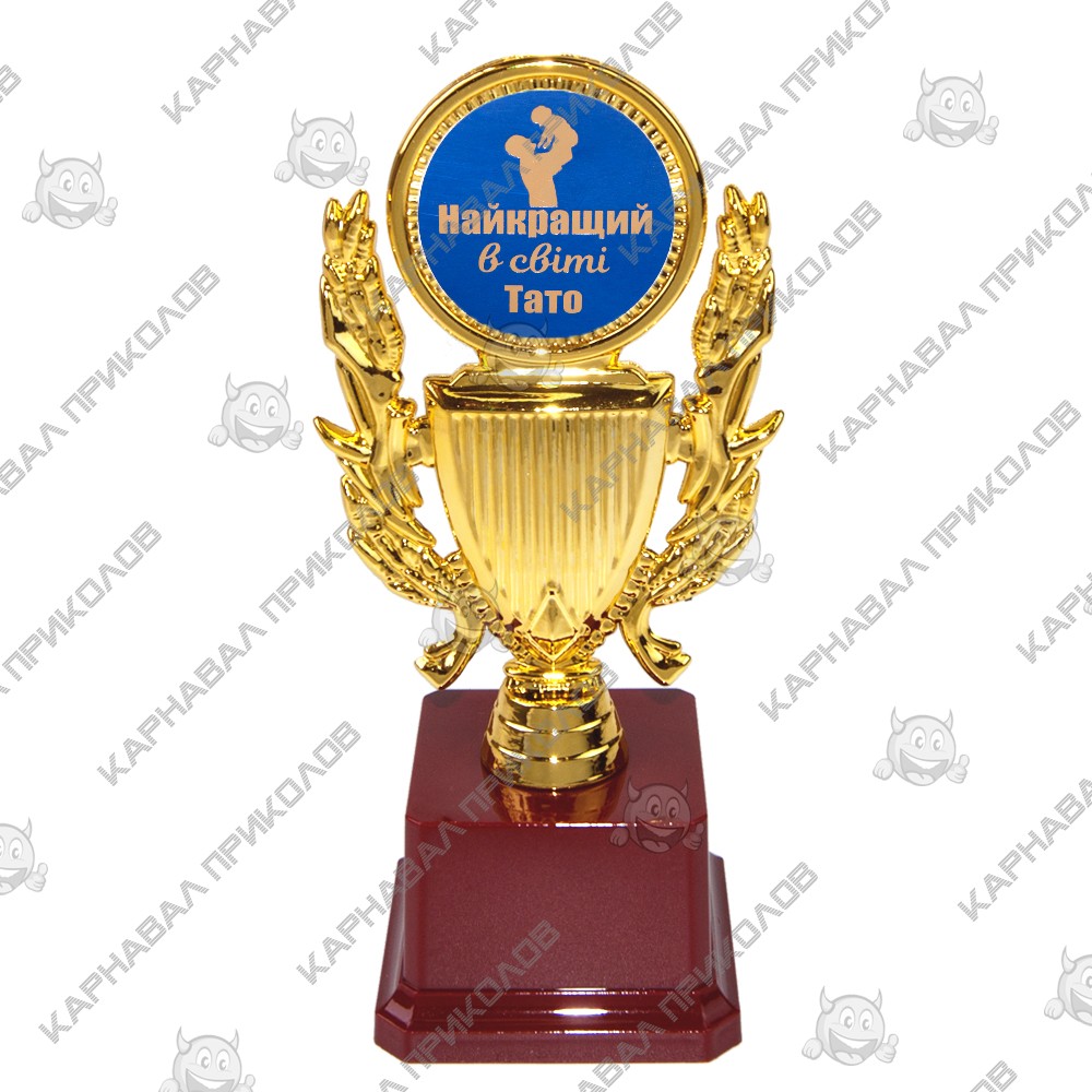 Статуетка 57232Т Найкращий в світі тато Кубок з вінком - відмінний та оригінальний сюрприз, її можна подарувати Батькові на ювілей, а можна на день народження або просто як презент разом з якимсь подарунком. Подарунок символічний і незвичайний, який говорить як дорогий для Вас людина, що вітається! Статуетку виконано у вигляді 3D композиції кубка з лавровим вінком, усередині якої напис українською мовою. Фігурка виконана золотим кольором на класичному бордовому п'єдесталі. Статуетка упаковується в індивідуальний тубус з прозорого пластику. Унікальне пакування розроблене компанією Карнавал Приколів. На бордовому п'єдесталі статуетки може бути присутня імітація мармурових розлучень. Оригінальні нагороди та призи в наявності та на замовлення – відмінна ціна. Великий вибір кубків, медалей та нагородних статуеток для будь-якого приводу в інтернет магазині Карнавал Приколів.