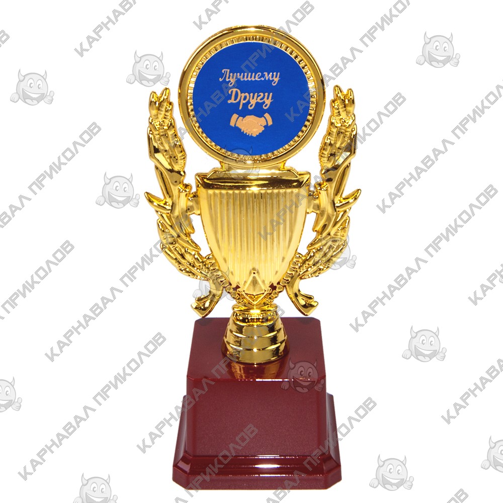 Статуетка 57285 Найкращому другу Кубок з Вінком – оригінальний подарунок на день народження або новий рік для найкращого друга. Нагородна статуетка другові виготовлена з пластику, фігурка, у вигляді кубка з лавровими лозами, висотою 14см, шириною 9см і довжиною 1см покрита благородним золотим кольором, на бордовому п'єдесталі 6х6х5см. Статуетка упаковується в індивідуальний тубус з прозорого пластику. Унікальне пакування розроблене компанією Карнавал Приколів. На бордовому п'єдесталі статуетки може бути присутня імітація мармурових розлучень. Подарункову статуетку з золотим тисненим написом Найкращому другу на синьому фоні можна доповнити табличкою золотого кольору для п'єдесталу Кубків та Статуеток, з нанесенням індивідуального тексту привітання чи побажань. Інтернет магазин товарів для свята Карнавал Приколів пропонує кубки та статуетки власного виробництва оптом та по дропшиппінгу. Ви можете оформити замовлення на сайті і задати будь-які запитання менеджеру, замовивши дзвінок.