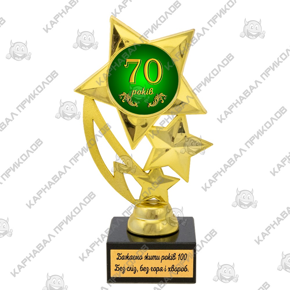 Який подарунок вибрати на ювілей? Чим порадувати зрадника у ці урочисті для нього хвилини? Як часто ми не можемо вирішити, що подарувати батькові? Яким має бути подарунок начальнику? Що вручити на ювілей другові? Відповідь проста – ювіляру потрібна статуетка! Для гарного настрою цього дня потрібні оригінальні подарунки та сувеніри, дивлячись на які ювіляр згодом усміхнеться. Статуетка подарункова (нагородна) у вигляді скупчення зірок на підставці з натурального каменю та витончений золотий напис з невеликим побажанням та вказівкою знаменної дати – справить враження і, безперечно, стане чудовим подарунком на згадку! Статуетка виконана з пластику з покриттям благородного золотистого кольору з підставкою з натурального каменю. Статуетка упаковується в індивідуальний тубус з прозорого пластику. Унікальне пакування розроблене компанією Карнавал Приколів. Наш магазин пропонує товари оптом та для дропшиперів, ви можете оформити замовлення на сайті Карнавал Приколів та задати будь-які питання, що цікавлять менеджеру, замовивши дзвінок на нашому сайті.