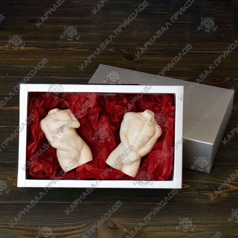 У набір входить два мила у формі Жіночого (95г) та Чоловічого силуету (100г) у подарунковій упаковці, ароматизоване |