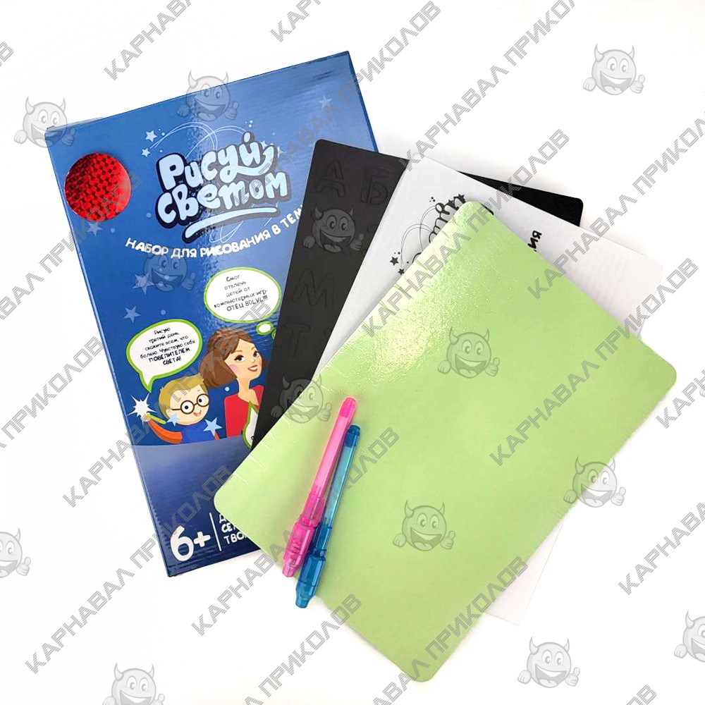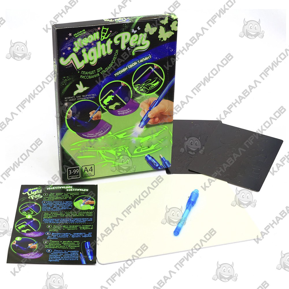 Шукайте цікавий подарунок для дитини? Унікальний світловий набір Малюй світлом Neon Light pen чудовий подарунок, який надовго займе як будь-яку дитину! Він також підійде для спільної творчості дітей та батьків. Світловий планшет є фотолюмінісцентним ПВХ матеріалом, який швидко накопичує світло ручки ліхтарика і потім тривалий час світиться в темряві, поступово згасаючи. Подаруйте дитині трохи магії та чарівництва – малюйте та насолоджуйтесь дивовижними картинами. Малювати на планшеті можна і при світлі, а вимкнувши світло насолоджуватися яскравими картинами. Інтернет магазин Карнавал Приколів пропонує купити цікаві та оригінальні подарунки за доступними цінами. Ваш подарунок радуватиме свого нового власника ще дуже довго, даруючи посмішку щодня!