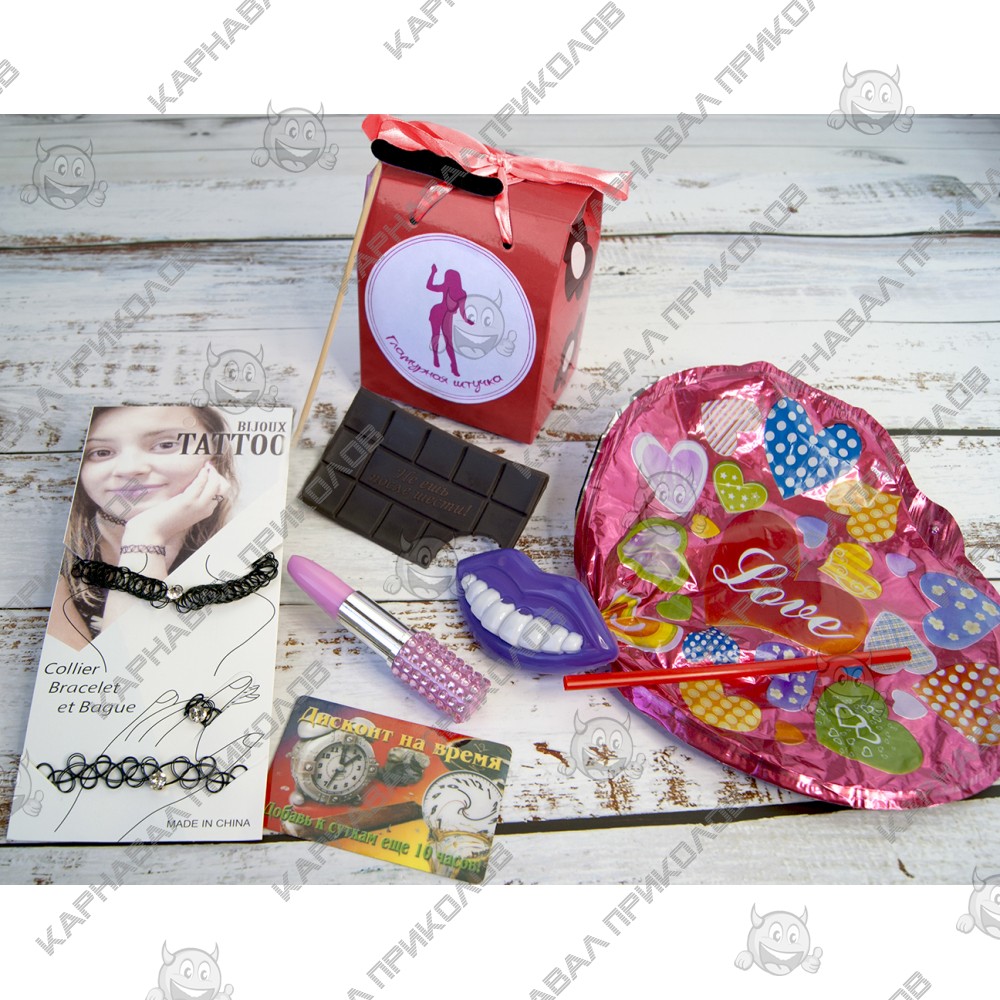 Яскравий Оригінальний подарунок Гламурна Штучка стане чудовою знахідкою у вигляді подарунка подружці. Діти люблять дарувати один одному всякі дрібнички, особливо коли є якийсь привід, як у звичайний день, без приводу, так і з нагоди дня народження чи іншої урочистості. Інтернет-магазин Карнавал Приколів пропонує купити незвичайний подарунок для шкільної подруги чи однокласниці. Також цей маленький презент можна подарувати однокласниці на День Народження. Такий дитячий набір складається з барвистої коробки з цікавими подарунками, які підкорять будь-яку дівчинку. Купивши Оригінальний подарунок Гламурна Штучка у нашому інтернет-магазині Ви отримуєте не лише якісний товар, а й 100% позитивних вражень від придбання. Серед нашого широкого асортименту товарів, Ви знайдете безліч незвичайних та оригінальних подарунків для різноманітних заходів. У набір входить: Тату чокер з стразами (кольє, браслет, кільце) - 1шт. , ручка Помада з стразами (рожева) - 1шт. , магніт Шоколадка - 1шт. , прикольна карта Дисконт на час - 1шт. , Кулька (45см) Серце з принтом - 1шт. , Фотобутафорія Вуса - 1шт. , Свисток Губи - 1шт. Колір комплектуючих може відрізнятися від кольору, вказаного на фотографії.