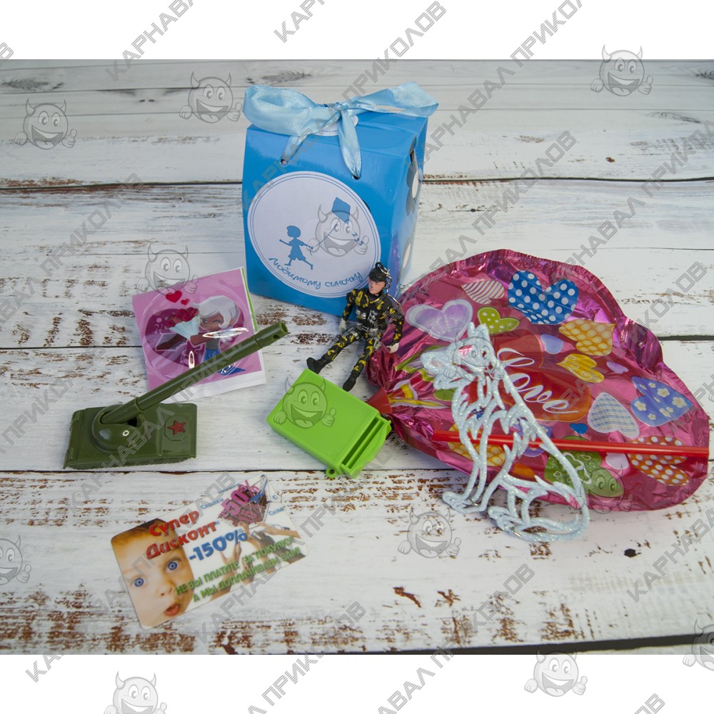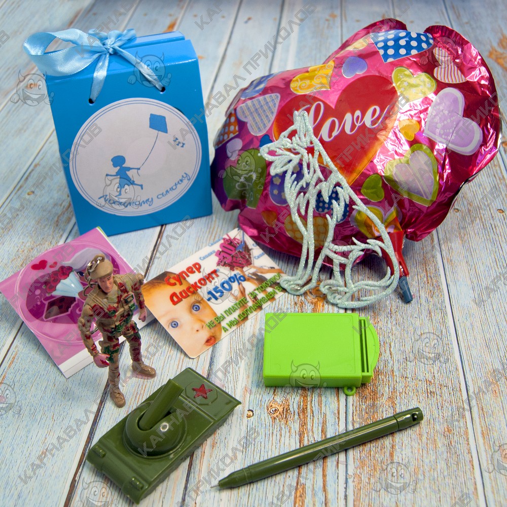 Часто буває важко придумати незвичайний подарунок своєму синочку, особливо коли бажання порадувати його просто так, без особливого приводу. Як тільки у Вас виникне така проблема, наш інтернет-магазин Карнавал Приколів допоможе з рішенням. У нас Ви знайдете велику різноманітність товарів, одним з яких є цей оригінальний тематичний подарунок Улюбленому синочку. Такий дитячий набір складається з барвистої коробки з цікавими подарунками, які підкорять будь-якого синочка. Купивши Подарунок дитячий 67 2 Улюбленому синочку в нашому інтернет-магазині Ви отримуєте не тільки якісний товар, а й 100% позитивних вражень від придбання. Серед нашого широкого асортименту товарів, Ви знайдете безліч незвичайних та оригінальних подарунків для різноманітних заходів. У набір входить: Прикольна карта Супер Дисконт – 1 шт, Ручка Танк – 1шт. , Брелок Солдатик – 1шт. , Фокус з монетою – 1шт. , Прикраса Собака Вівчарка пластик 12х9см (блакитний) – 1шт. Кулька з паличкою (2 см) Серце з малюнком – 1шт. Колір комплектуючих може відрізнятися від кольору, вказаного на фотографії.