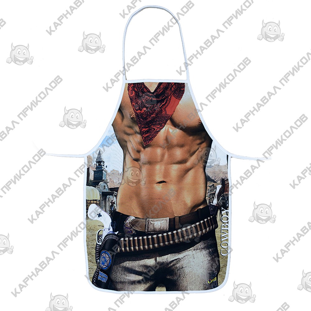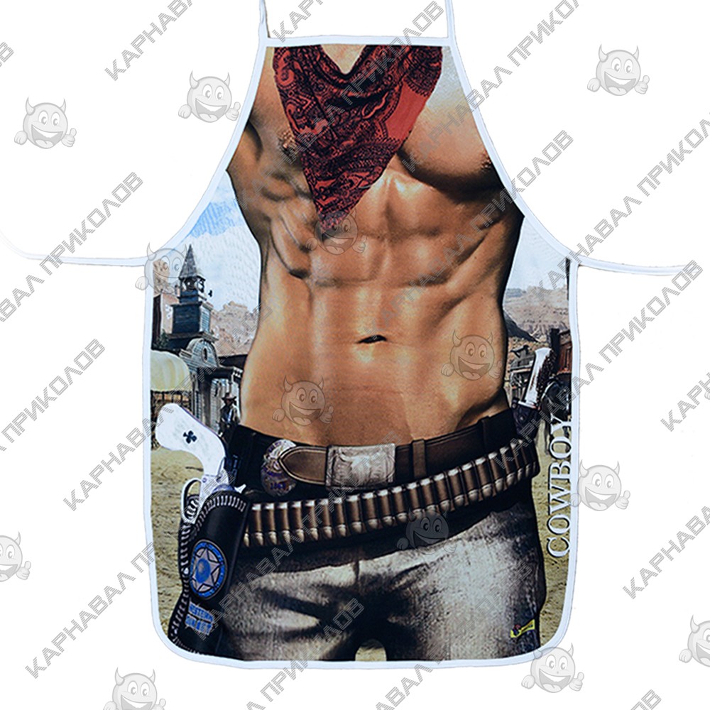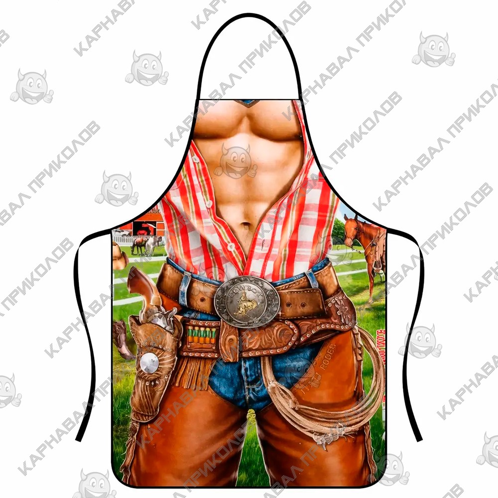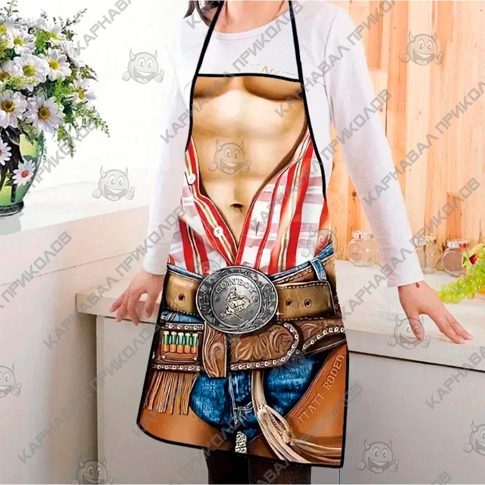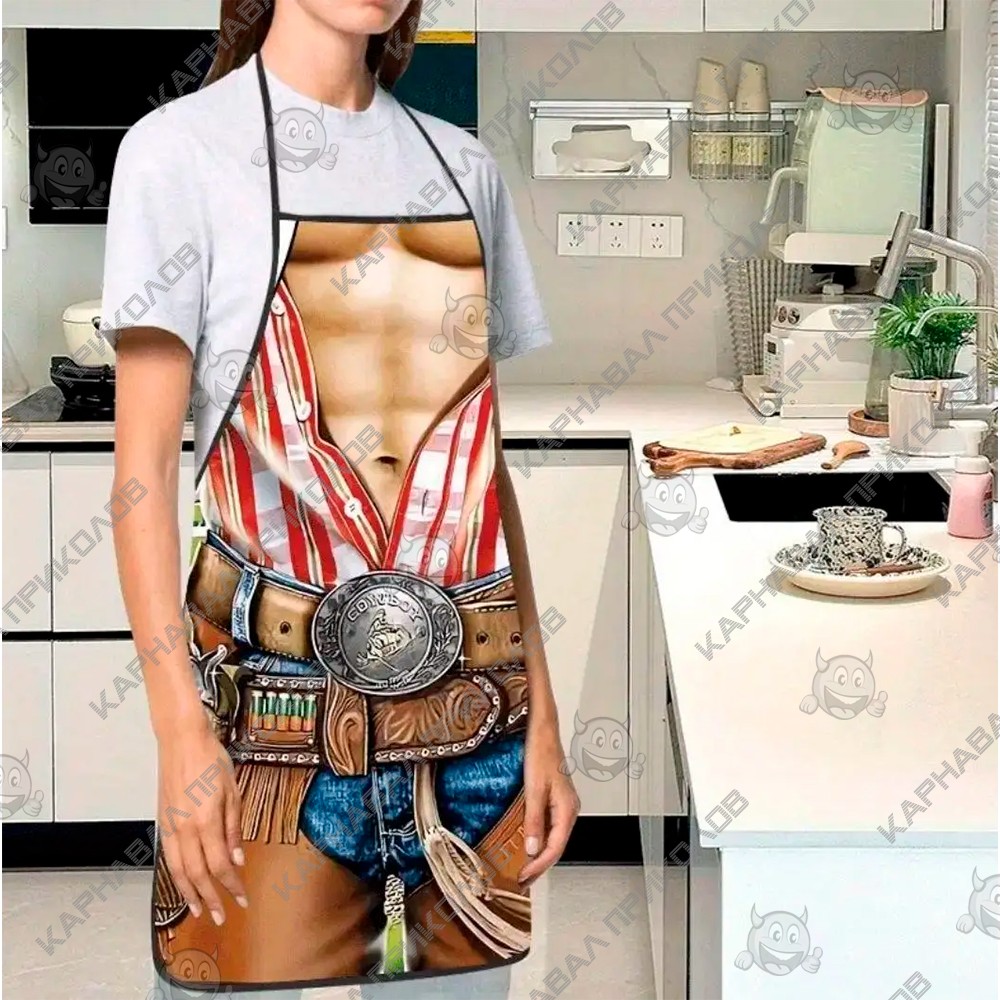 Чи готові до кулінарної дуелі? З цим фартухом будь-який чоловік миттєво перетворюється на брутального підкорювача прерій, не відходячи від плити чи мангалу. Дизайн моделі детально відтворює образ класичного ковбоя з голлівудських вестернів, додаючи володарю атлетичну стать та рішучий вигляд. На фартуху зображений м'язистий чоловічий прес, що ледь прикритий розстебнутою картатою сорочкою. Це створює комічний, але при цьому вражаючий контраст, який гарантовано викликає посмішки оточуючих. Принт майстерно передає фактуру шкіряного ременя з масивною ковбойською пряжкою, патронташ і, звичайно ж, вірний револьвер у кобурі на стегні. На задньому фоні видніється типовий краєвид ранчо з кіньми, що завершує атмосферу вестерну. Завдяки якісному друку, складки на сорочці та блиску металевої пряжки виглядають максимально реалістично, створюючи повноцінний ефект маскарадного костюма. Де цей нагоді прикольний фартух? Барбекю-паті – це законна територія ковбоїв! Смажити стейки в такому вбранні - означає заявити про себе як справжній шериф кухні. Ідеальний варіант для вечірок у стилі Кантрі або Вестерн, де потрібно виглядати яскраво, але при цьому почуватися комфортно. Шикарний сюрприз для чоловіка, котрий цінує оригінальні речі. Це чудовий спосіб підняти настрій чоловікові, братові чи другу, натякнувши на його внутрішню силу та харизму. Фартух із приколом Вестерн Ковбой - це аксесуар, який дарує не просто захист одягу, а впевненість у власній чарівності, а й порцію здорового сміху на додачу.