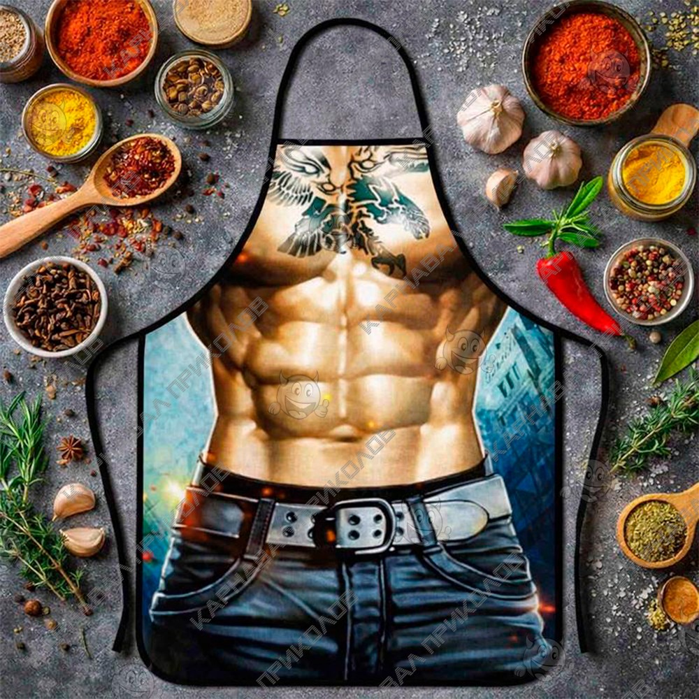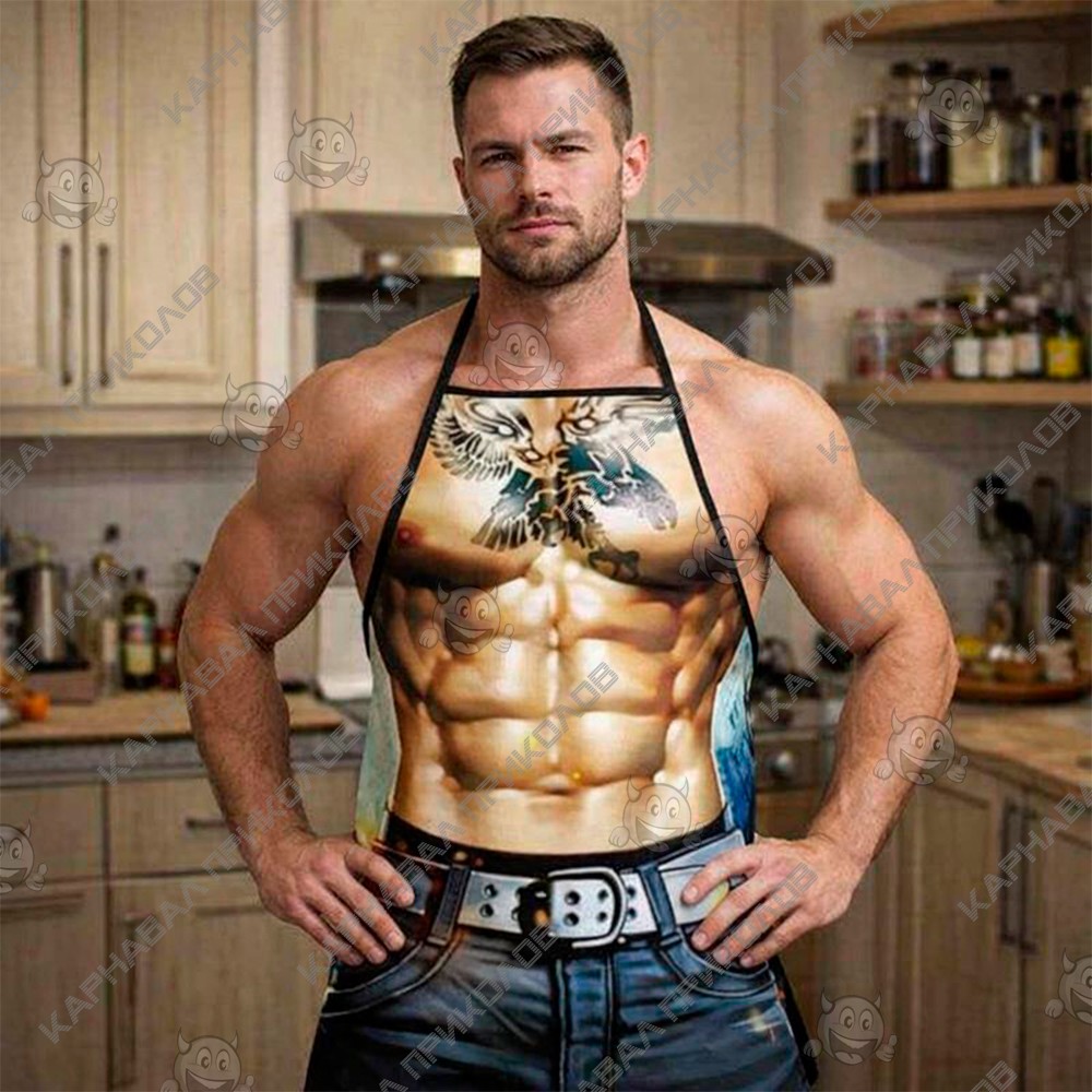 Чи готові додати трохи рок-н-ролу на вашу кухню? Фартух з приколом Мачо з тату - це вибухова суміш атлетичної статури та ефектного боді-арту. Цей аксесуар створений для чоловіків, які не бояться самовираження та знають, що найкращий маринад для шашлику – це харизма, приправлена здоровою порцією гумору. Головна фішка моделі - деталізовані татуювання в стилі реалізм та олд-скул, які покривають плечі та груди. Малюнки виглядають настільки чітко, що створюється повна ілюзія справжнього натільного живопису. Як і в класичній версії, тут зображено рельєфний чоловічий прес та розвинена мускулатура. Темні джинси з грубим ременем на принті доповнюють образ впевненого в собі чоловіка, який стежить за собою і не проти це продемонструвати. Поєднання «суворих» татуювань та невинного заняття, такого як нарізання салату або подача десерту, створює той самий іронічний ефект, який робить цей фартух хітом будь-якої вечірки. Тканина легка та приємна на дотик, а універсальний розмір з регульованими зав'язками дозволяє фартуху сісти ідеально на будь-яку фігуру. Якісний друк забезпечує реалістичність принта. Відмінний подарунок для коханого, навіть якщо в житті він носить строгий офісний костюм, на кухні він зможе відчути себе справжнім королем доріг та тату-салонів. Якщо зробити такий подарунок на річницю весілля або стосунків, то оригінально підкресліть, що чоловік все ще той самий гарячий хлопець, у якого колись закохалася наречена. Відмінний аксесуар для тематичних вечірок, ідеальний реквізит для свят у стилі Брутальний кухар чи пляжна вечірка у будь-яку пору року. Фартух з прикольним принтом Мачо з тату - це вибір для тих, хто хоче додати образу ще більше зухвалості, сучасності та поганого хлопця.