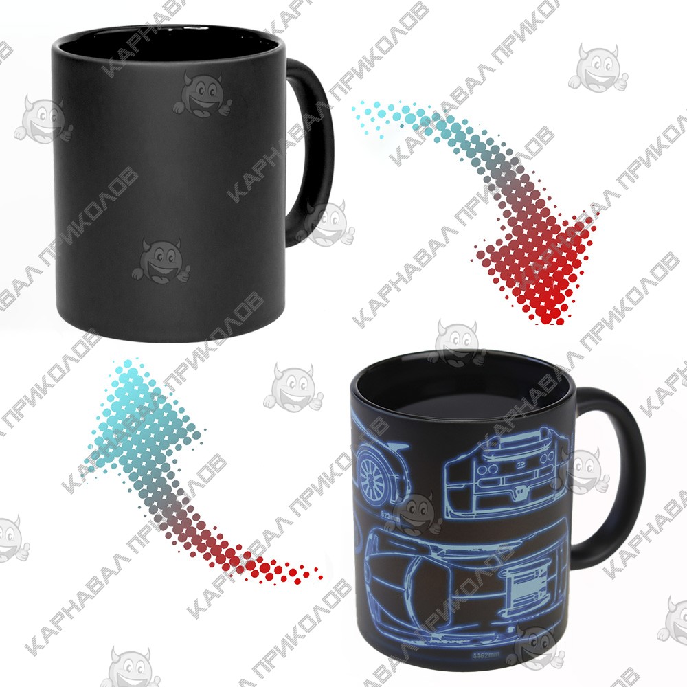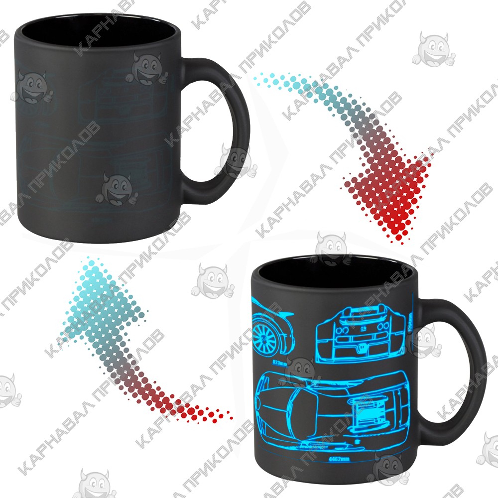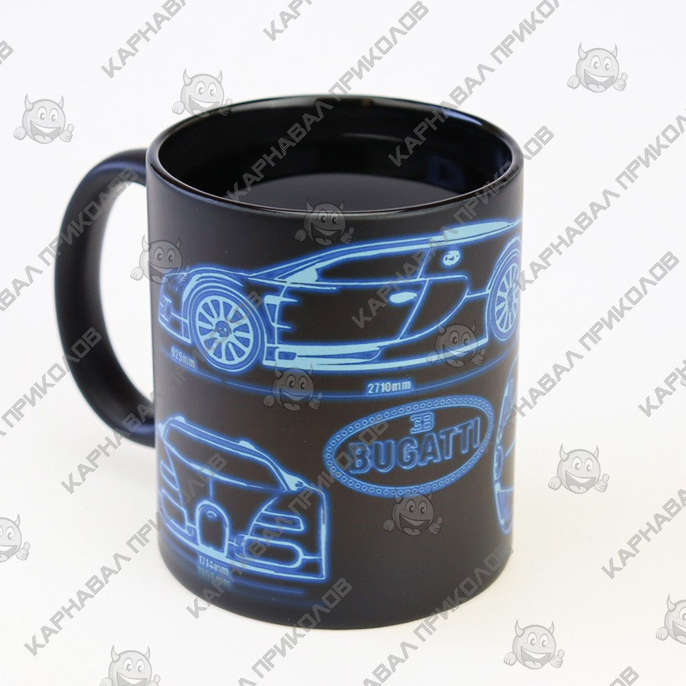Чашка хамелеон 66052 ЧРЖ Bugatti neon (чорна) на вигляд звичайна однотонна чашка, але якщо залити гарячу рідину, як на ній з'являється хитромудрий малюнок - креслення автомобіля Бугатті в неоні. Об'єм керамічної чашки 300 мл, завдяки чому, Ви можете повністю і насолодитися улюбленим напоєм. Таку чашку можна купити як кумедний і особливий подарунок автолюбителю, купити мотогонщик або просто подарувати своєму авто майстру на знак уваги. А з цією чашкою точно буде забезпечена основна увага. Чашки власного виробництва можлива на замовлення будь-яку кількість. Широкий вибір чашок та кухлів з оригінальним дизайном для будь-якого приводу Ви можете купити в інтернет магазині Карнавал Приколів.