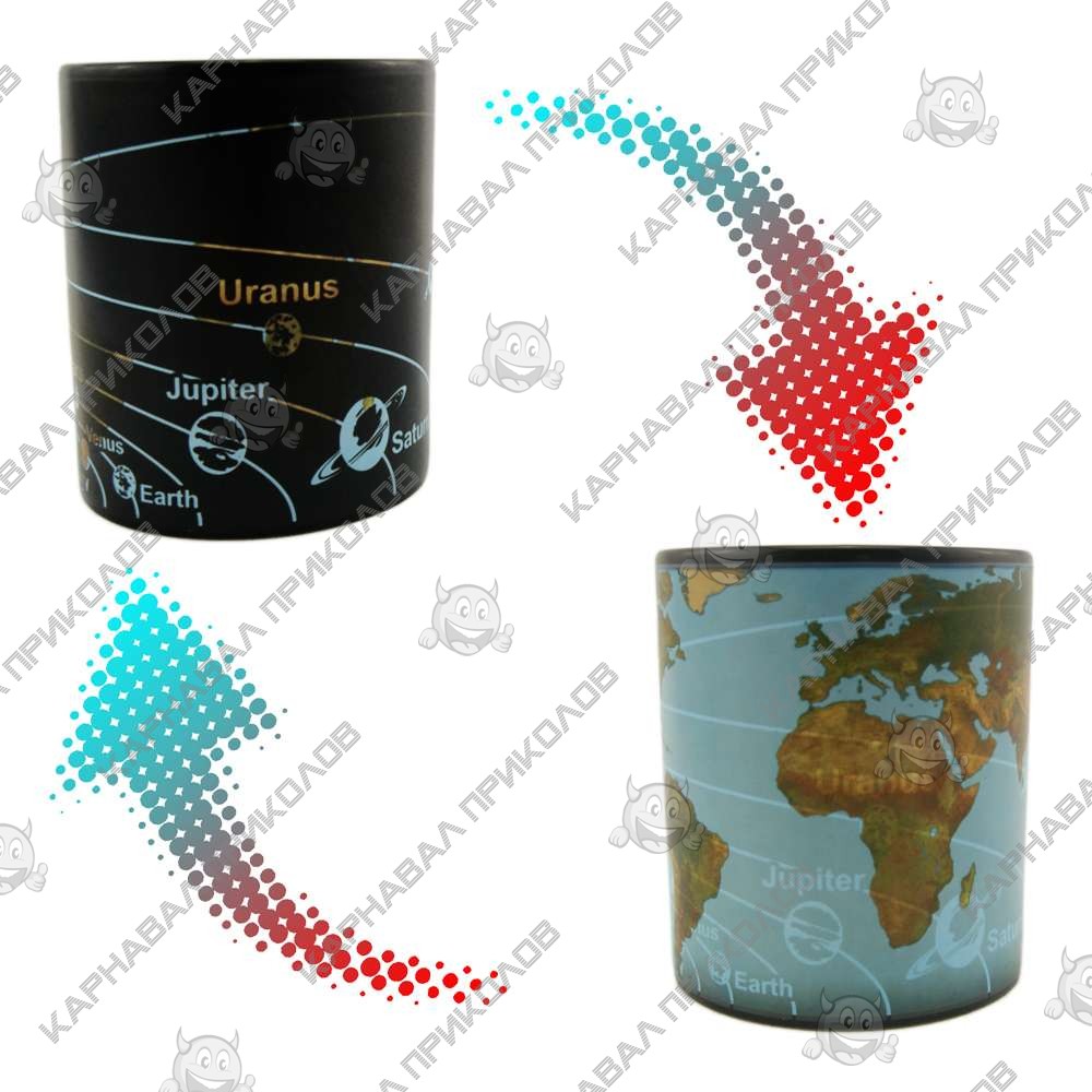Не знаєте, як поєднати приємний подарунок з корисним, щоб він був і практичним, і оригінальним? Тоді завітайте до нашого інтернет-магазину Карнавал Приколів. Тут Ви можете купити дуже незвичайну чашку-хамелеон SOLAR SYSTEM. Це не просто чашка, це чашка з особливими властивостями. Коли така незвичайна чашка стоїть порожня, то на ній зображено нашу Сонячну систему, а от коли в неї потрапляє гаряча рідина, вона починає мене свою картинку, і всі планети змінюються на карту світу, разом з усіма материками та океанами. А щоб чашка прийняла своє початкове положення, Вам потрібно буде почекати, поки вона охолоне. Таку оригінальну чашку можна подарувати Вашому другові чи подрузі, які захоплюються астрономією чи географією. Така ж чашка стане гарним подарунком для дитини. Діти навчаються в процесі гри, от і з такою чашкою, він зможе вивчити які планети існують і як вони розташовані, і карту світу теж буде дуже цікаво розглядати. З такою чашкою Ваша перерва на обід стане не тільки корисною, але й дуже захоплюючою.