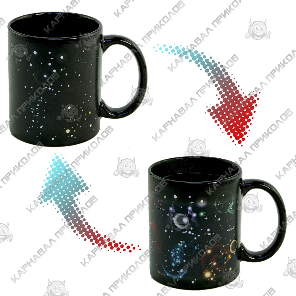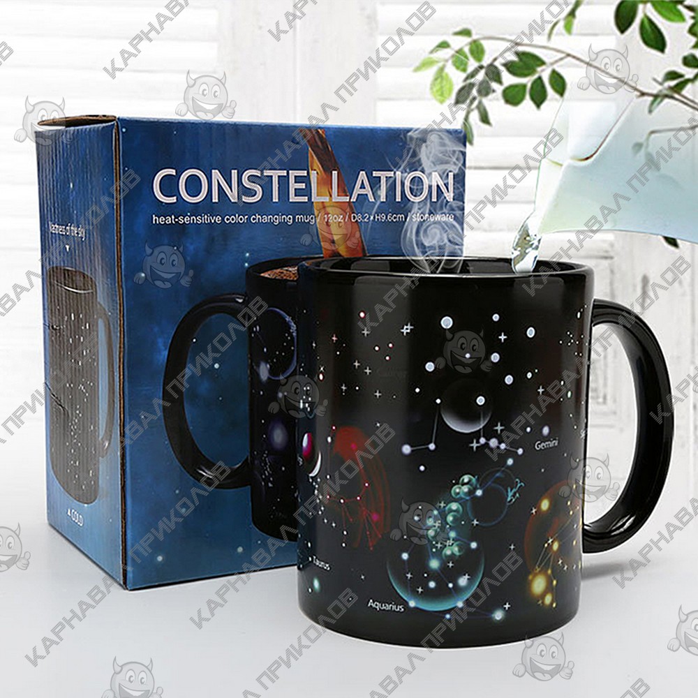 Чашка хамелеон Зіркове небо 12 Сузір'їв з приголомшливим спецефектом. Варто залити гарячий напій, як на зоряному небі з'являється безліч сузір'їв. Об'єм керамічної чашки 350 мл, завдяки чому, Ви можете повністю і насолодитися улюбленим напоєм. Таку оригінальну чашку можна подарувати другові чи подрузі, які захоплюються астрономією. Така ж чашка стане забавним подарунком для дитини. Широкий вибір чашок та кухлів з забавним дизайном для будь-якого приводу Ви можете купити в інтернет магазині Карнавал Приколів.