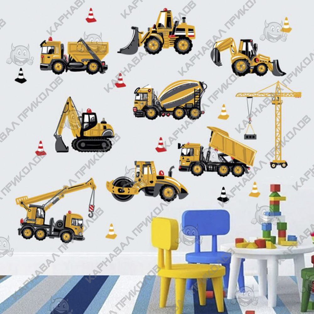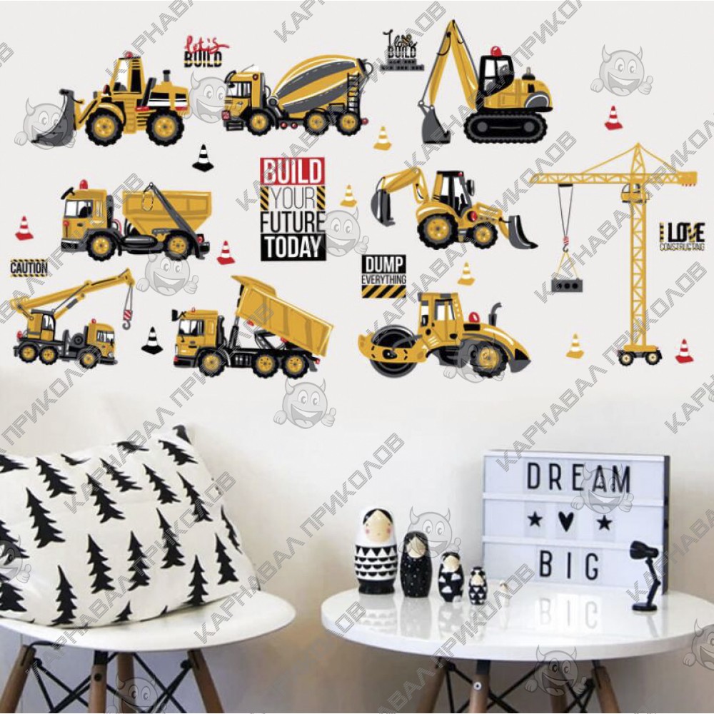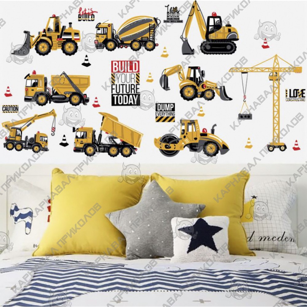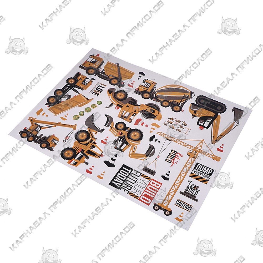 Інтер'єрна наклейка Дитяча Будівельні машини SK6076 60х45см - це швидкий спосіб класно прикрасити свій будинок. Інтернет-магазин Карнавал Приколів пропонує Вам купити інтер'єрні наклейки дитячої тематики, які ідеально підійдуть на кухню, спальню, вітальню, дитячу чи ігрову кімнату. Прикрасу на стіну оцінять діти у своїх спальнях чи ігрових кімнатах. Інтер'єрна наклейка Дитяча Будівельні Машини SK6076 60х45см з принтом 9 будівельних машин: кранів, камазов, мішалок та інших. Розмір листа з наклейками: 60х90 см. Як 3D наклейка клеїться на стіну? Спосіб поклейки дуже простий. Для початку потрібно очистити поверхню, на яку потрібно наклеїти. Після цього знімаємо плівку і переносимо малюнок на стіну або іншу площину рукою або ганчіркою. На які поверхні можна клеїти інтер'єрну наклейку? Поклейка можлива на будь-яку ІДЕАЛЬНО ГЛАДКУ ГЛЯНЦЕВУ поверхню, наприклад: стіна пофарбована глянсовою фарбою без будь-яких рельєфів (у фарбі не повинно бути крейдяного компонента), скло, дзеркало, лаковані поверхні, гладкий пластик. На шпалери клеїти НЕ МОЖНА. Доглядати стікери на стіну також досить легко, для цього необхідно лише іноді протирати їх вологою губкою або ганчіркою. Яскравість і насиченість наклейок не змінюється з часом, крім того, вони абсолютно стійкі до вологості.