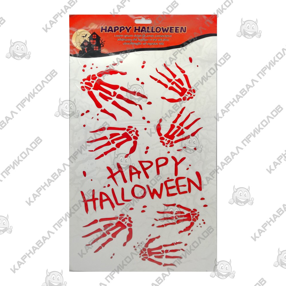Інтер'єрні наклейки HL Криваві сліди Happy Halloween 50х30см – це швидкий спосіб класно прикрасити свій будинок. Інтернет - магазин Карнавал Приколів пропонує Вам купити інтер'єрні наклейки хорор тематики, які ідеально підійдуть на кухню, спальню, вітальню. Прикраса на стіну оцінять у кімнаті страху або декара Хелловін. Як 3D наклейка клеїться на стіну? Спосіб поклейки дуже простий. Для початку потрібно очистити поверхню, на яку потрібно наклеїти. Після цього знімаємо плівку і переносимо малюнок на стіну або іншу площину рукою або ганчіркою. На які поверхні можна клеїти інтер'єрну наклейку? Поклейка можлива на будь-яку ІДЕАЛЬНО ГЛАДКУ ГЛЯНЦЕВУ поверхню, наприклад: стіна пофарбована глянсовою фарбою без будь-яких рельєфів (у фарбі не повинно бути крейдяного компонента), скло, дзеркало, лаковані поверхні, гладкий пластик. На шпалери клеїти НЕ МОЖНА. Доглядати стікери на стіну також досить легко, для цього необхідно лише іноді протирати їх вологою губкою або ганчіркою. Яскравість і насиченість наклейок не змінюється з часом, крім того, вони абсолютно стійкі до вологості.