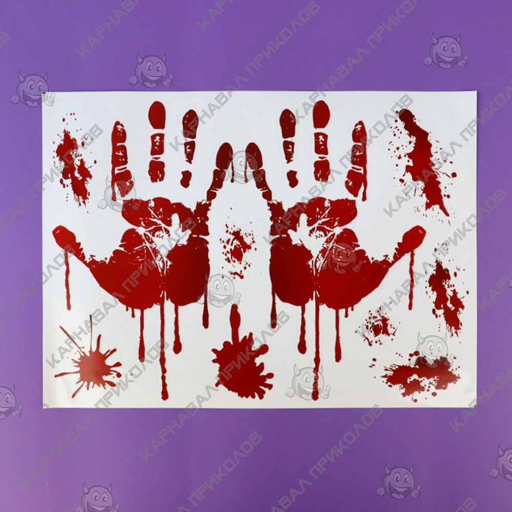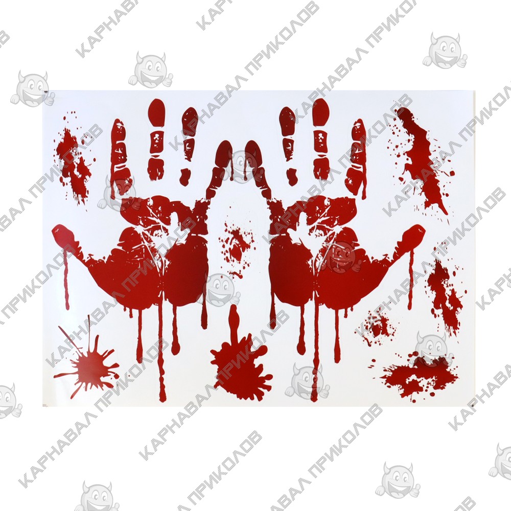 Інтер'єрна наклейка HL Криваві сліди Руки 30х45см - це швидкий спосіб класно прикрасити свій будинок. Інтернет - магазин Карнавал Приколів пропонує Вам купити інтер'єрні наклейки хорор тематики, які ідеально підійдуть на кухню, спальню, вітальню. Прикраса на стіну оцінять у кімнаті страху або декара Хелловін. Як 3D наклейка клеїться на стіну? Спосіб поклейки дуже простий. Для початку потрібно очистити поверхню, на яку потрібно наклеїти. Після цього знімаємо плівку і переносимо малюнок на стіну або іншу площину рукою або ганчіркою. На які поверхні можна клеїти інтер'єрну наклейку? Поклейка можлива на будь-яку ІДЕАЛЬНО ГЛАДКУ ГЛЯНЦЕВУ поверхню, наприклад: стіна пофарбована глянсовою фарбою без будь-яких рельєфів (у фарбі не повинно бути крейдяного компонента), скло, дзеркало, лаковані поверхні, гладкий пластик. На шпалери клеїти НЕ МОЖНА. Доглядати стікери на стіну також досить легко, для цього необхідно лише іноді протирати їх вологою губкою або ганчіркою. Яскравість і насиченість наклейок не змінюється з часом, крім того, вони абсолютно стійкі до вологості.