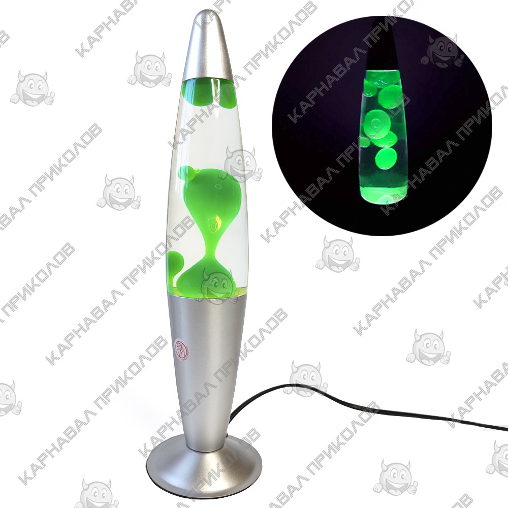 Творчим людям необхідне натхнення. І кожен знаходить його у різних речах. Якщо Ви шукаєте те, що Вас надихатиме і даватиме Вам ідеї для творчості. Інтернет-магазин Карнавал Приколів представляє Вам надзвичайно незвичайний аксесуар для Вашої кімнати або кабінету Лава лампа з парафіном (40см) зелена. Лава лампа з парафіном зелена – це дуже незвичайний світильник нічник – прекрасне джерело для Вашого натхнення. Лава лампа виконана у вигляді колби, в якій знаходиться прозора олія та кольоровий парафін зеленого кольору. Цю колбу треба помістити на підставку, в якій знаходиться лампочка, яка підсвічує і починає нагрівати парафін. Може хтось не знає, але в холодному стані парафін важчий за олію і тим самим він лежить на дні колби, а при нагріванні стає легше і починає плавати по колбі. Лампа представлена в різних кольорах. Така лампа зачаровує і навіть гіпнотизує, змушуючи дивитись на чудовий ефект. Так само якщо після довгого робочого дня Ви хочете розслабитися і просто посидіти в кріслі і відпочити, то Лава лампа зробить Ваш вечір набагато приємнішим, той ефект, який зробить лампа на Вас, дозволить Вам насолодитися відпочинком на повну. Світильник працює від розетки 220V. Для більшого терміну служби виробу час роботи розігрітої лампи не повинен перевищувати 8-10 годин. При нагріванні знизу 25 або 30-ватною лампочкою парафін починає розширюватися, нагрівшись він стає менш щільним ніж рідина в якій він знаходиться і це змушує його підніматися. Для розігріву парафіну знадобиться близько години, постійно тримати увімкнену лампу не можна. Рекомендований час роботи лампи не більше 3-4 годин на максимальній яскравості та нагріванні, після досягнення активного руху - інтенсивність нагрівання/яскравості слід зменшити, щоб забезпечити підтримку від пімальної температури. У комплектацію входить: скляна колба з парафіном і маслом (рідина безбарвна, а парафін кольоровий), пластикова підставка з шнуром живлення з реле (для регуляції інтенсивності нагрівання), що підключається в розетку і кришка, маленька лампа розжарювання.